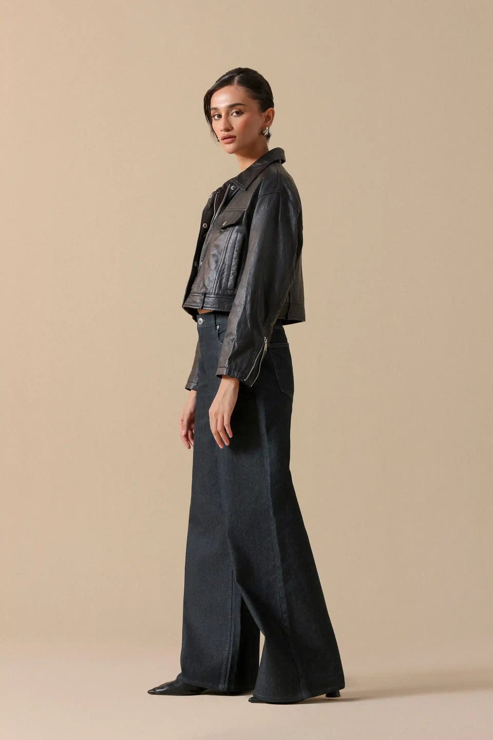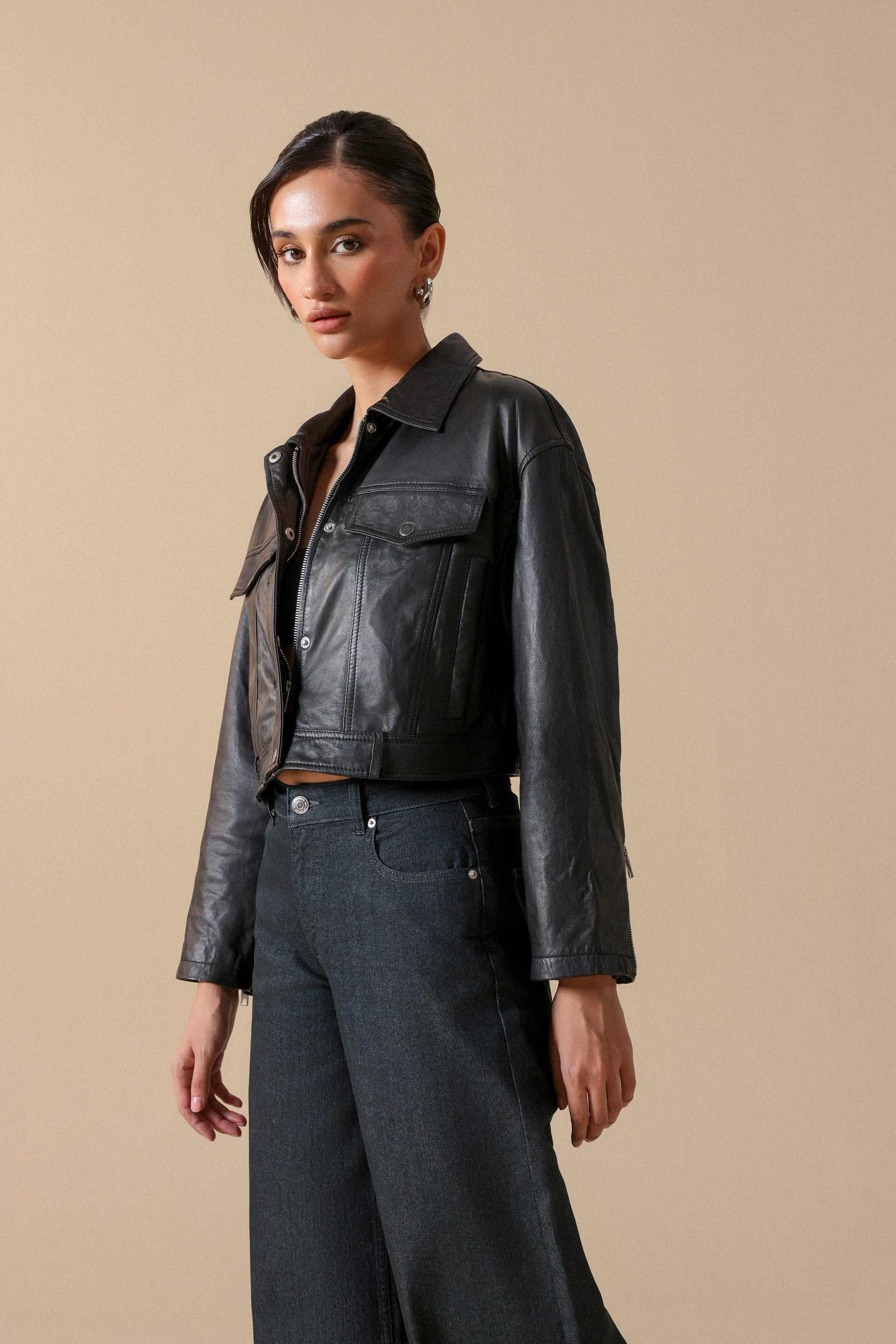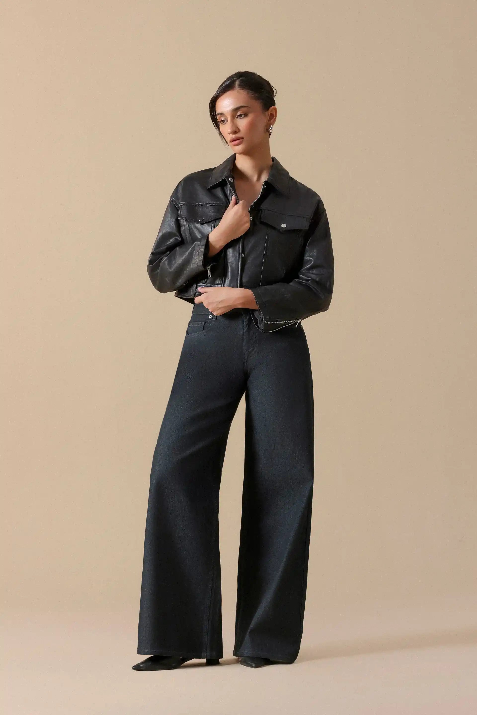 This exquisite faux leather trucker jacket is a must-have for any fashion-forward woman. Crafted with the finest materials, it exudes sophistication and elegance. The luxurious faux leather not only offers a chic look but also provides durability. Elevate your wardrobe and make a bold statement with this timeless piece.