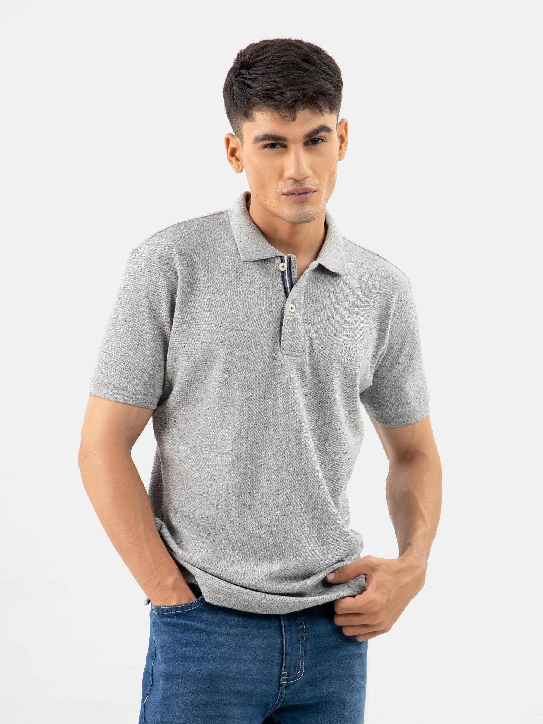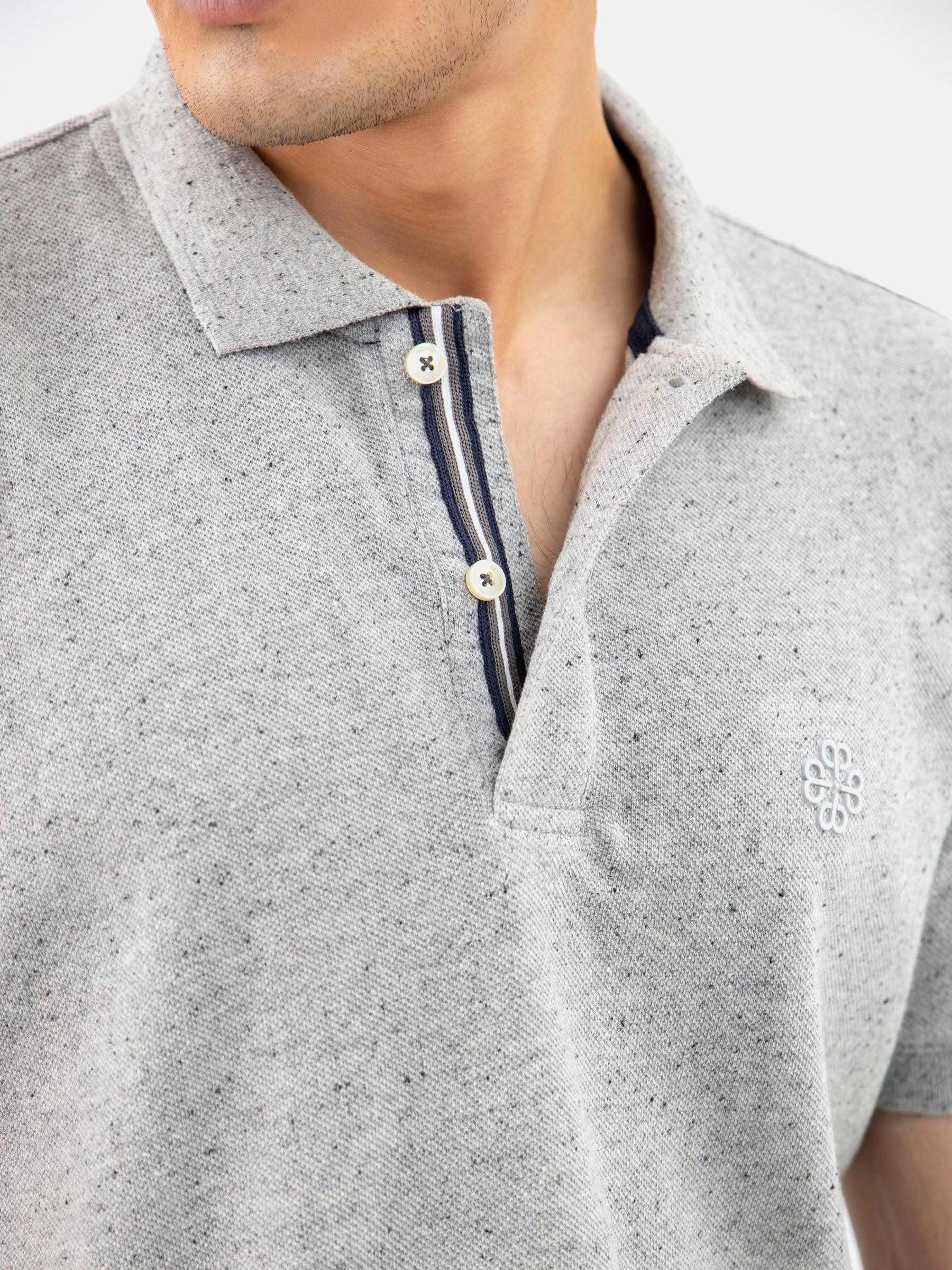 Introducing piqué fabric polo from basic collation. Made of cotton rich fabric, this grey basic polo features two-button fastening, short sleeves & inner placket detailing for contemporary look. Finished with 3d branded embellishment in front.