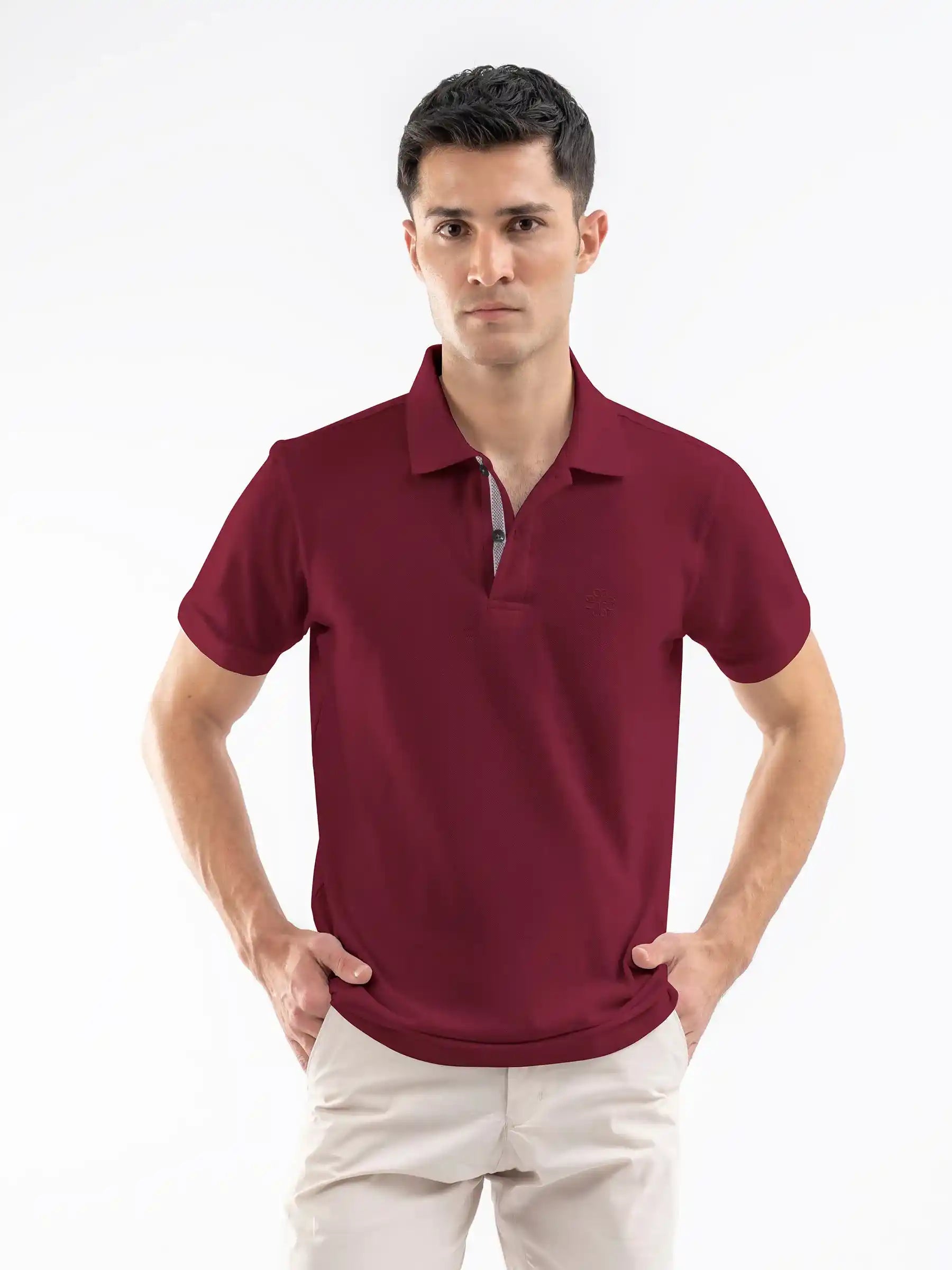 Upgrade your casual wardrobe with our mens maroon pique polo, crafted from 100% combed cotton for ultimate comfort. This versatile polo offers a timeless look with a rich mid-brown hue, perfect for any occasion. Finished with ribbed collar & jacquard patterned front placket