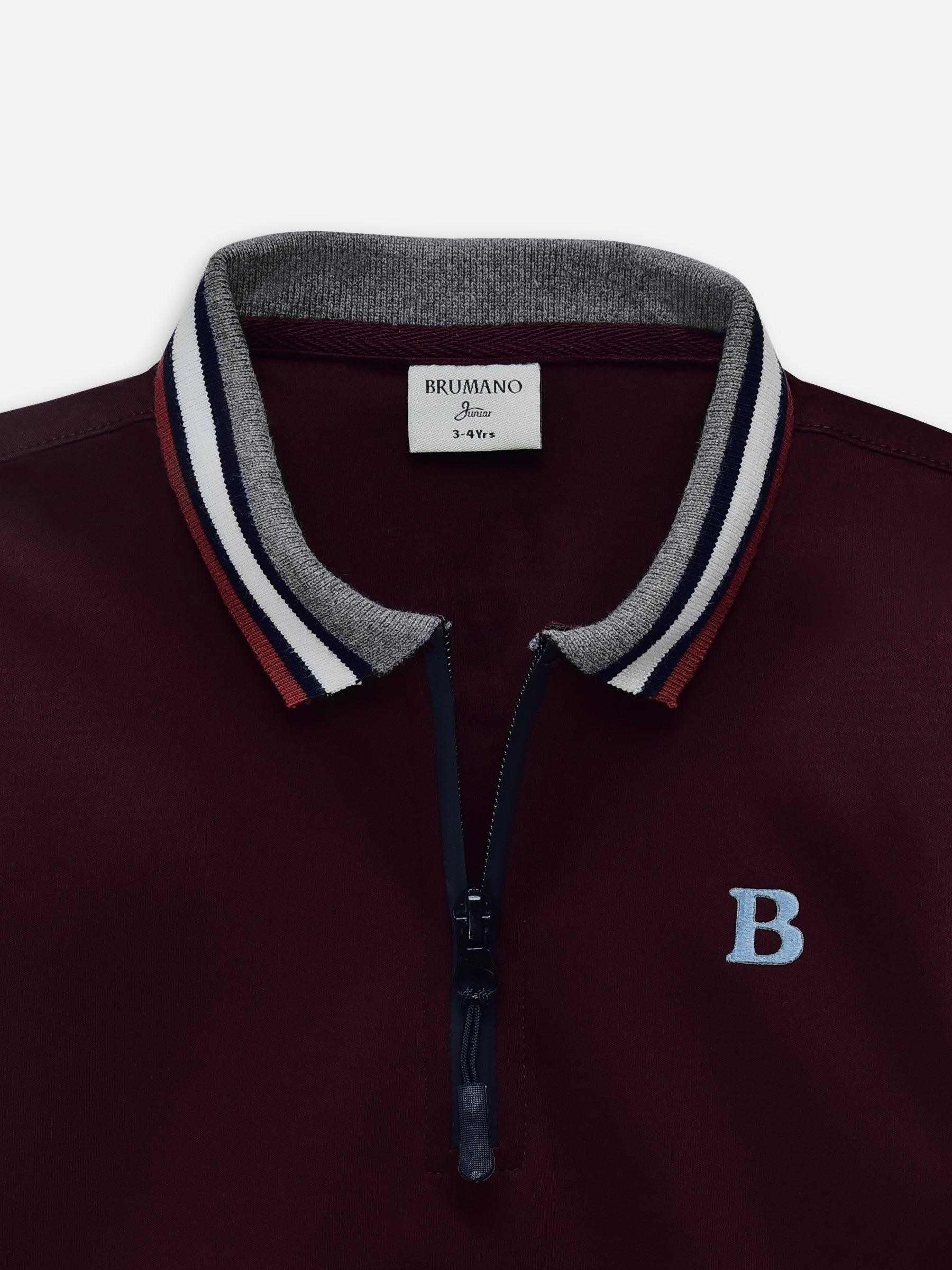 Maroon Interlock Zipper Polo With Contrasting Collar
