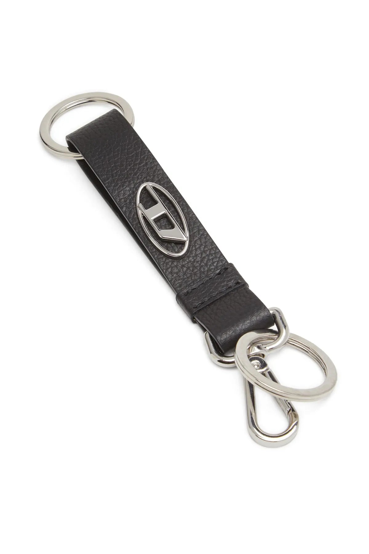 Featuring a ring on each end and a hook clasp, this men's key fob is crafted from grainy leather and embellished with a metal 'oval D' plaque.