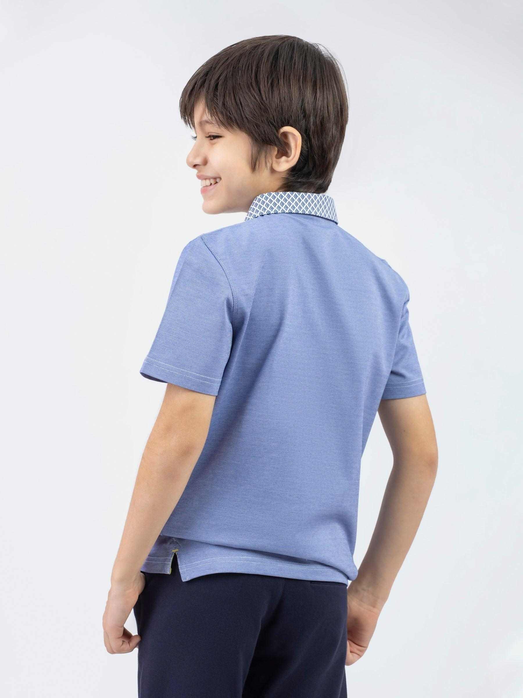 Designed for comfort, this mid blue casual polo shirt seamlessly blends sophistication with laid-back charm. Featuring printed collar for a subtle yet distinctive touch to your kids ensemble.