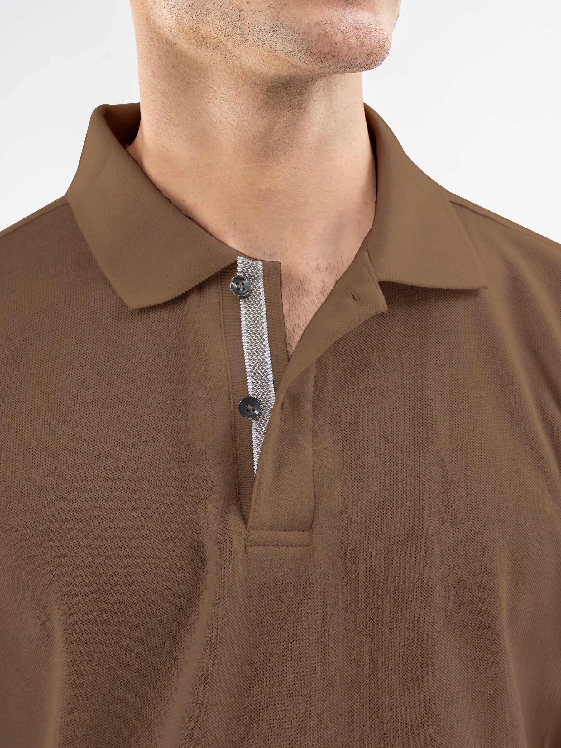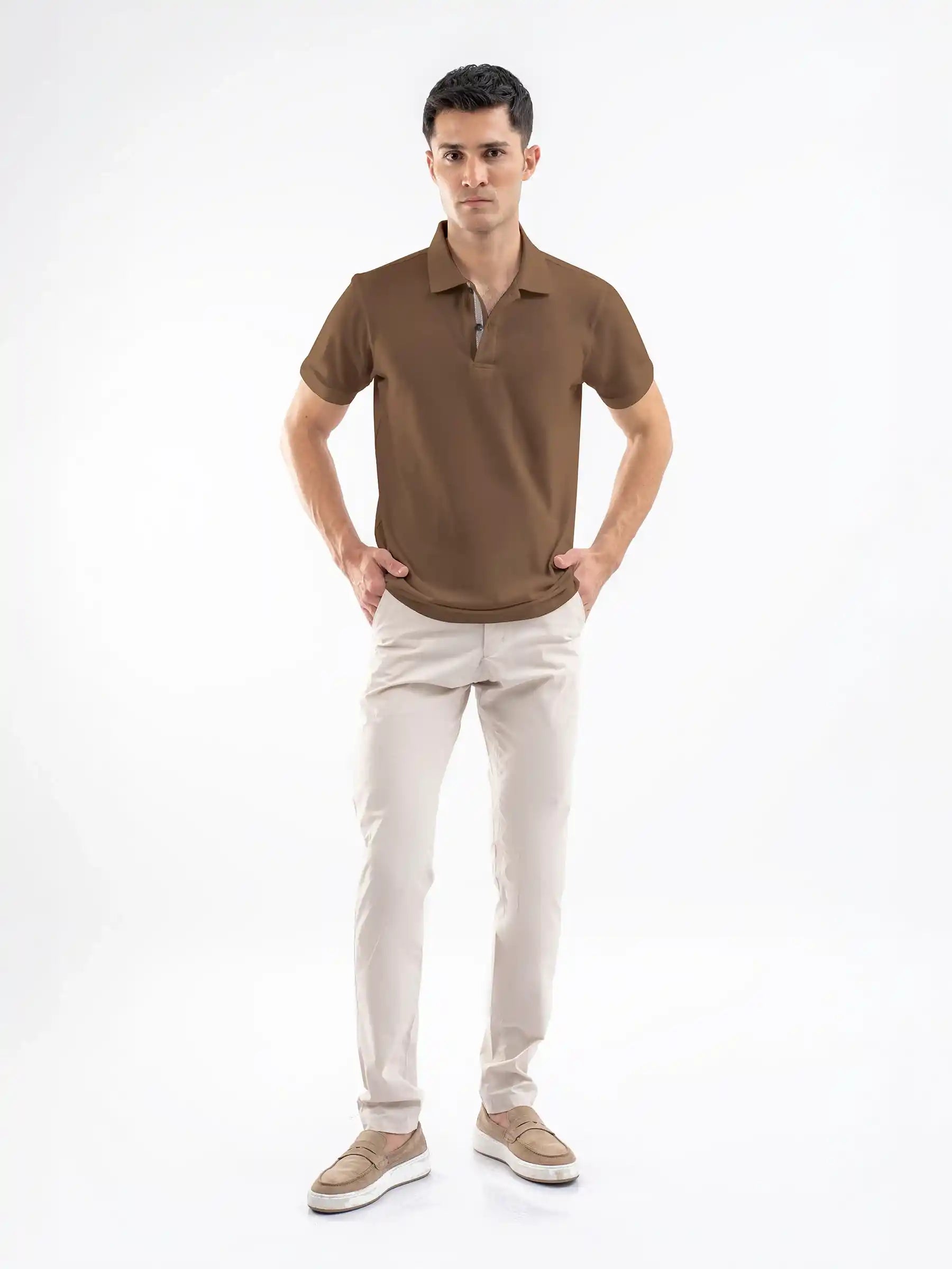 Upgrade your casual wardrobe with our mens mid brown pique polo, crafted from 100% combed cotton for ultimate comfort. This versatile polo offers a timeless look with a rich mid-brown hue, perfect for any occasion. Finished with ribbed collar & jacquard patterned front placket