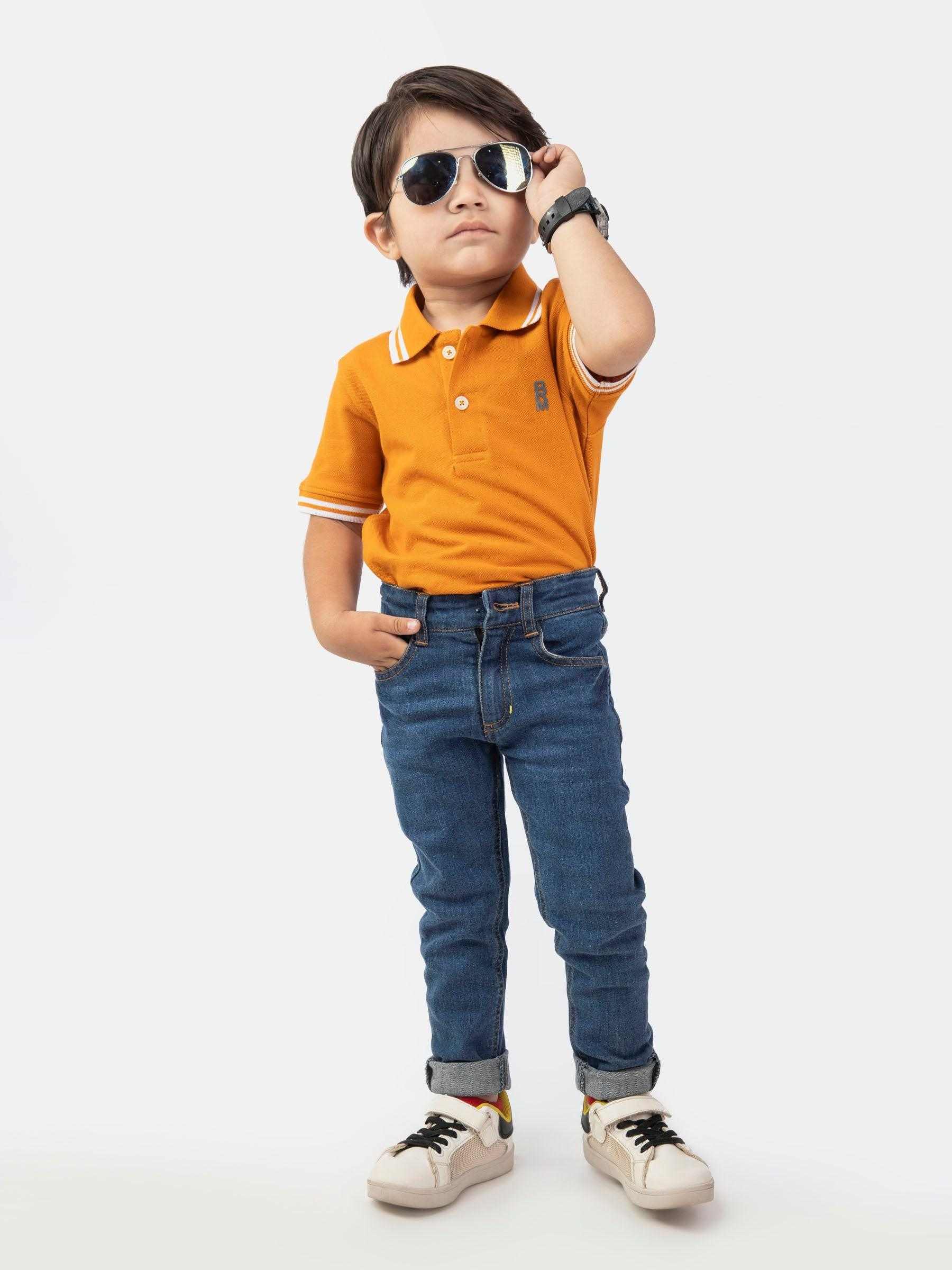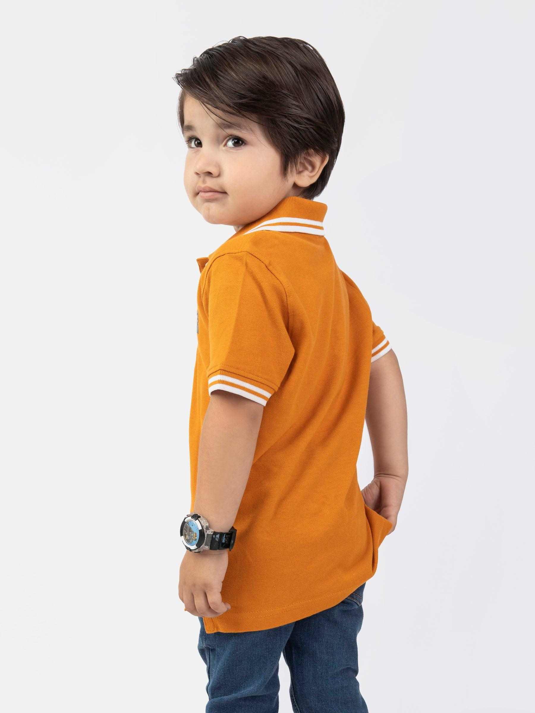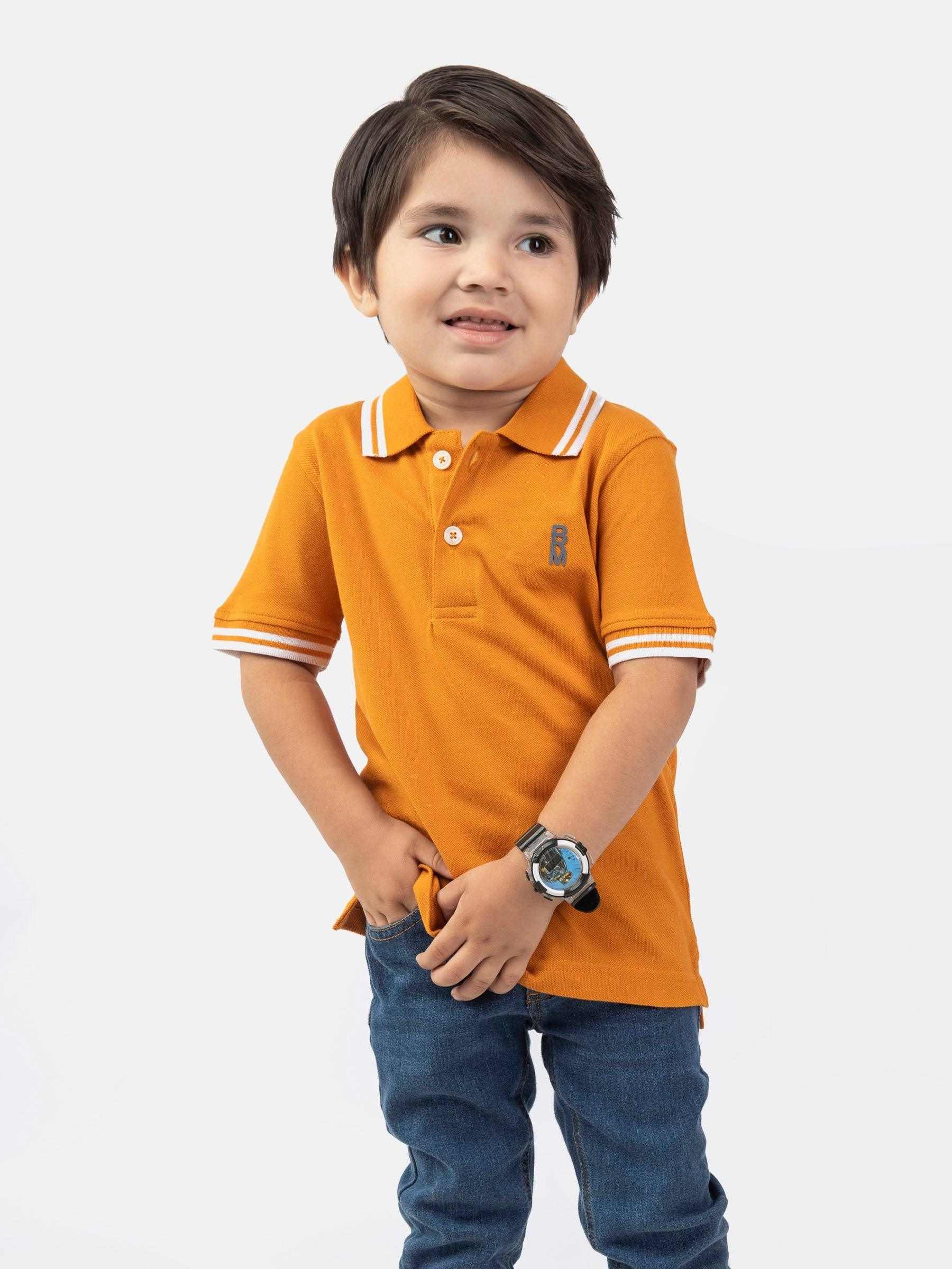 Update his wardrobe with this classic boys' mustard polo shirt featuring white tipped collar for everyday use. Made with soft pique fabric, its finished with printed logo in front to compete the look