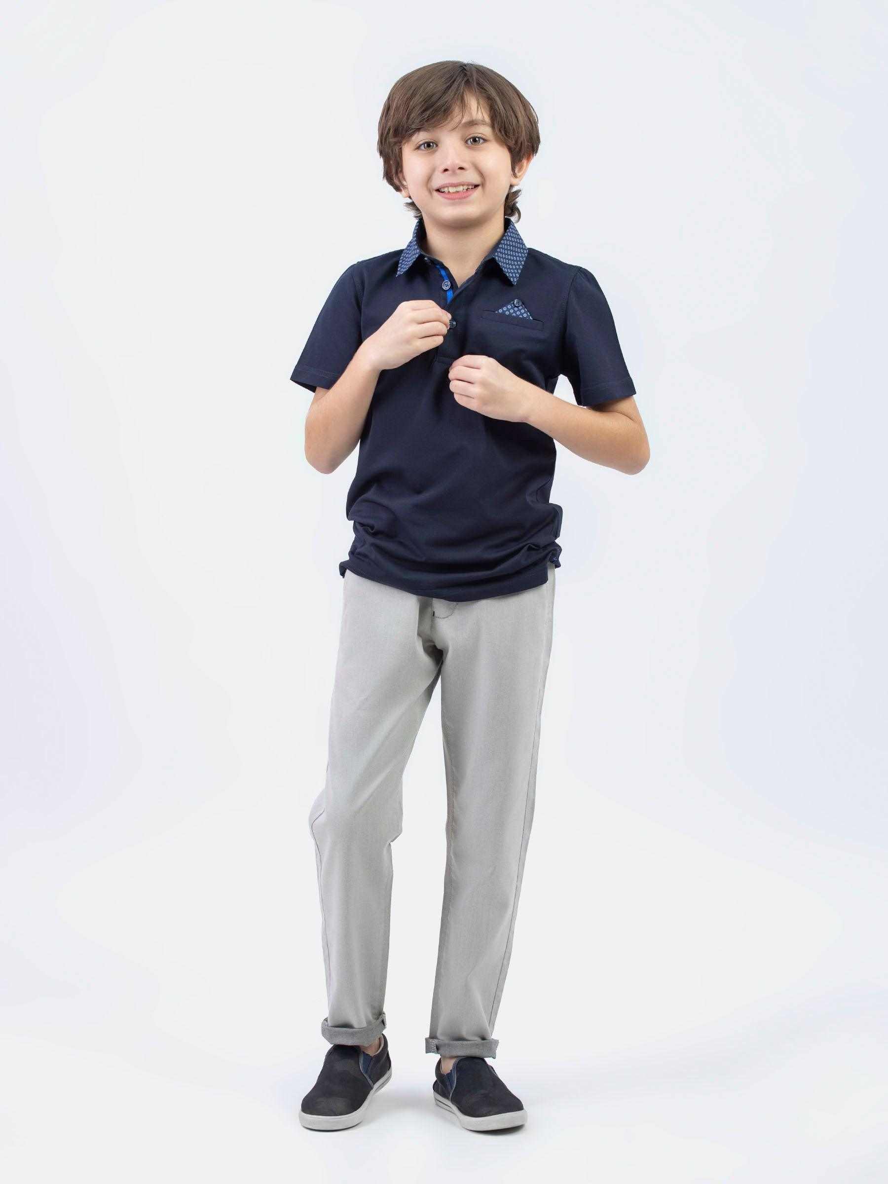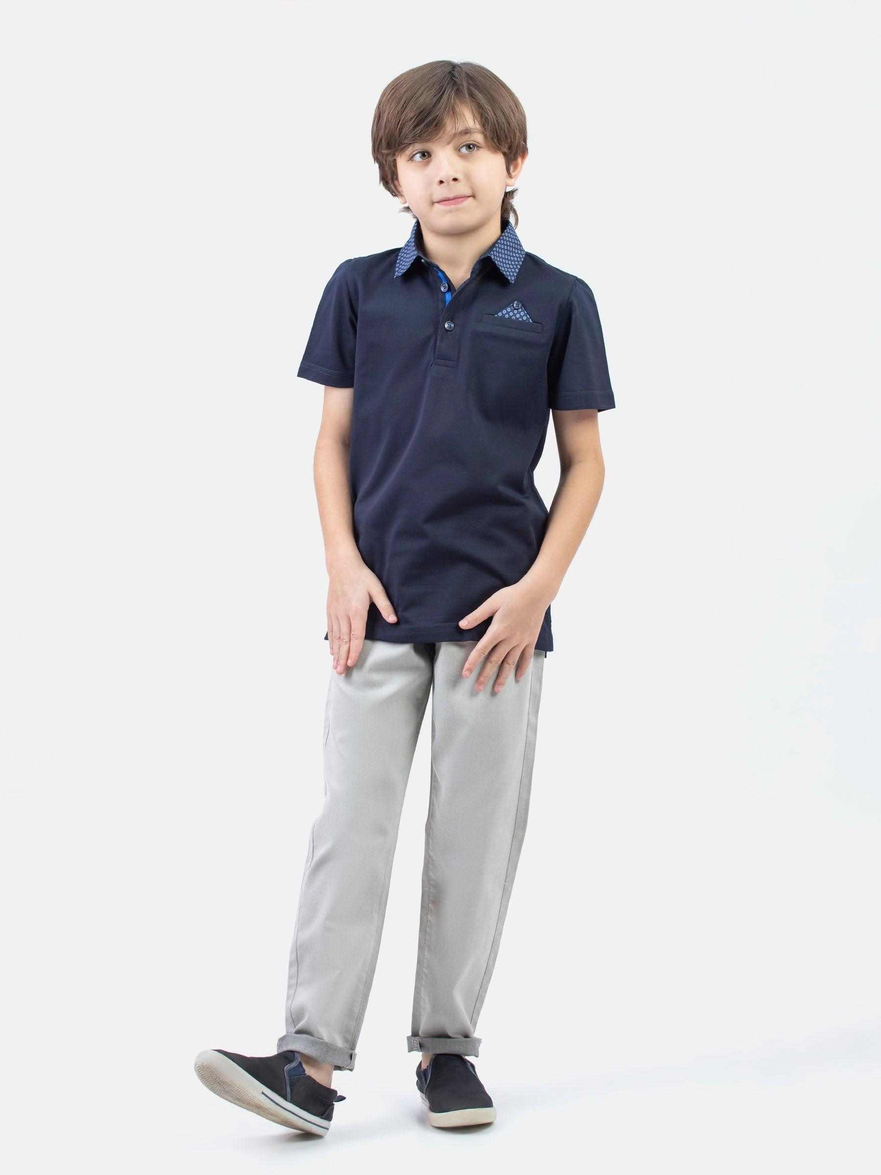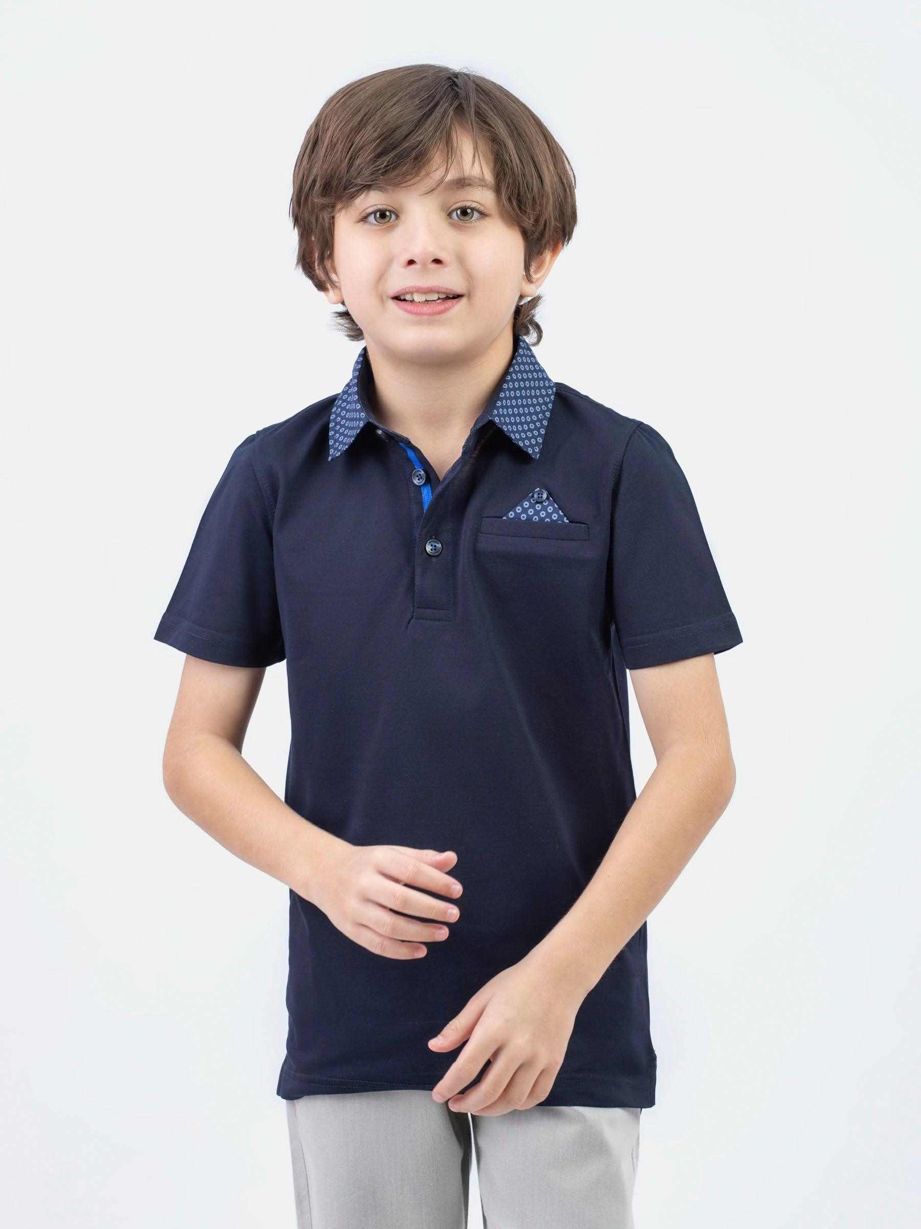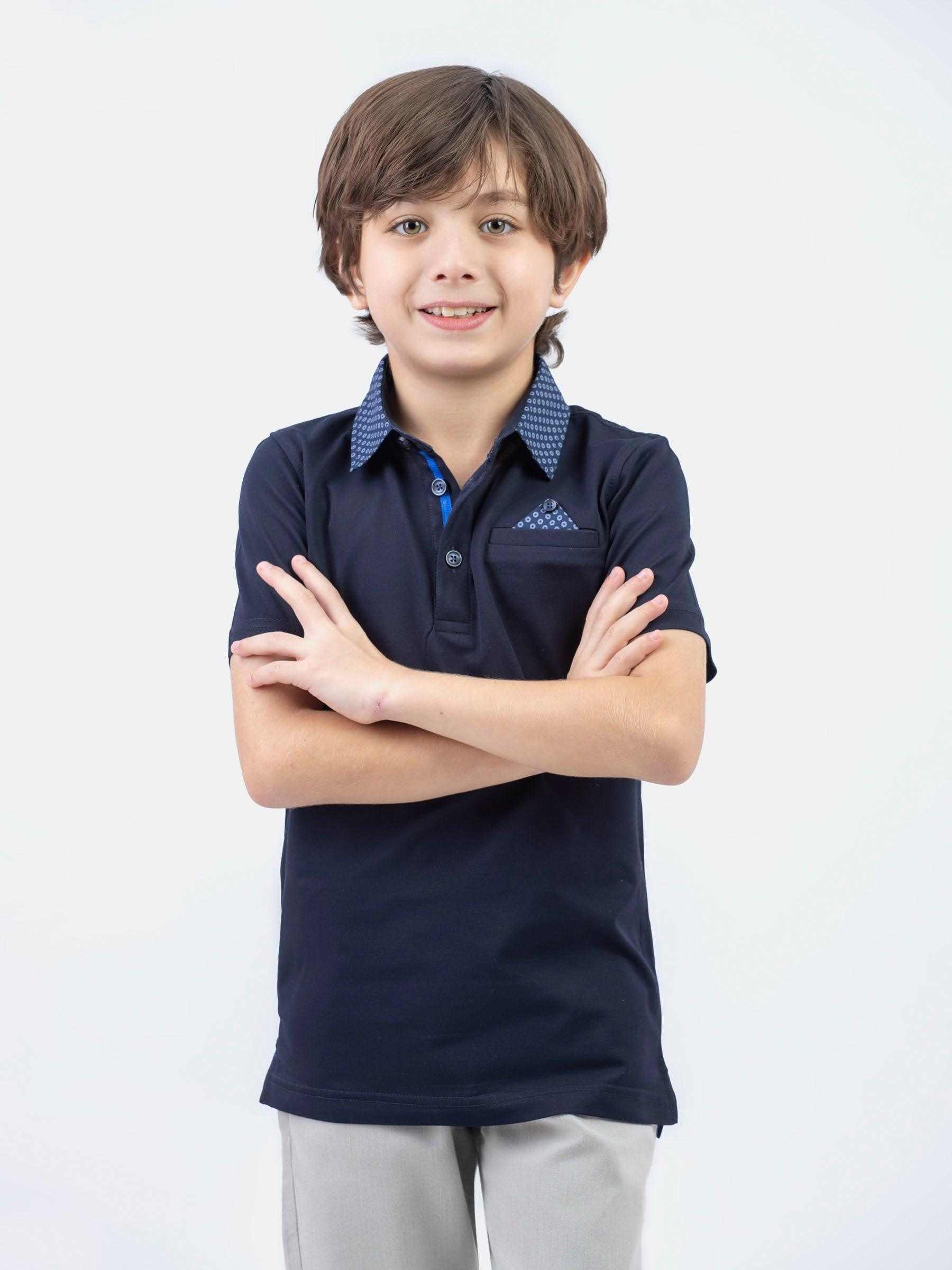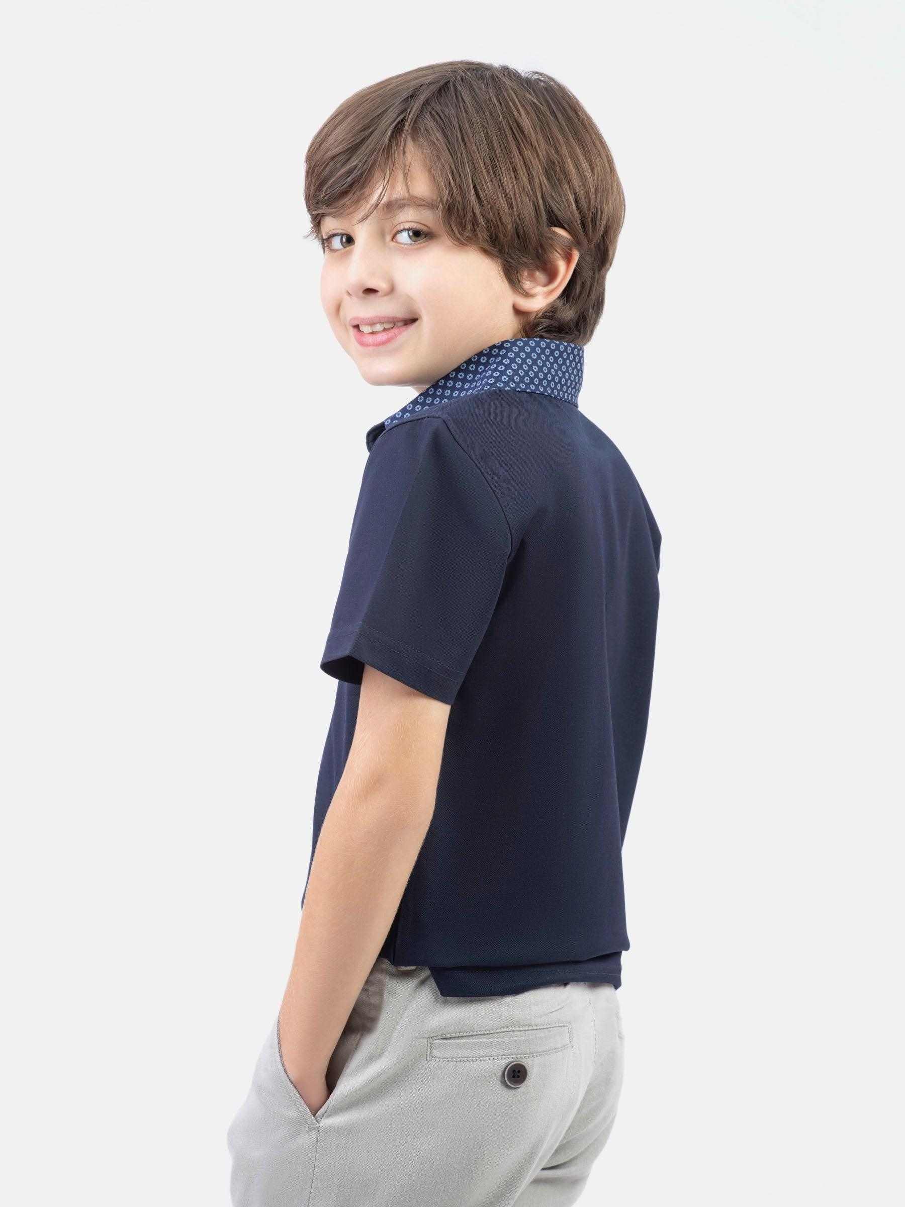 Designed for comfort, this navy blue casual polo shirt seamlessly blends sophistication with laid-back charm. Featuring printed collar for a subtle yet distinctive touch to your kids ensemble.