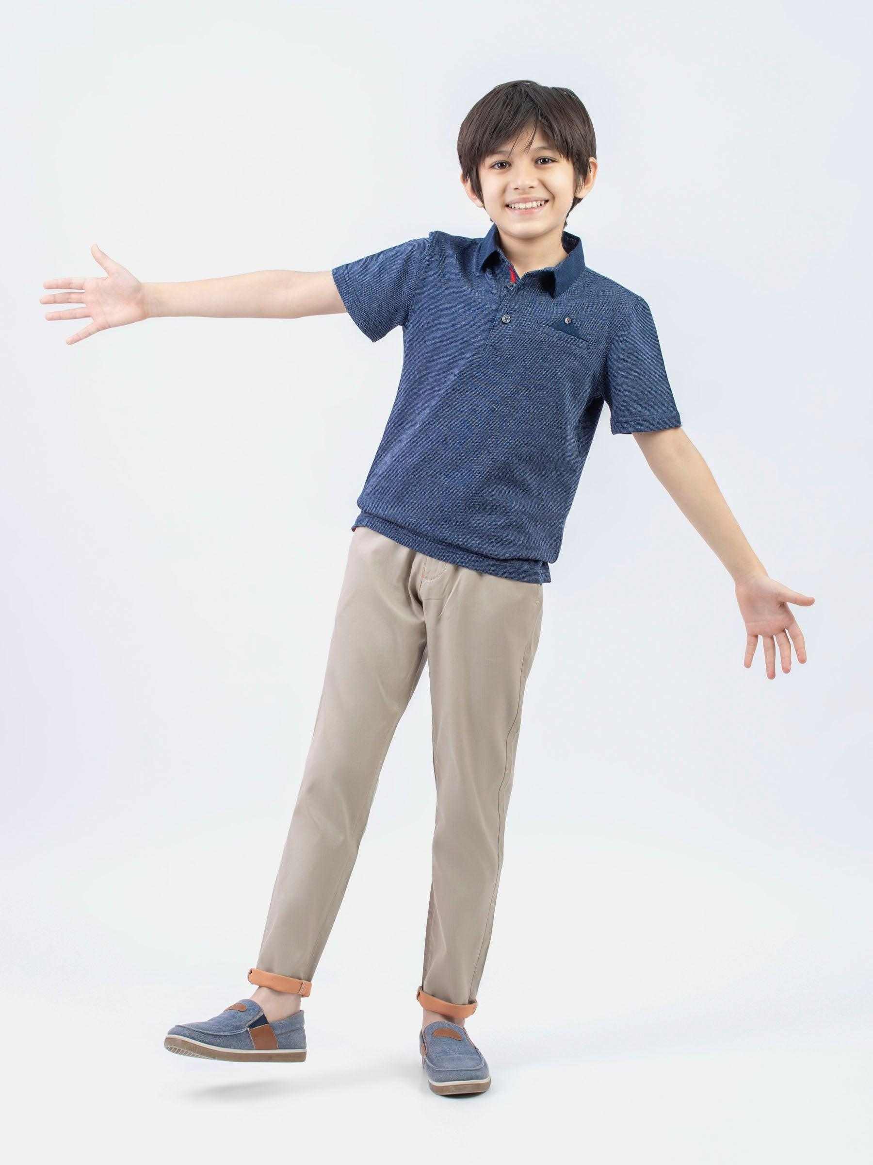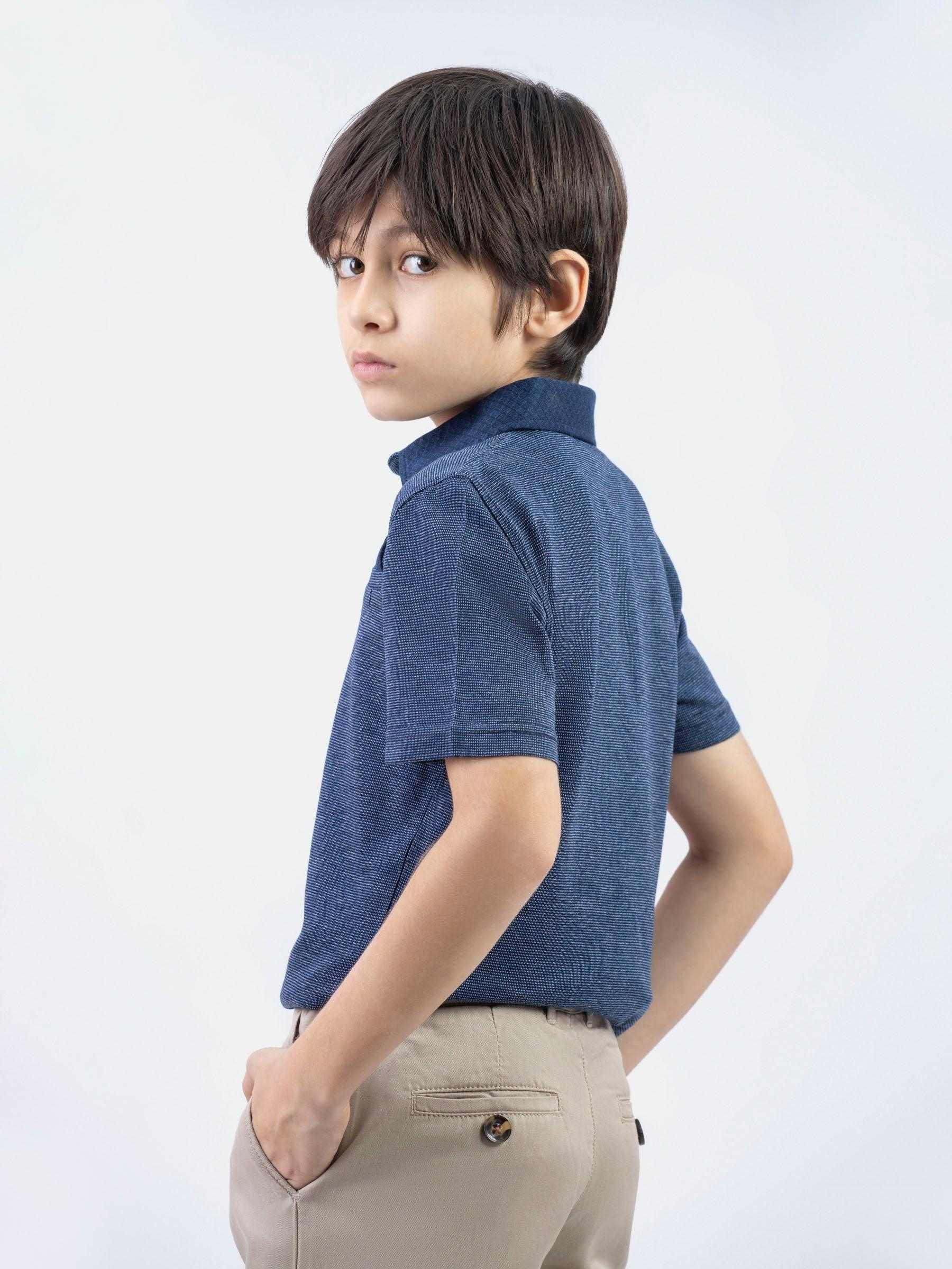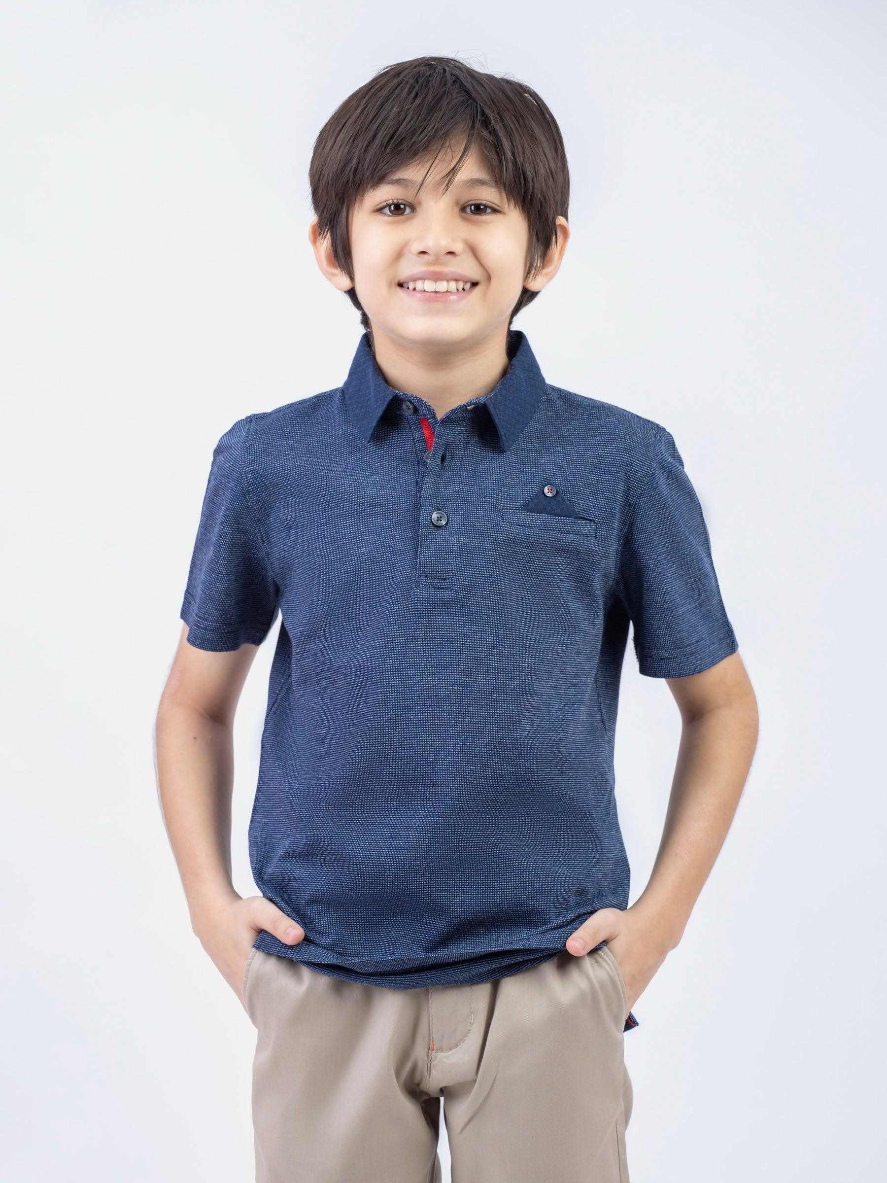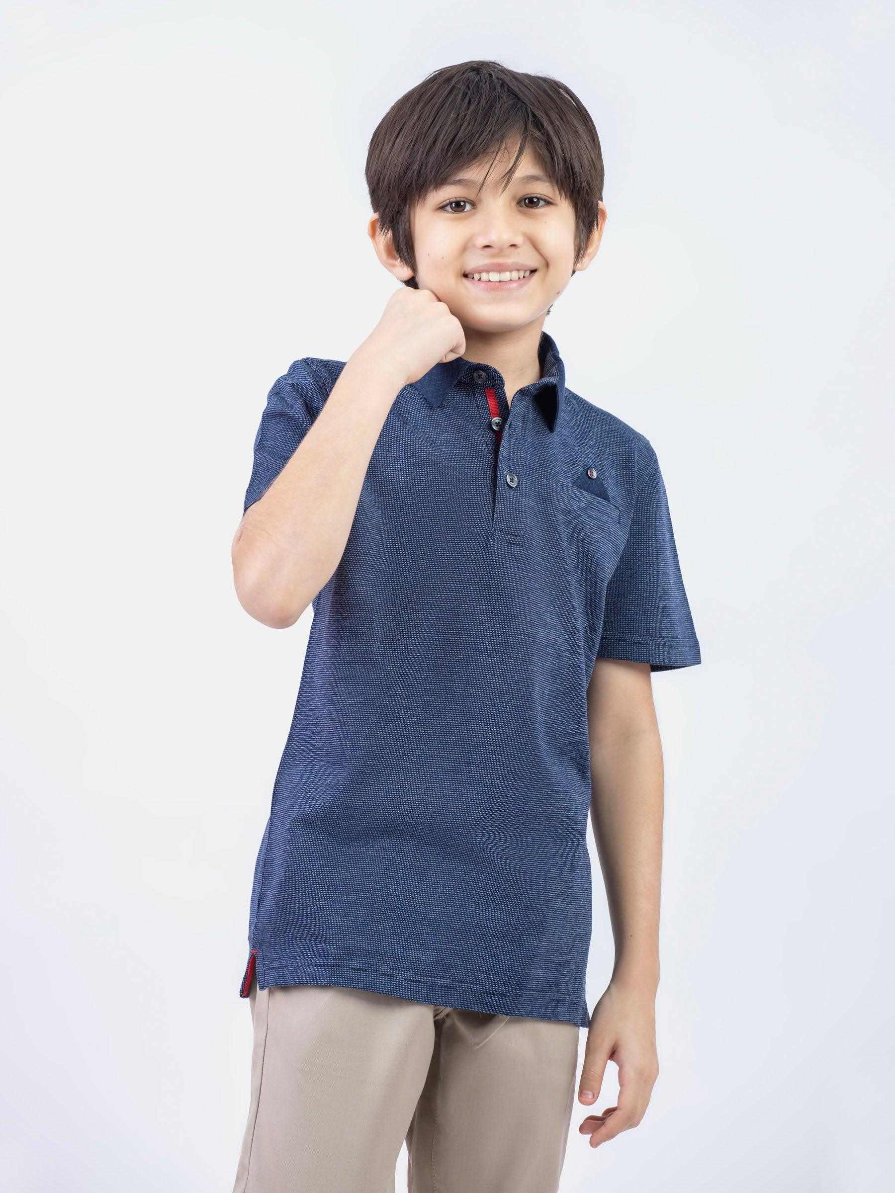 Keep your kid looking stylish in our navy blue dobby structured casual polo. Featuring contrasting navy blue collar with 3 buttons placket. It’s a perfect addition to your kids wardrobe