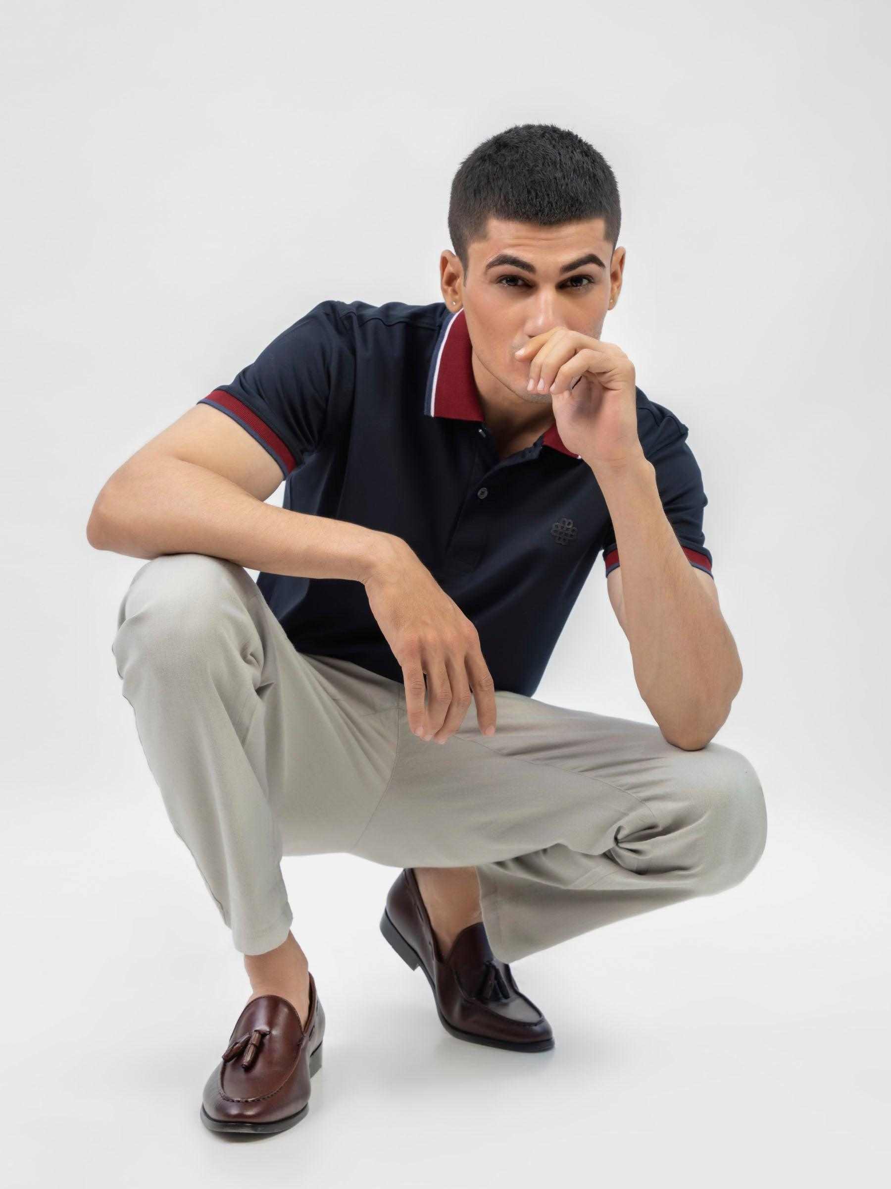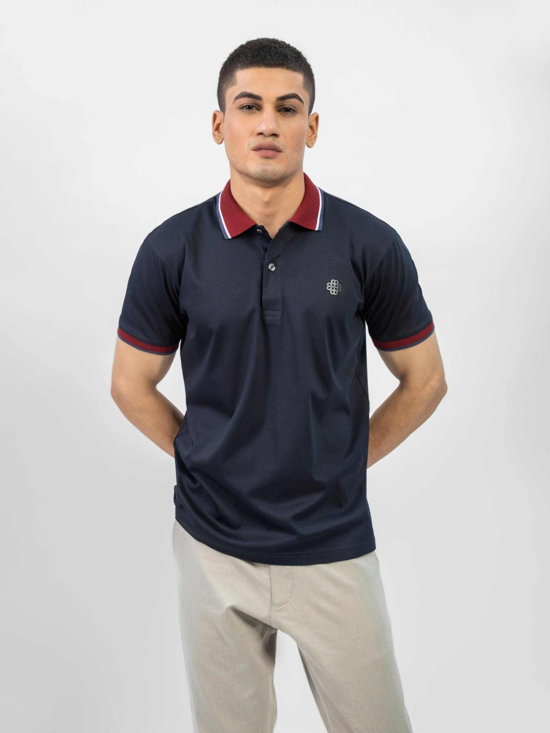 Navy Blue Interlock Polo With Contrasting Maroon Collar