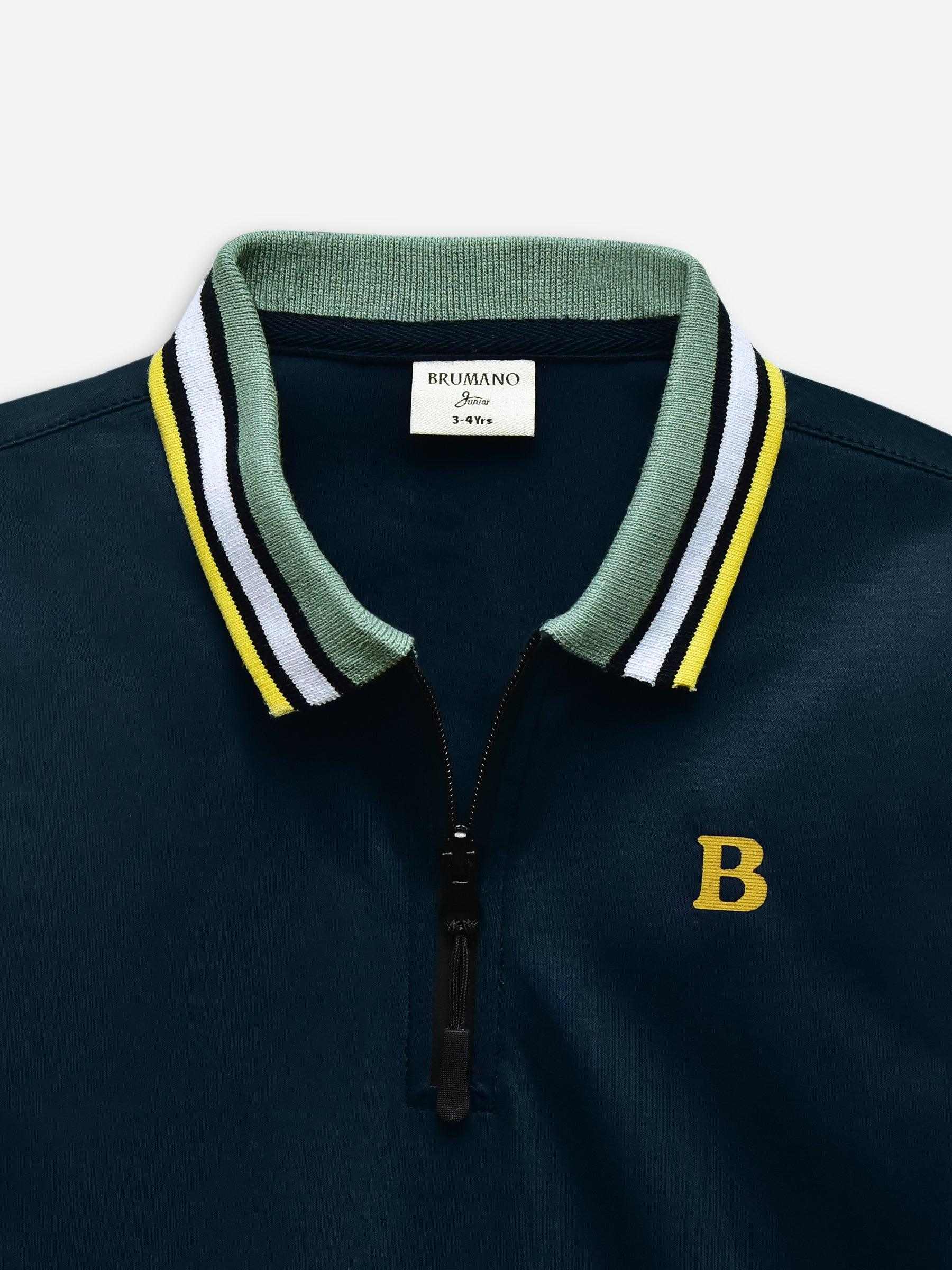 Embrace casual elegance with our kids navy blue zipper polo. Featuring short sleeves style in interlock fabric, this superb quality polo features zip-up front, contrasting sage green collar & rib cuffs. Finished with branded embossed emblem to complete the look of this polo