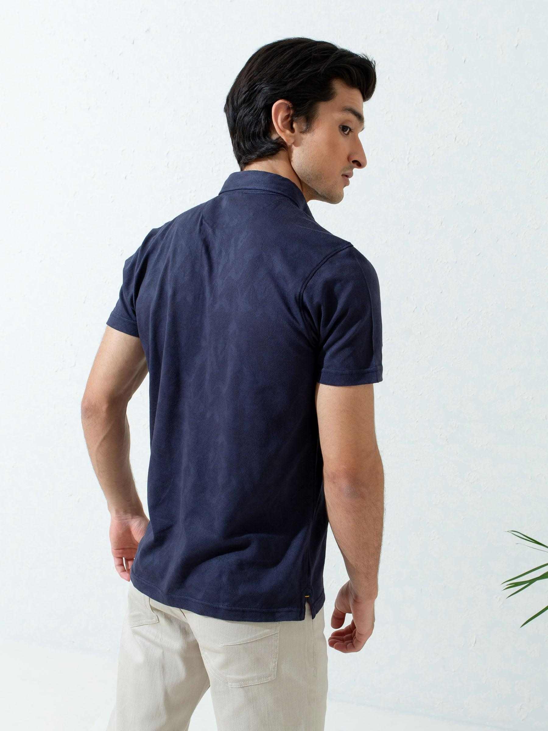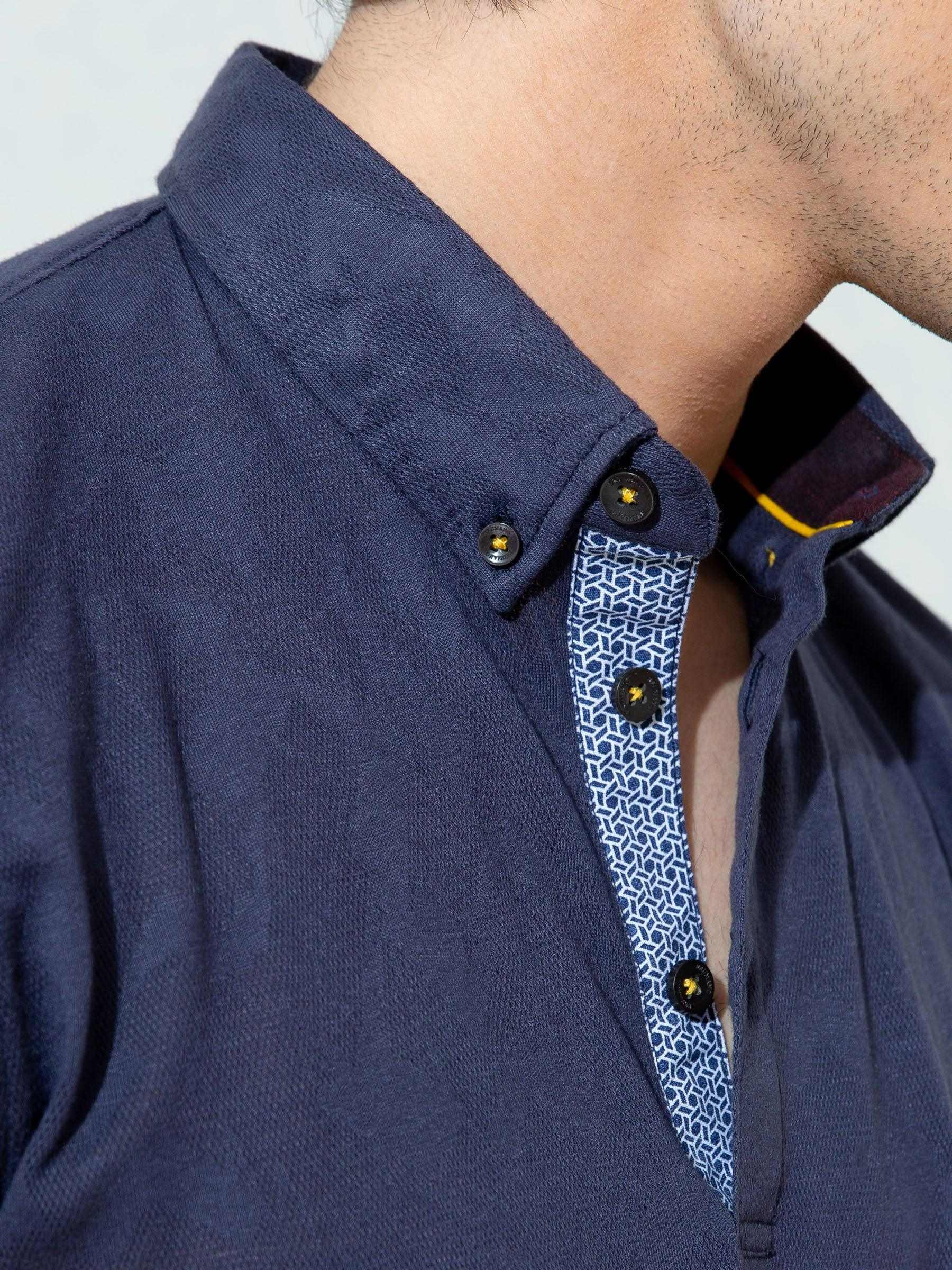 Elevate your casual style with this navy blue mercerized polo shirt, made with jacquard patterned knitted fabric. Featuring maroon inner collar detailing. Perfect for day out or a day at the office.