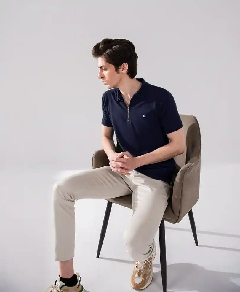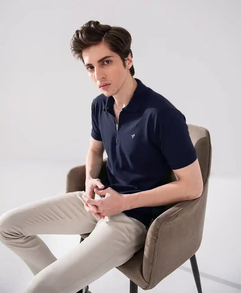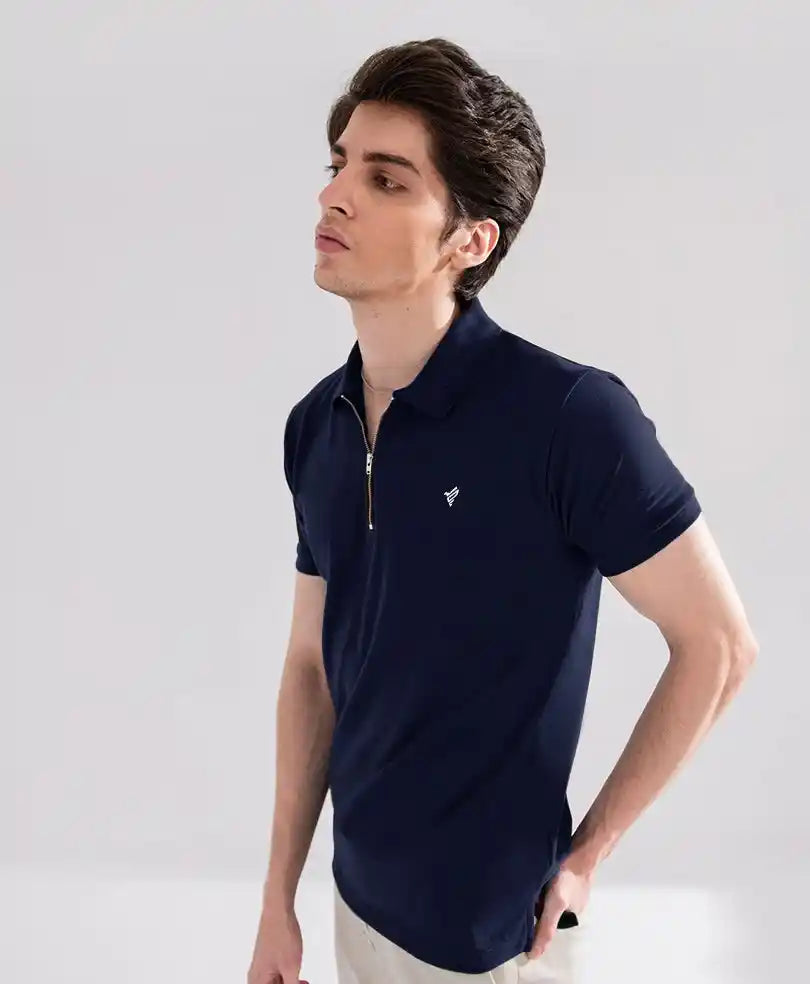 The navy POLO shirt catches the eye with its unique color blend and vibrant accents. A must-have for a sporty look, it features a slim fit, short sleeves, and a zip-up neck, consistent with our distinctive style. Showcase your personality by pairing this embroidered polo shirt with beige or black chinos and sneakers.