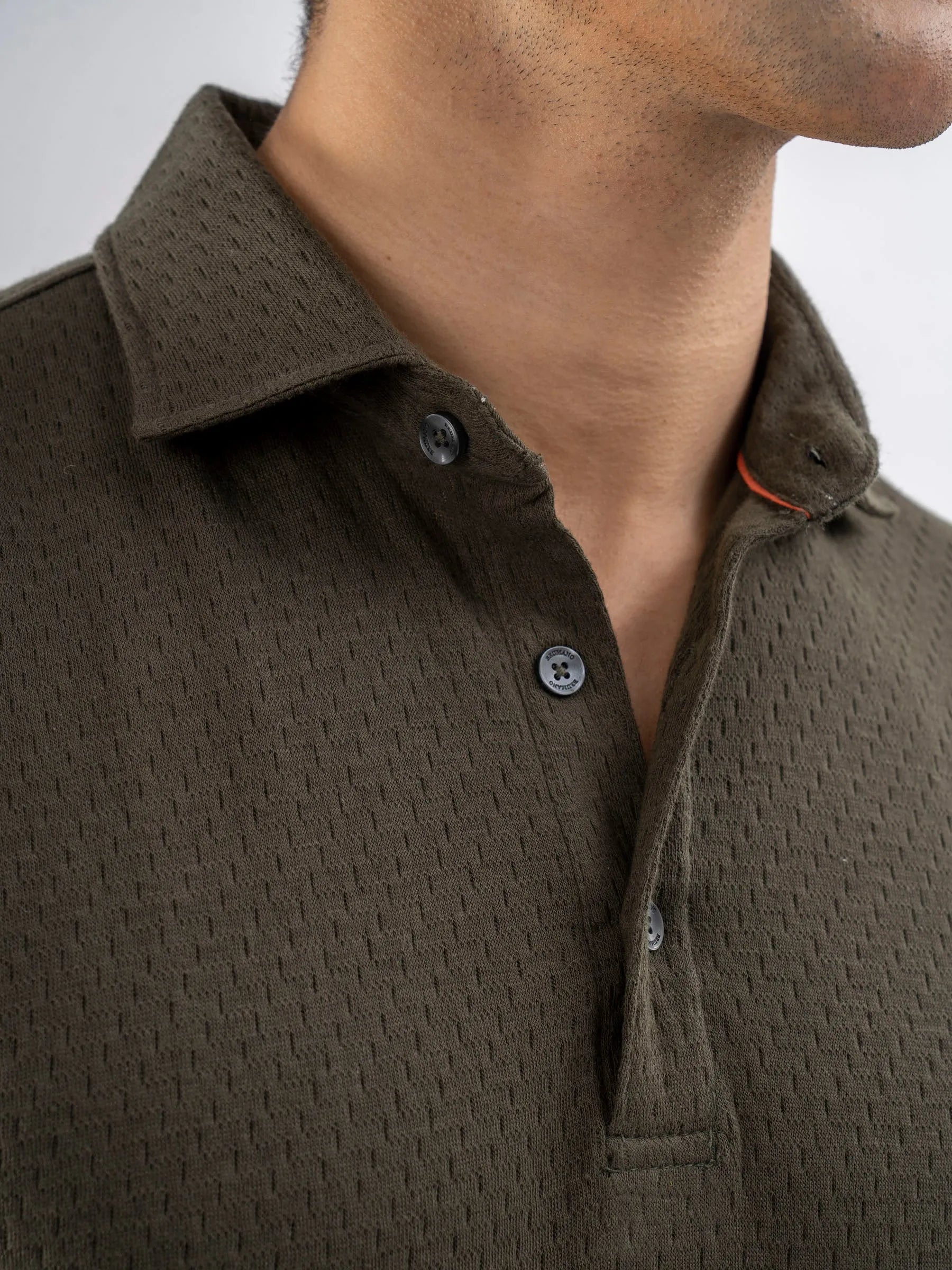 Elevate your smart-casual style with our olive green structured polo. Crafted from premium textured fabric, it features a modern cutaway collar for a refined edge. Perfect for both work and weekend wear.