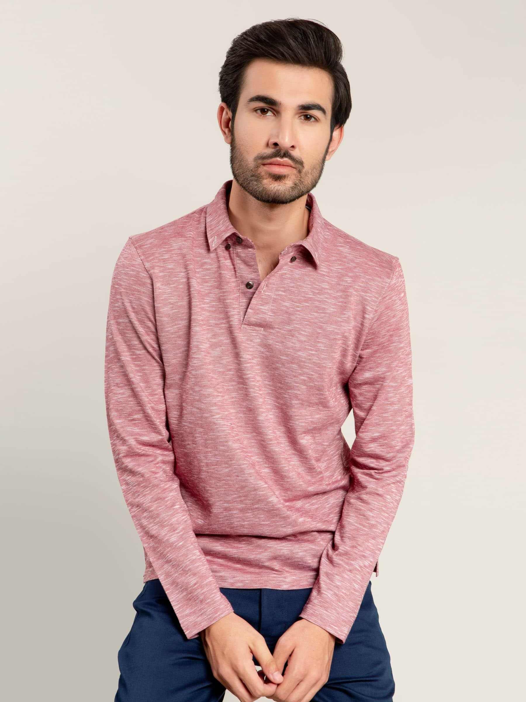Opt for a cool look in this red full sleeve polo shirt in mercerized fabric. Featuring button down collar with inner collar ribbon detailing. Pair it with dark color jeans.