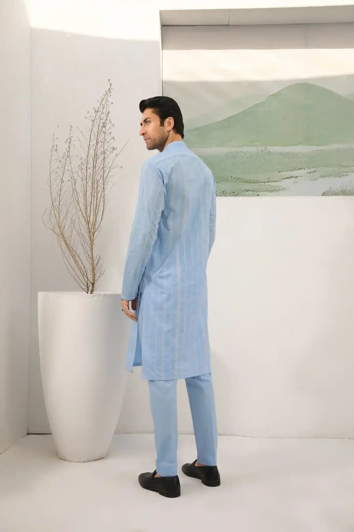 Sky Blue Cotton Embroidered Kurta Trouser - Men