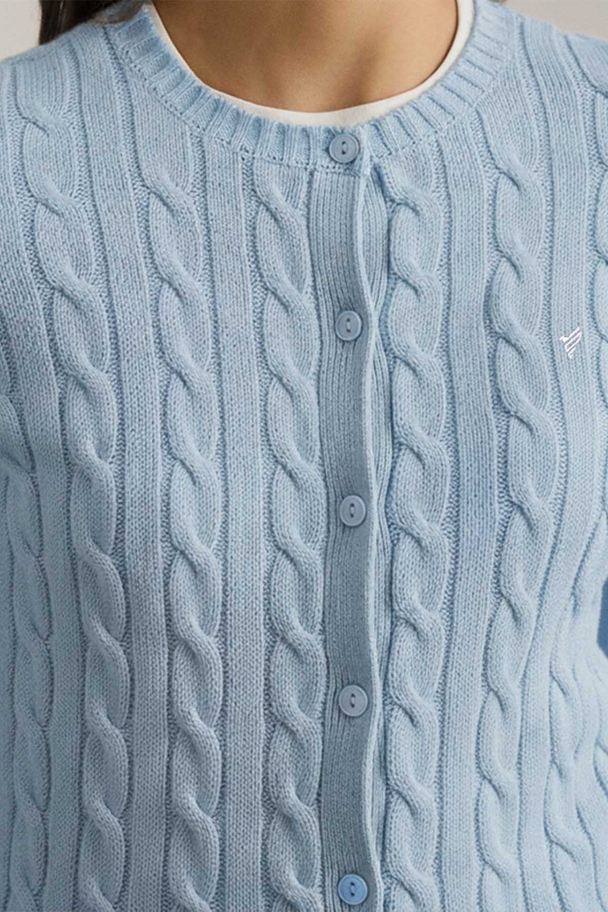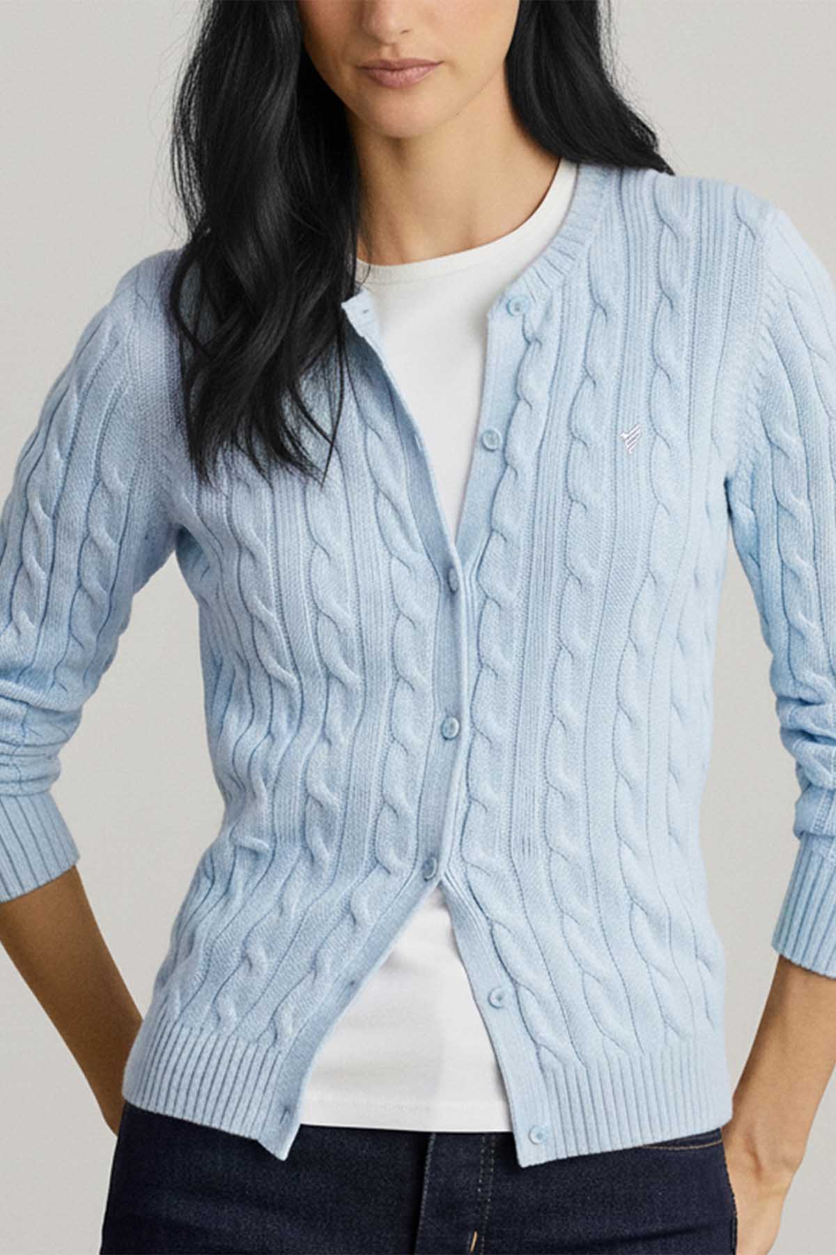 Cable-knit with pure cotton, this slim crewneck cardigan is finished with the signature embroidered Icon on the chest.