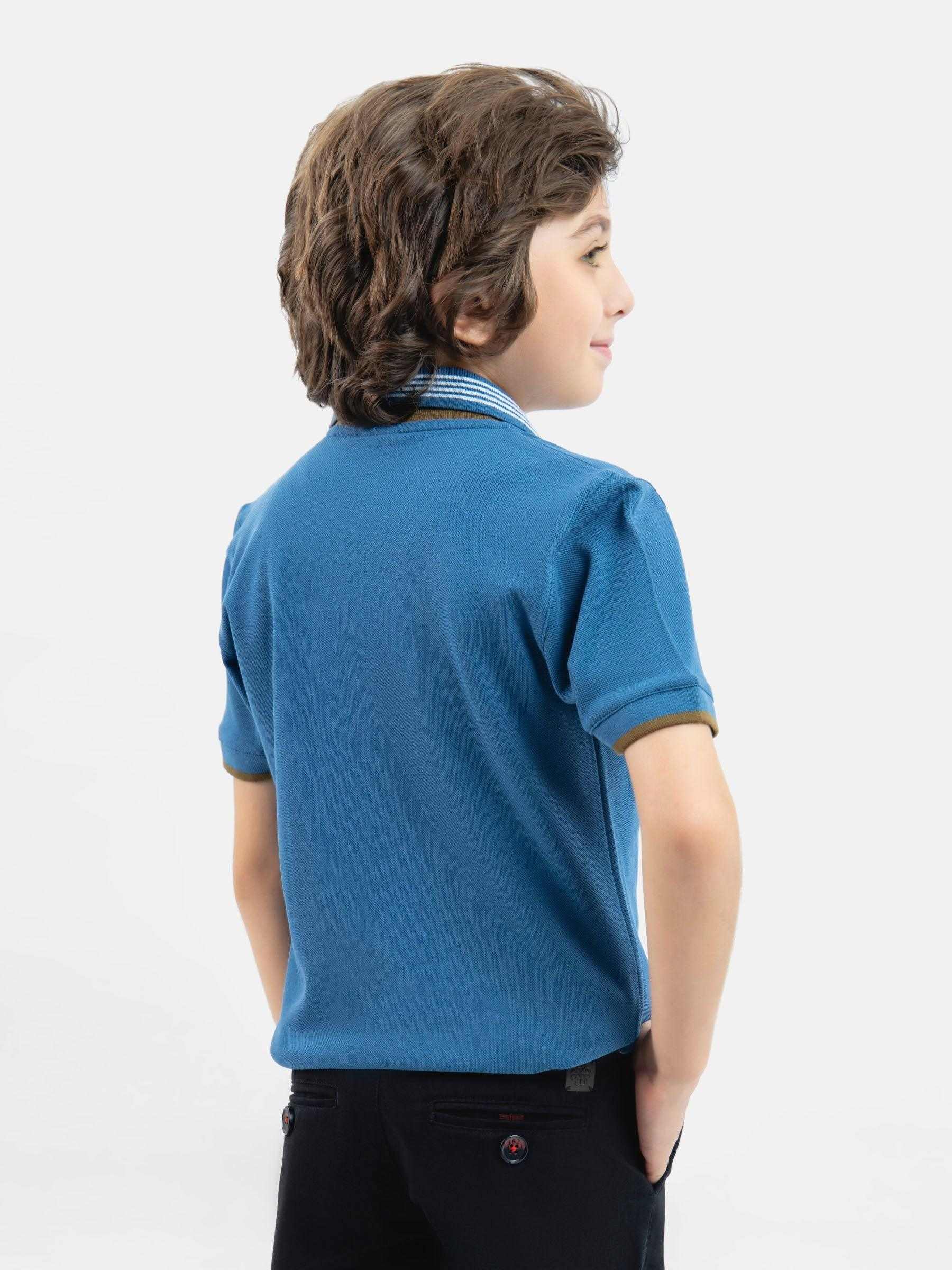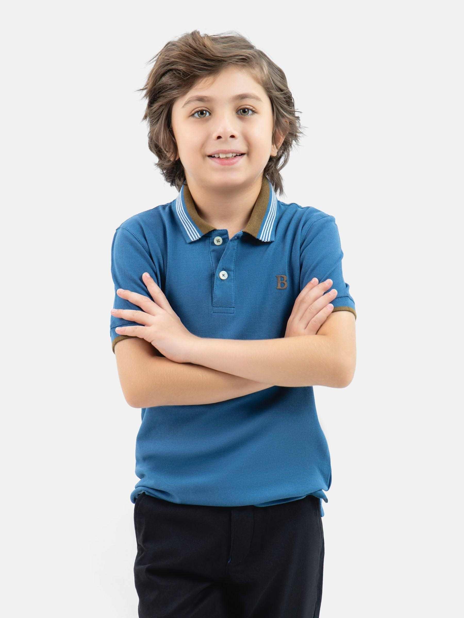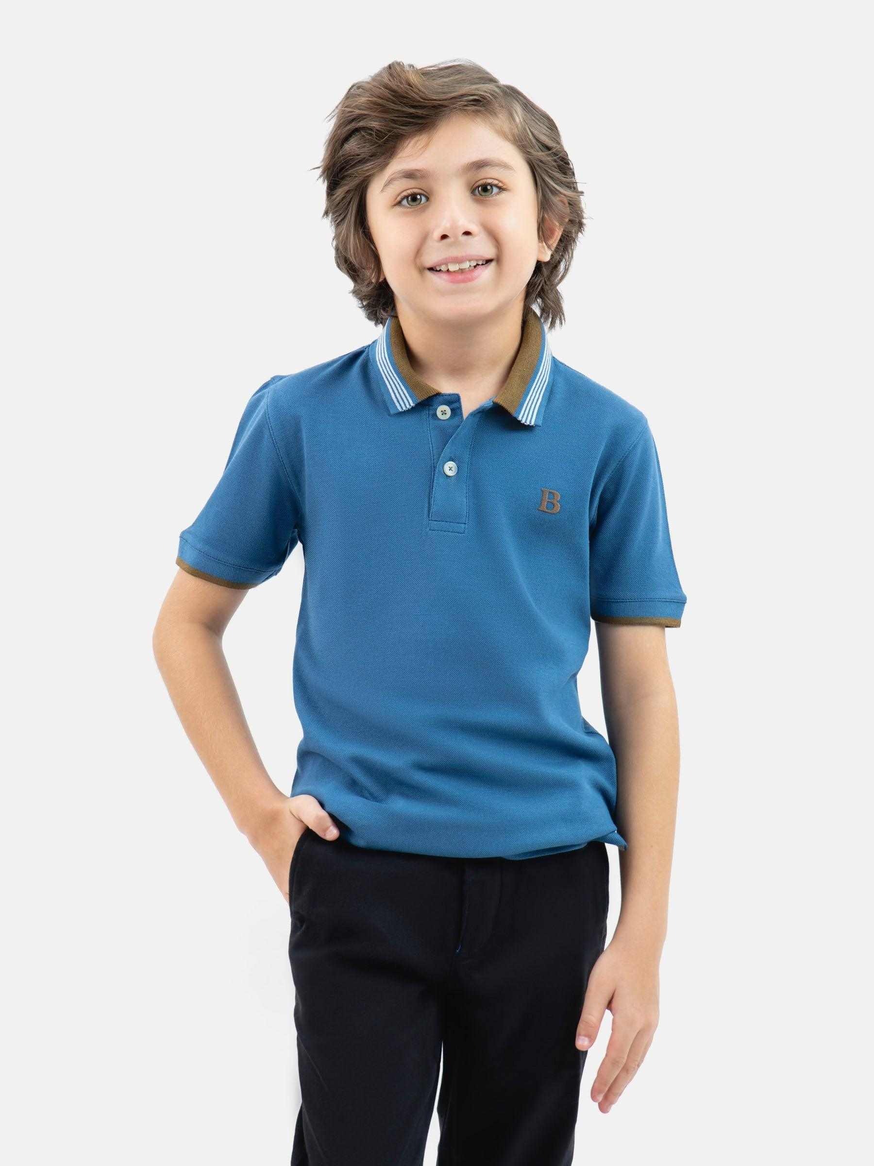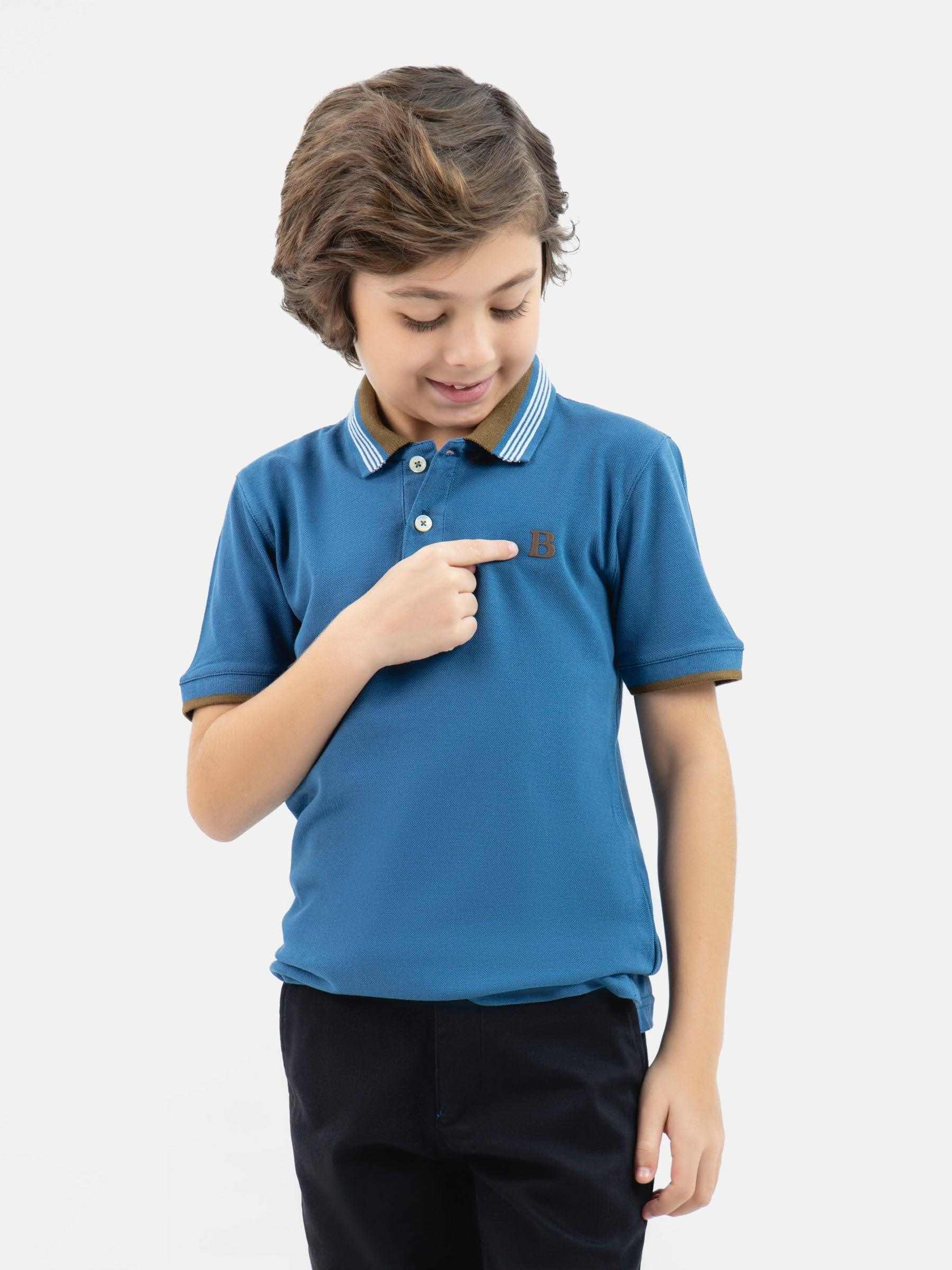 Keep your little one cool and comfortable in in our kids teal blue pique polo. Made with fine fabric, it features contrasting brown collar, two button placket & branded 'B' emblem in front. Pair it with shorts for a summer look