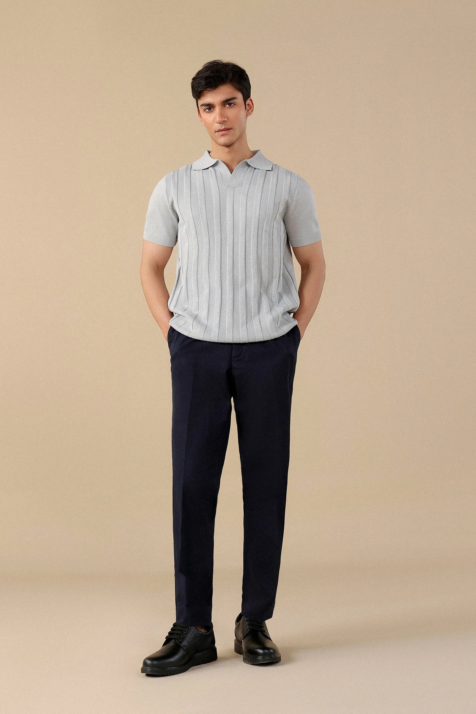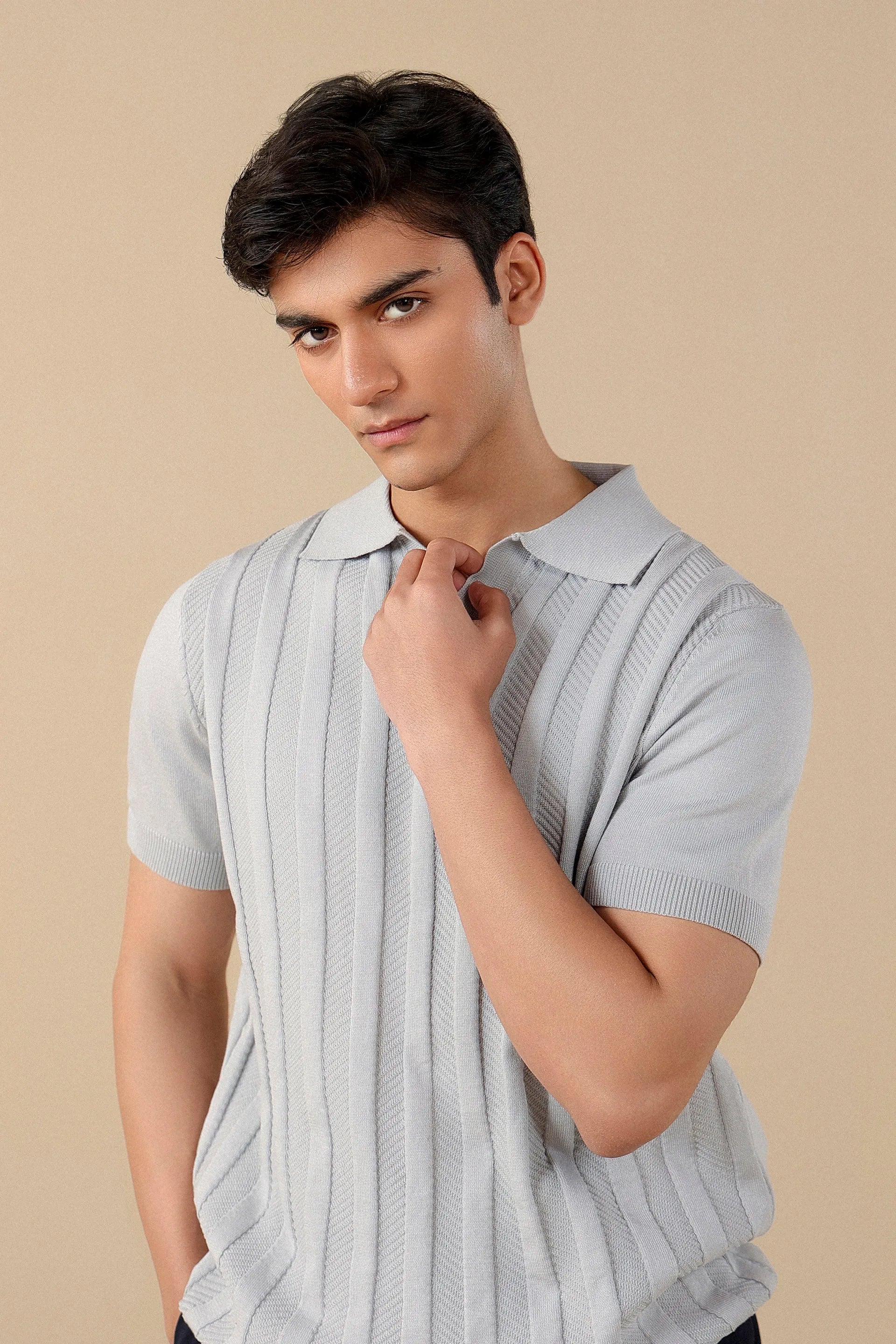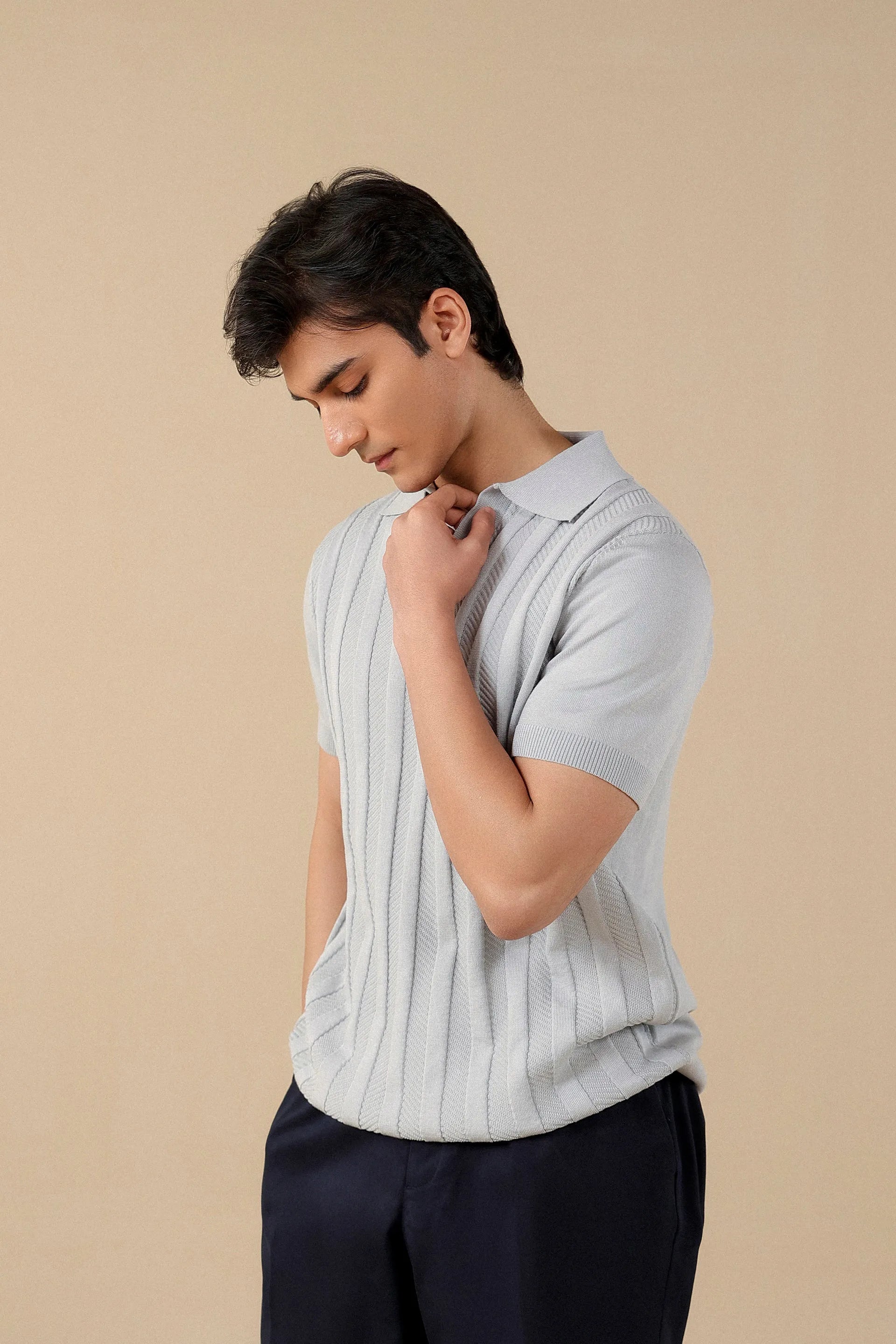 A refined take on classic casualwear, this premium textured jacquard knit polo is defined by its rib-like texture and seamless make for a sleek, contemporary finish. The structured yet breathable knit makes it a versatile staple for both casual and elevated everyday styling.