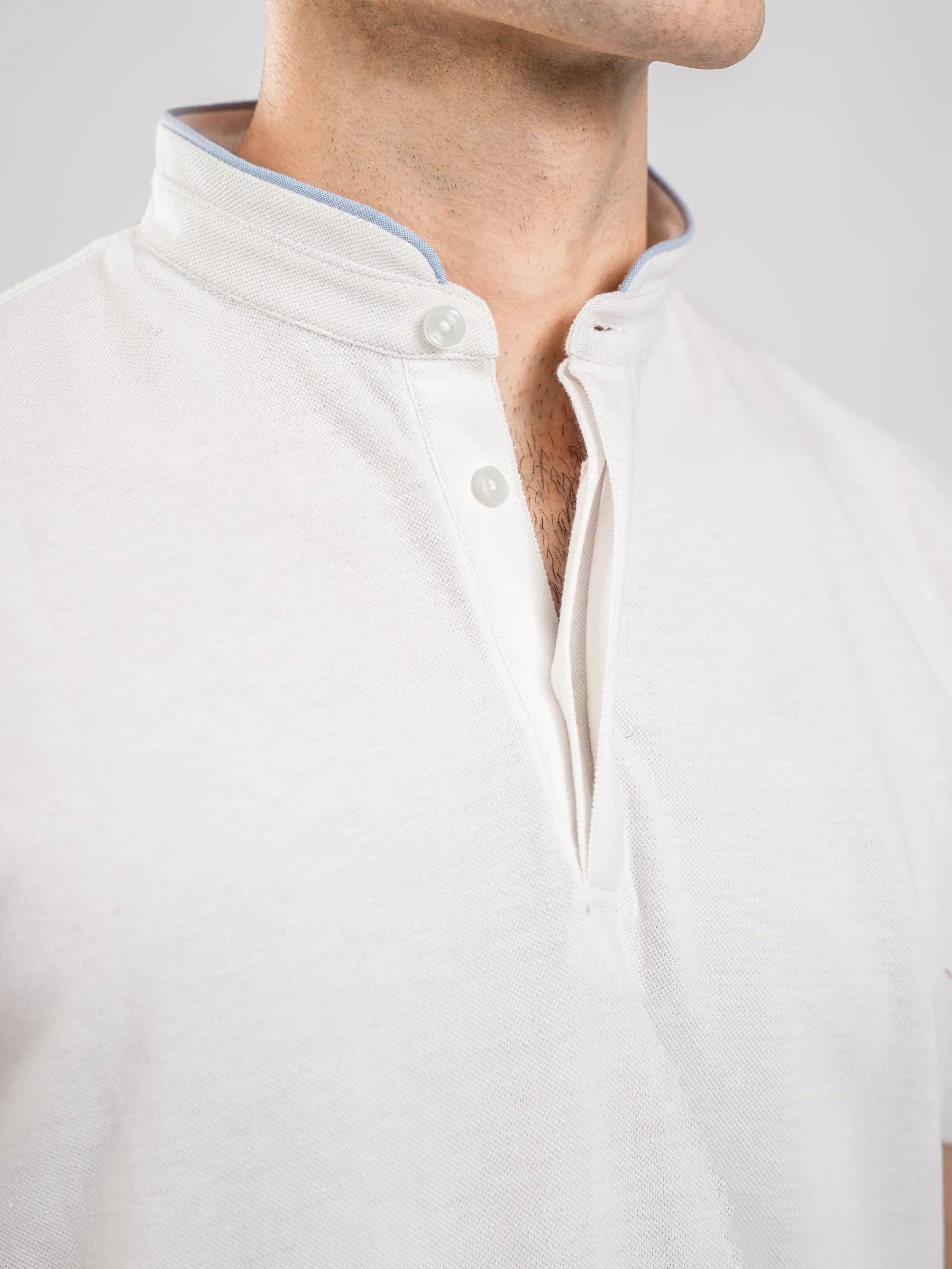 Upgrade your everyday look with our white mao collar pique polo – a modern twist on a classic. Crafted from breathable pique cotton, it features a sleek band collar for a clean, minimal aesthetic. Perfect for smart-casual dressing.