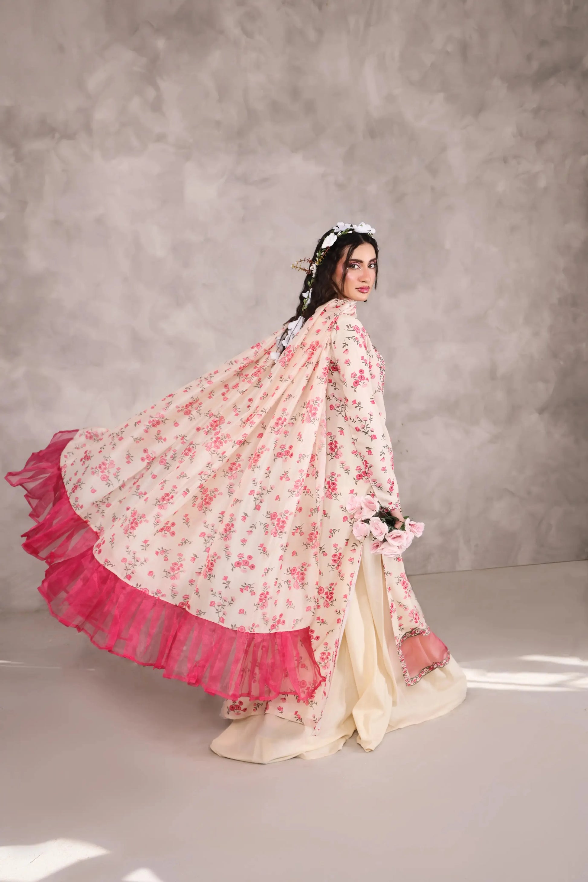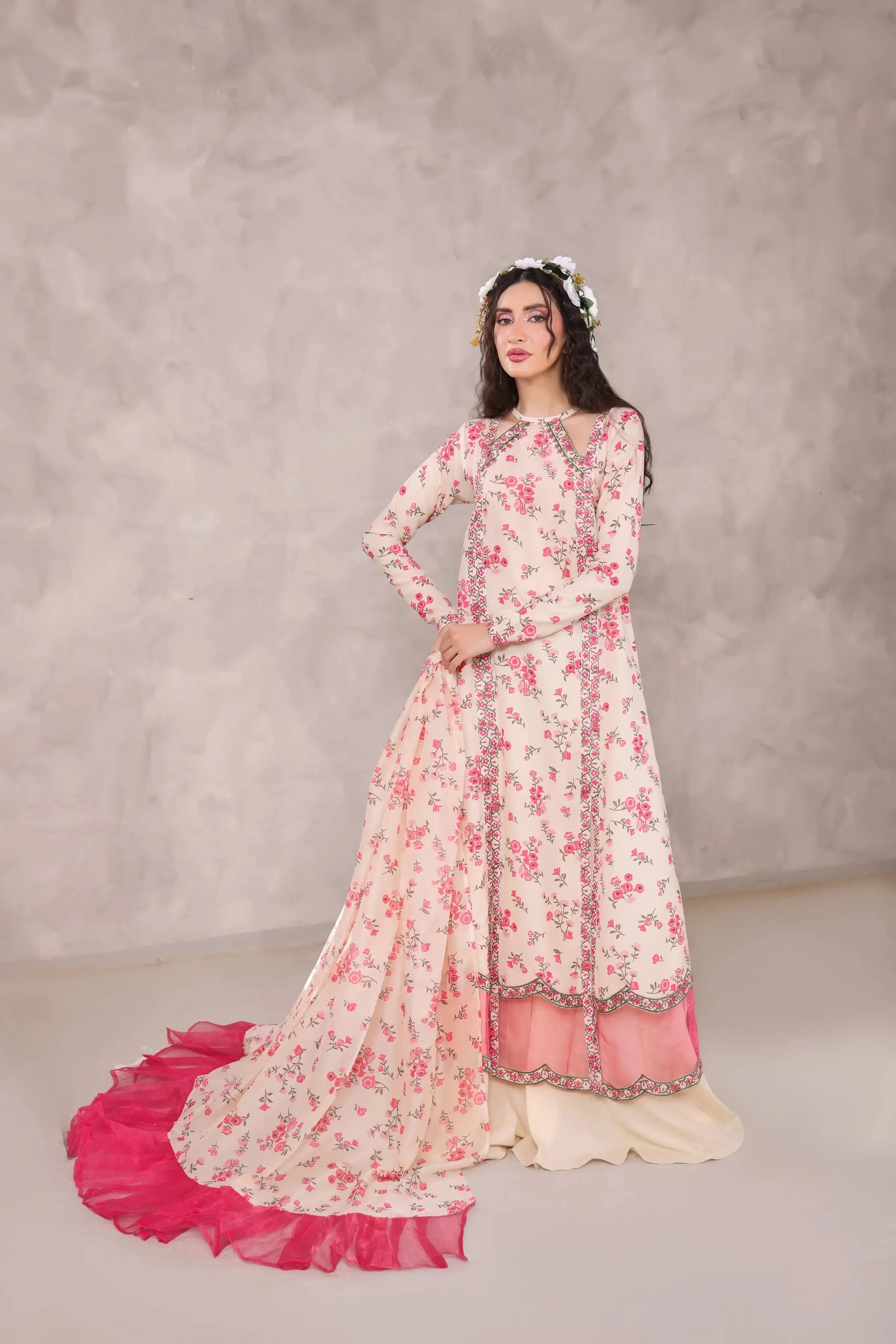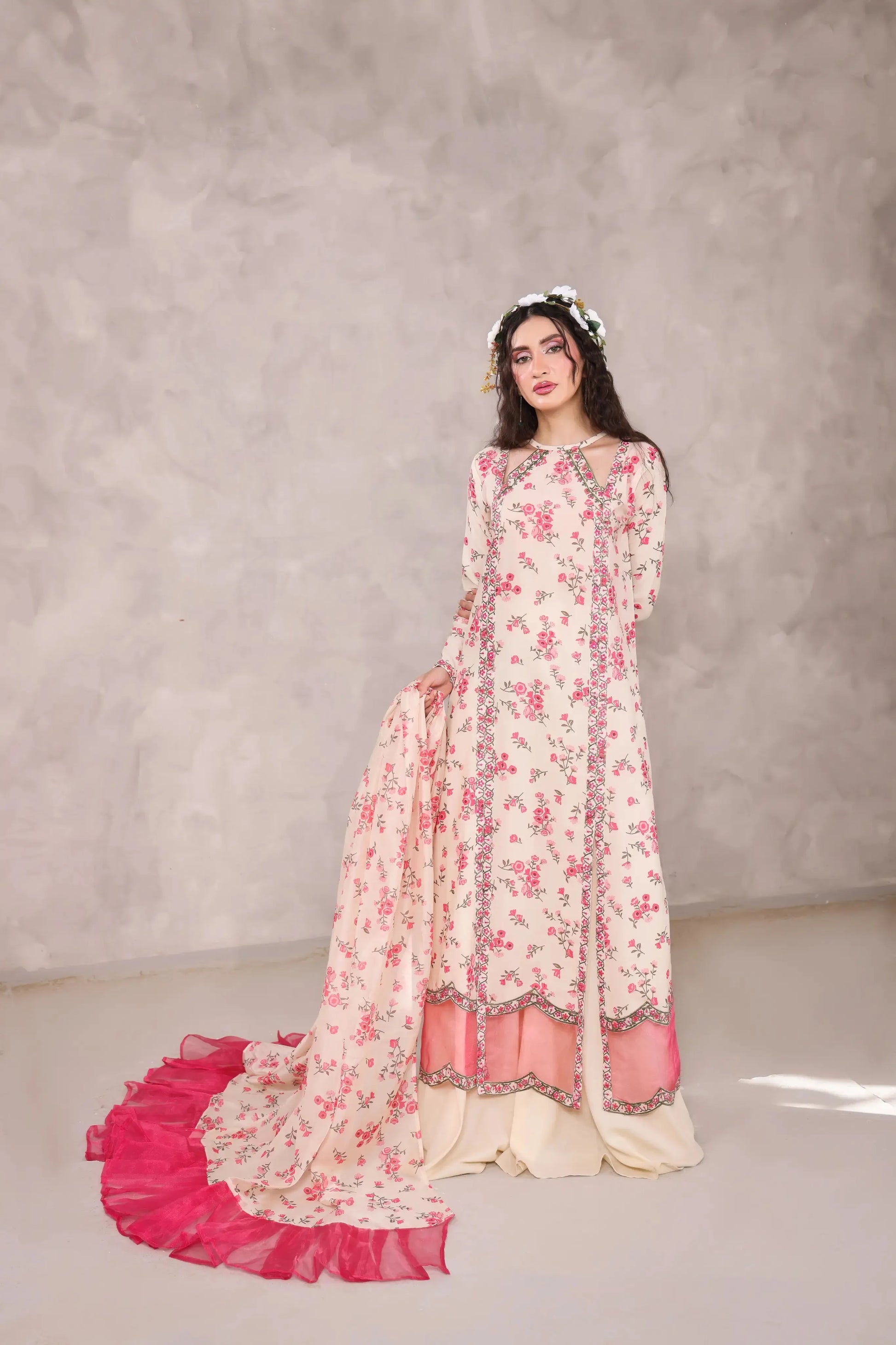 Dahlia is a 3-piece floral set featuring a fully embroidered shirt with cutout neckline and cutwork on daman. It comes with a lawn bottom and a printed silk dupatta for a graceful look.