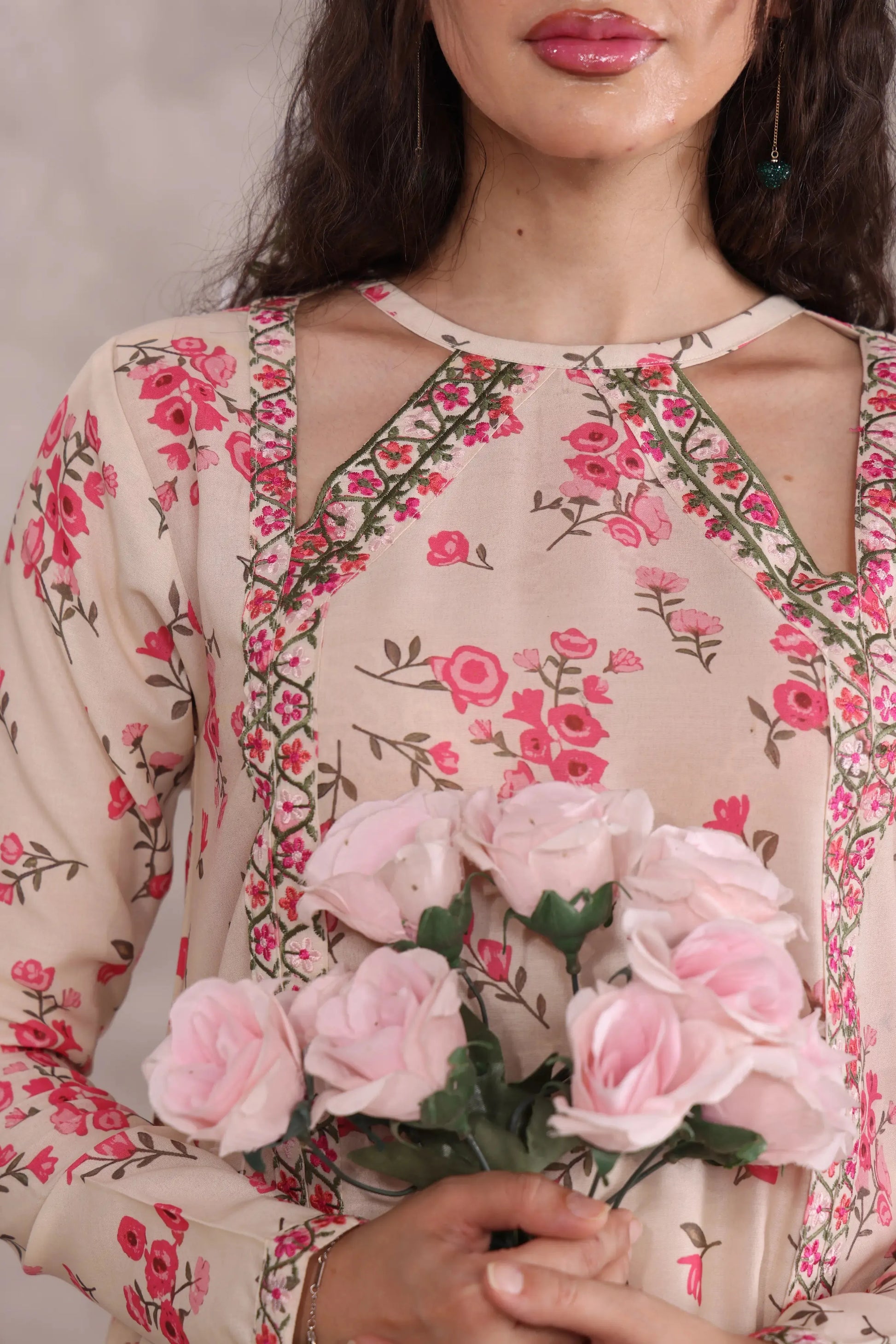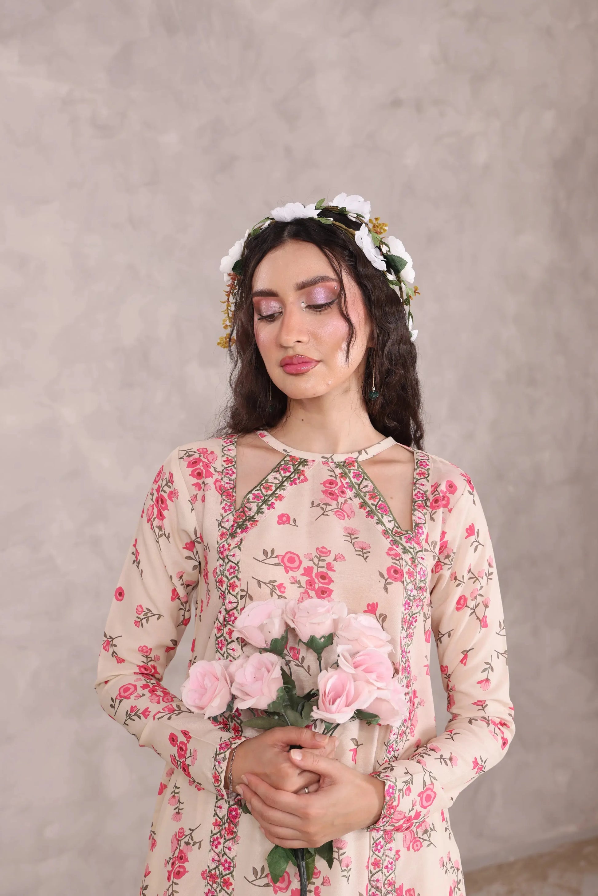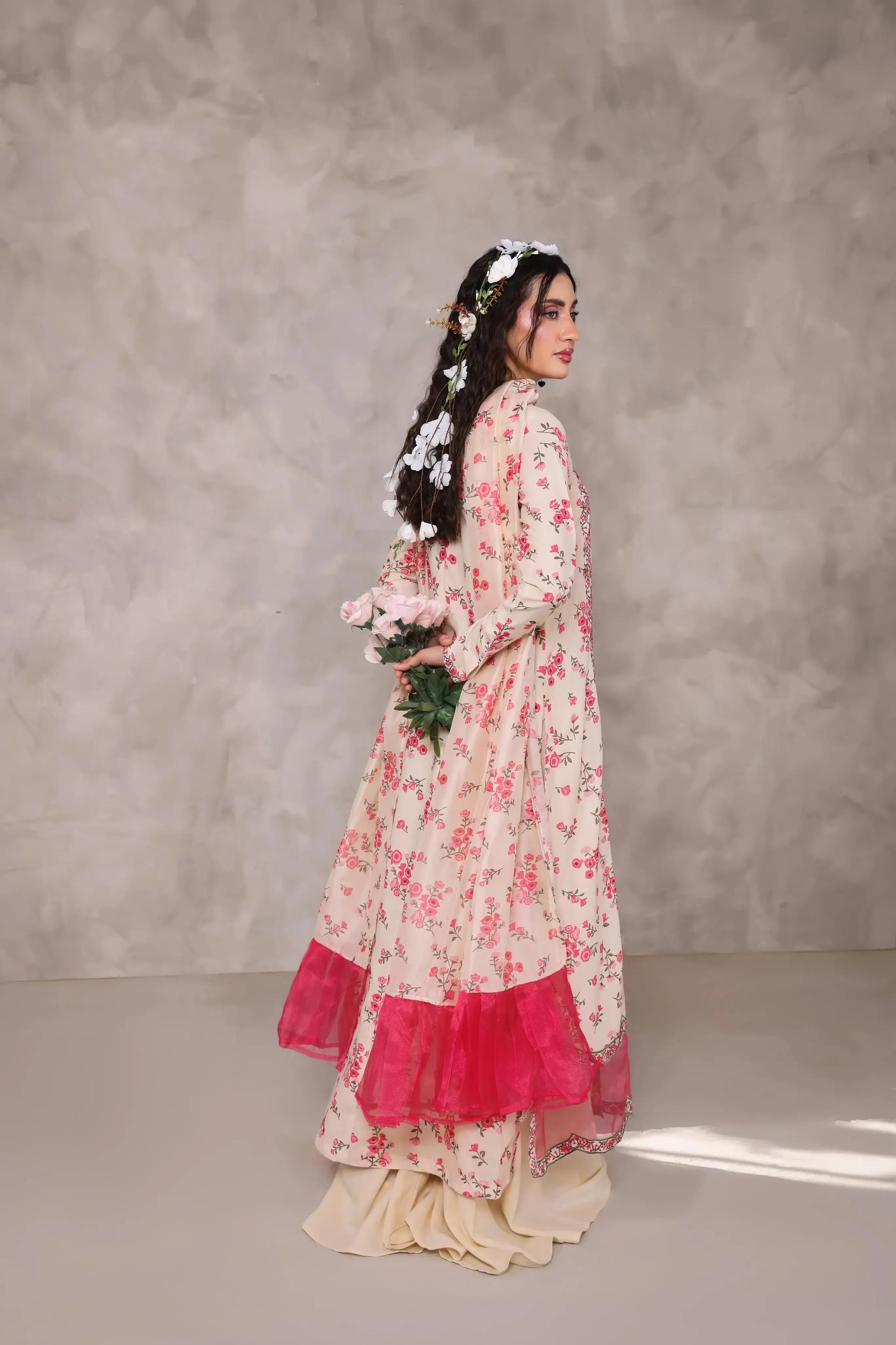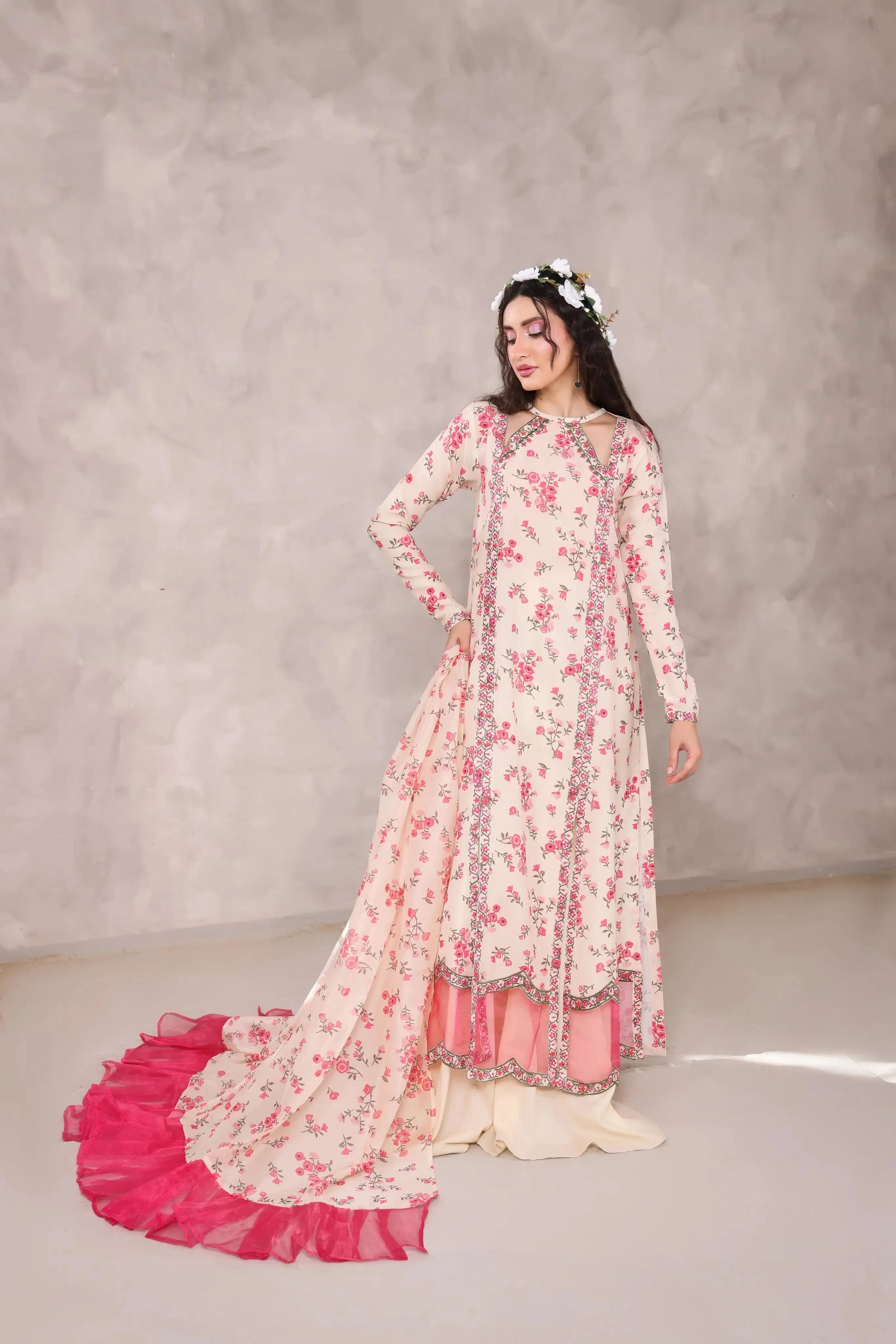 Dahlia is a 3-piece floral set featuring a fully embroidered shirt with cutout neckline and cutwork on daman. It comes with a lawn bottom and a printed silk dupatta for a graceful look.