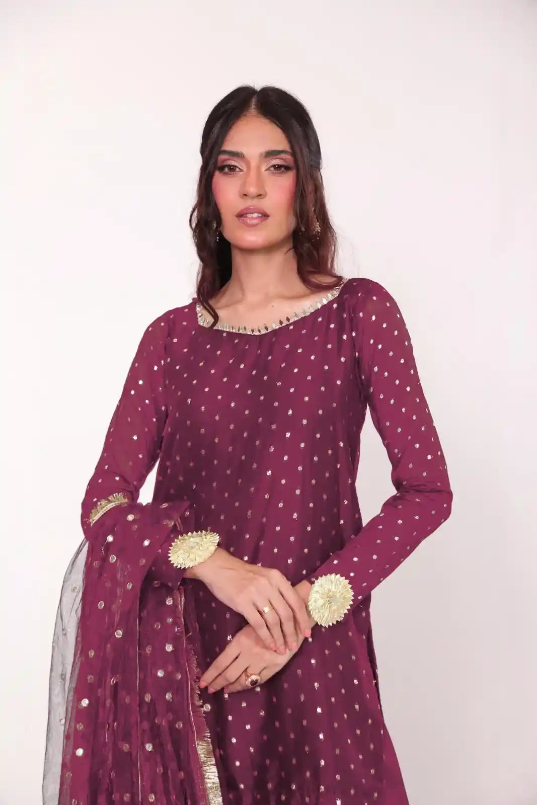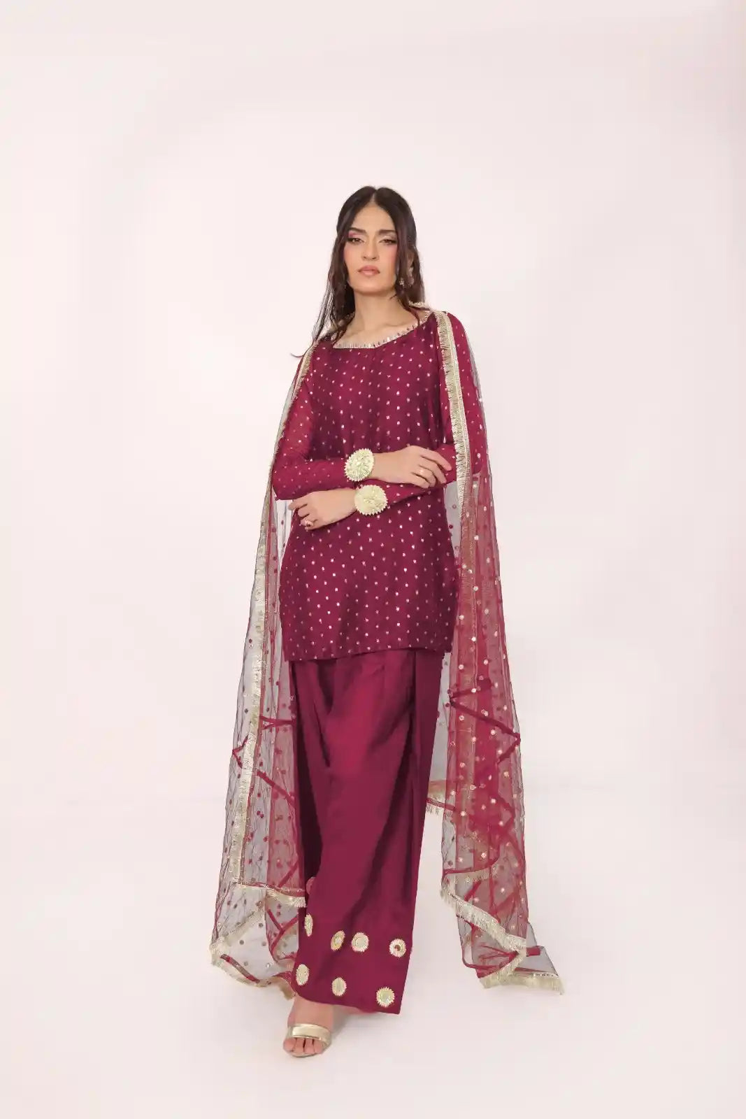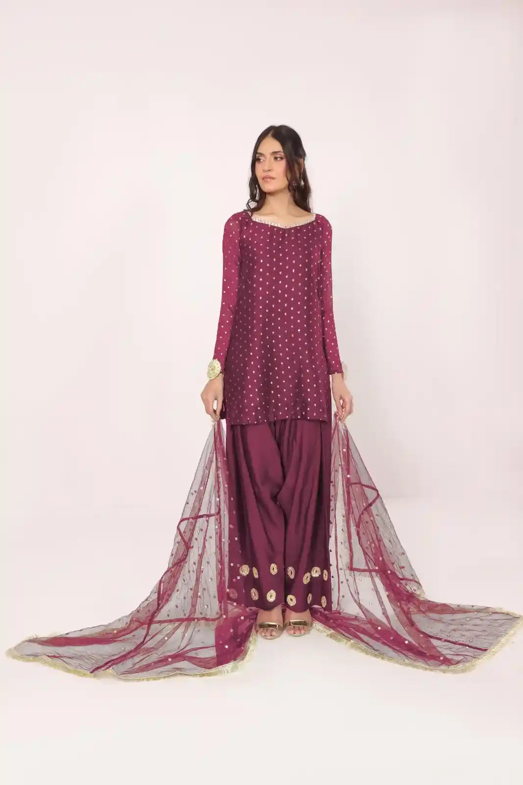 The set is paired with a sequin embroidered net dubatta, detailed with gold lace on all 4 sides, along with a raw silk farshi shalwar, detailed with gota mirrors.