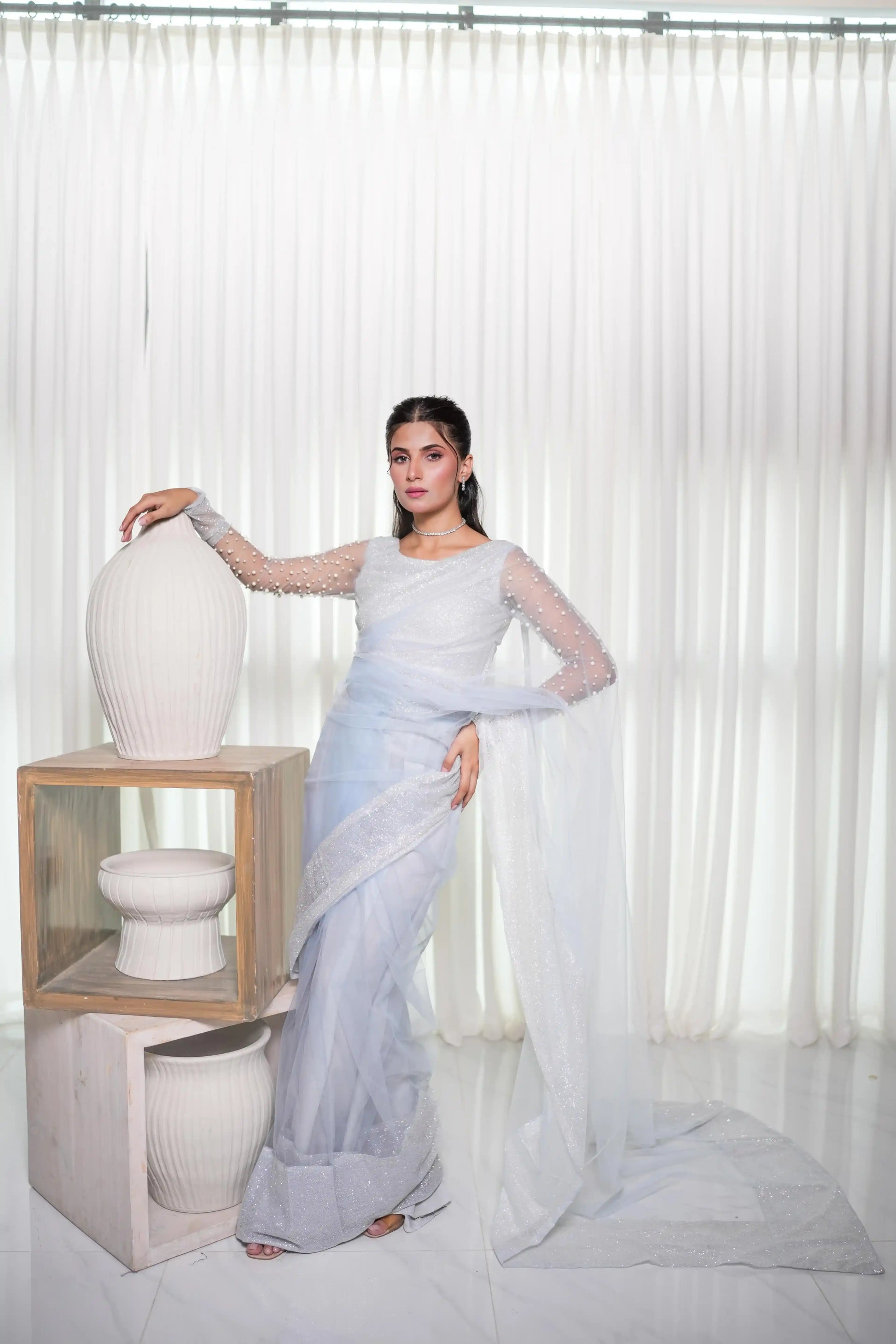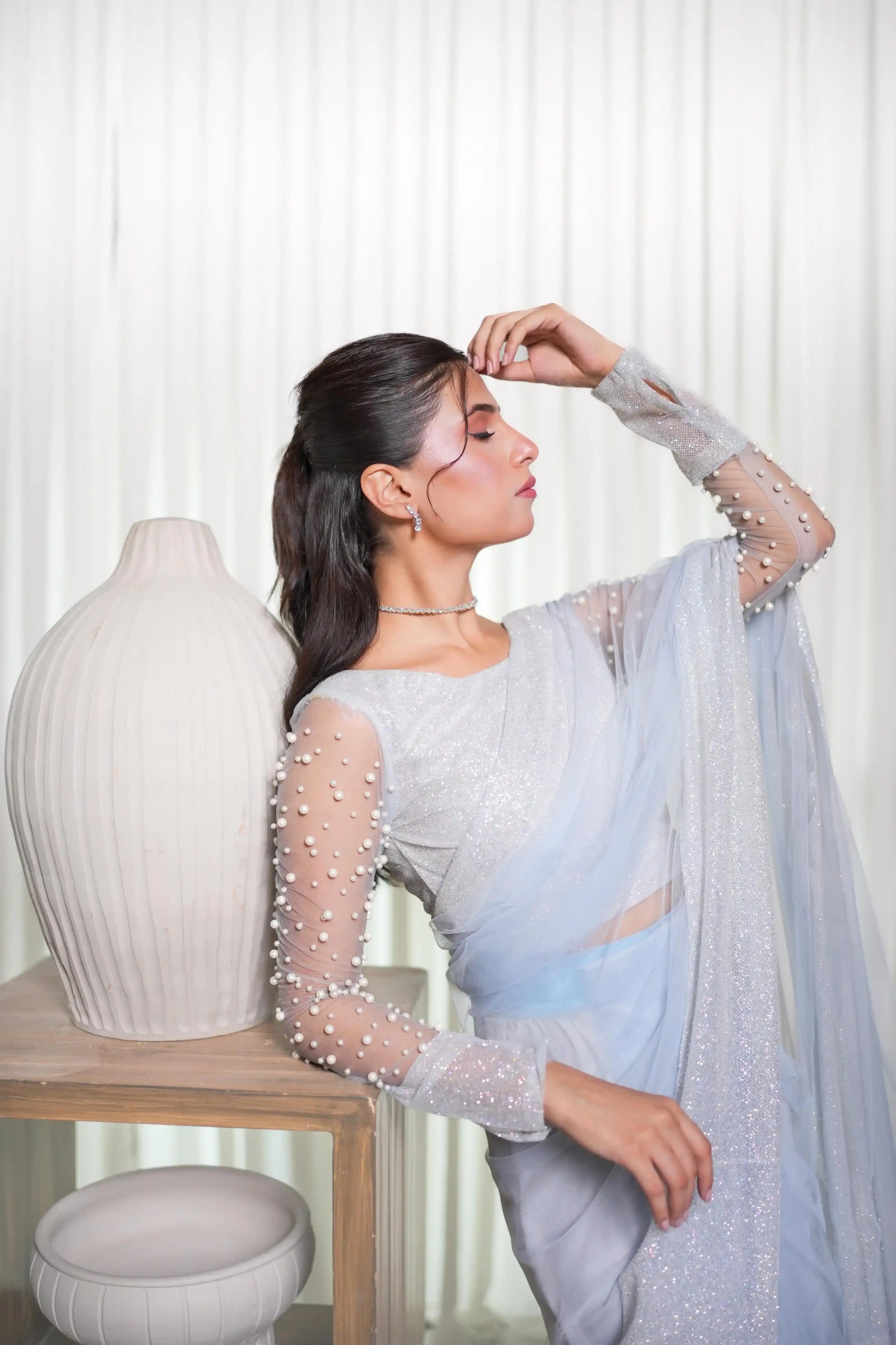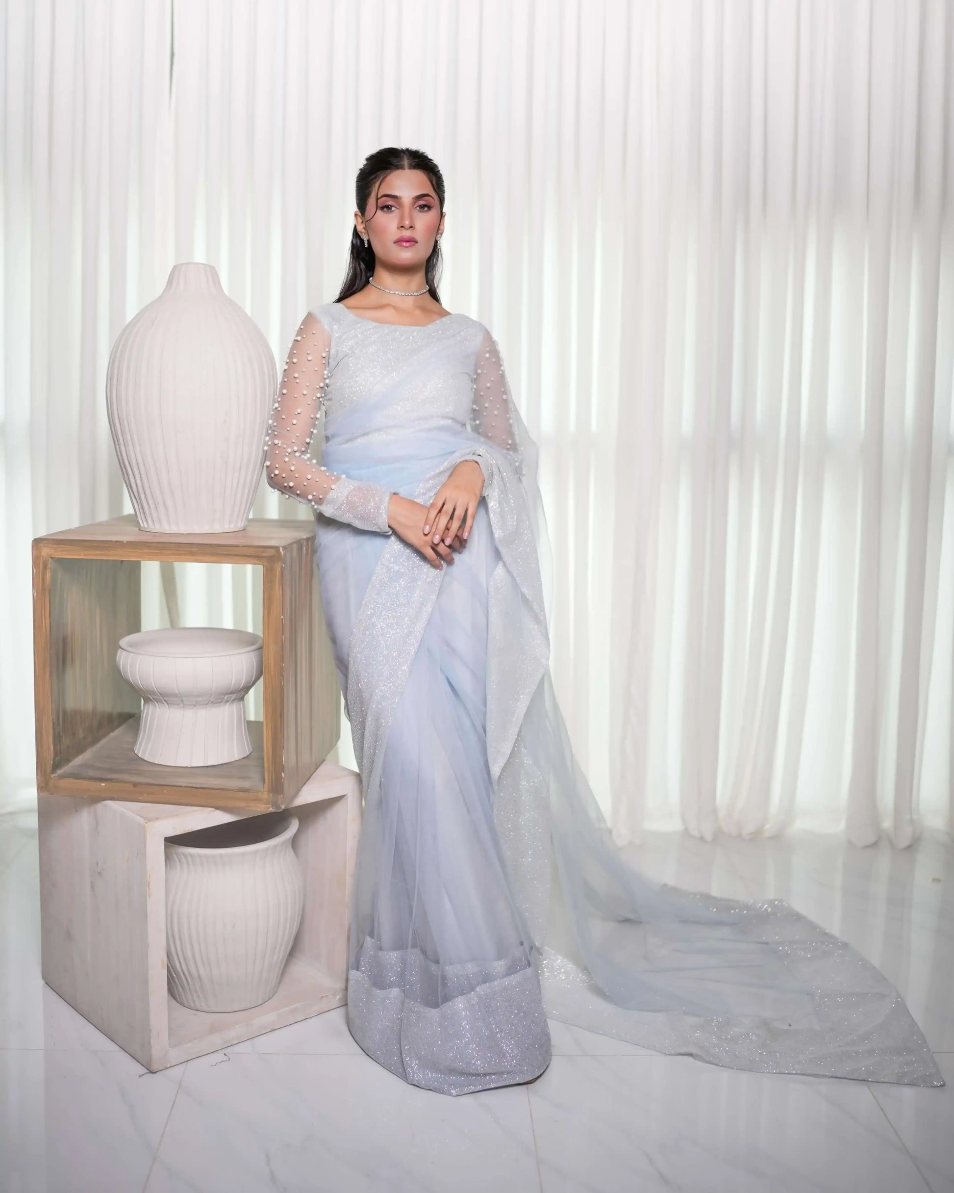 This graceful plain net saree, tailored with pleats and belt is paired with a shimmer net blouse featuring delicate pearl embroidery on the sleeves. The saree’s flowing silhouette is complemented by a malayi petticoat, providing both style and comfort throughout the day.