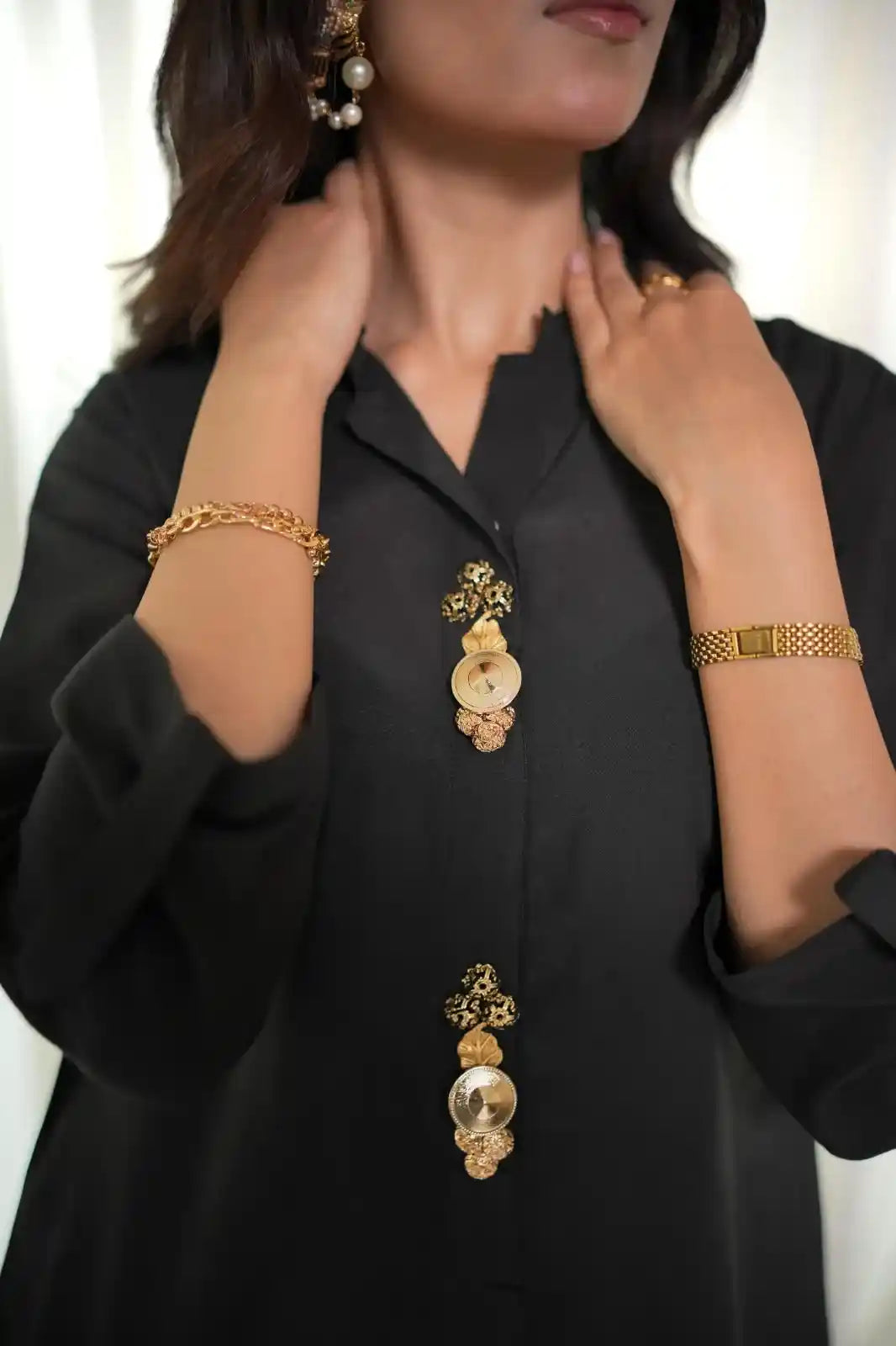 The two-piece outfit is crafted from soft loir lawn fabric, offering both comfort and style. The neckline is adorned with a unique bunch of gold buttons.