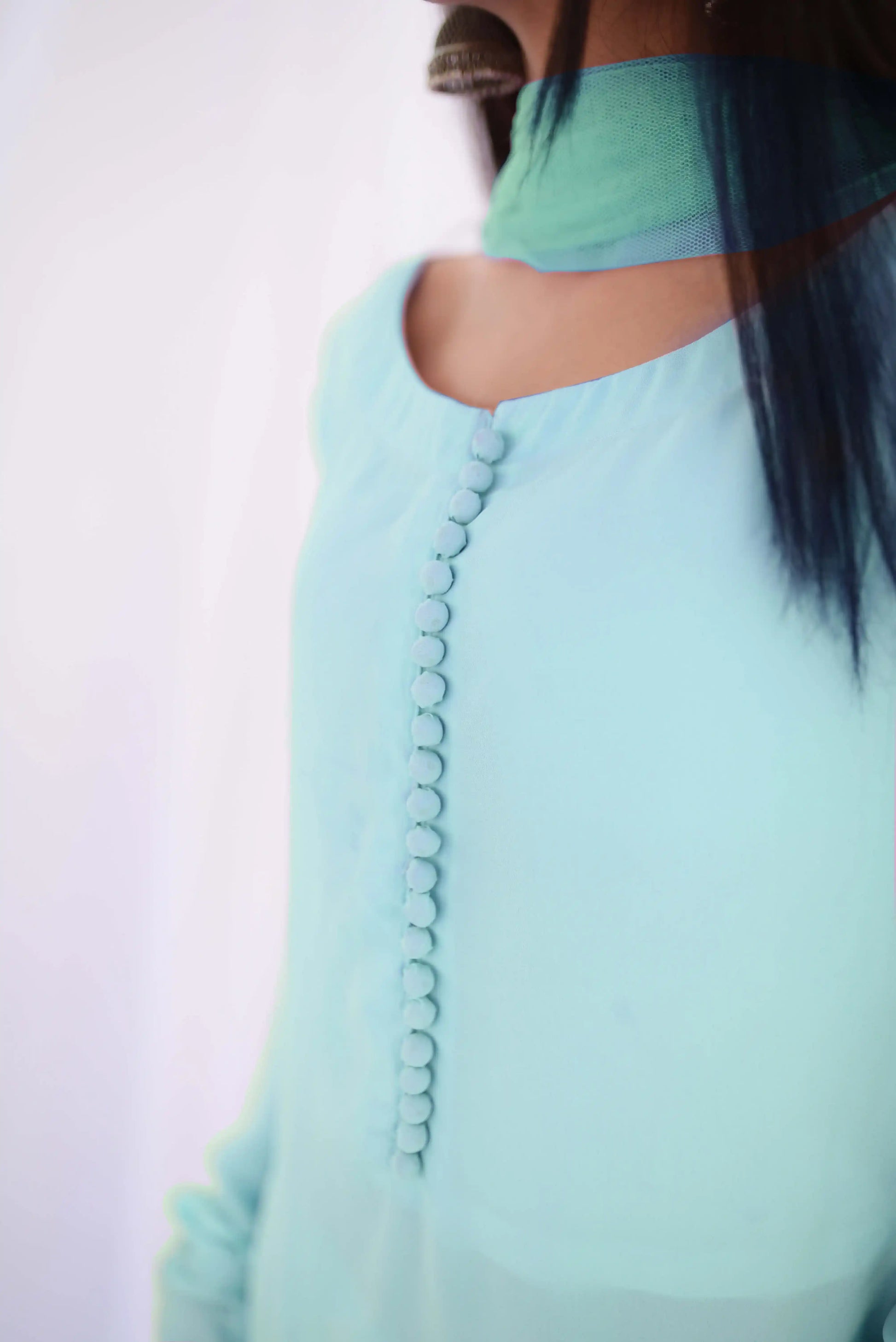 This elegant ice blue ensemble includes a double georgette shirt, matching shalwar, and a net dupatta. The soft, flowing fabric and vibrant hue create a graceful and refined silhouette, perfect for any occasion.