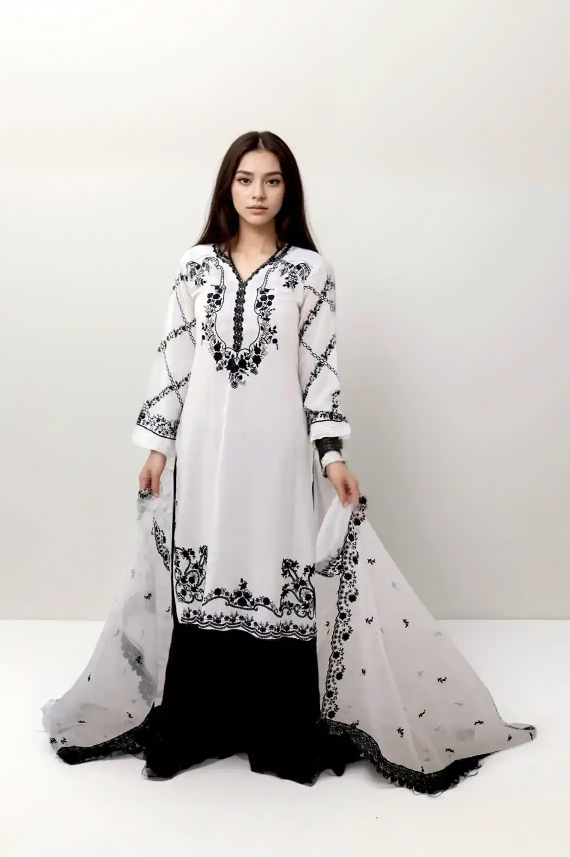 This straight-cut, relaxed-fit kurta is beautifully embroidered with black thread detailing, exuding elegance and charm. The 2.5-yard dupatta enhances the look with its two-sided embroidery and crochet lace embellishments, making it a versatile choice for festive and semi-formal occasions.