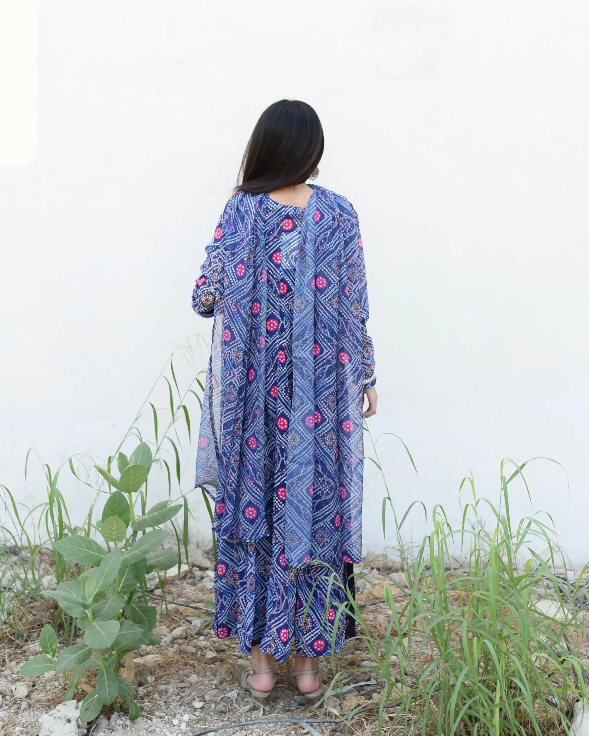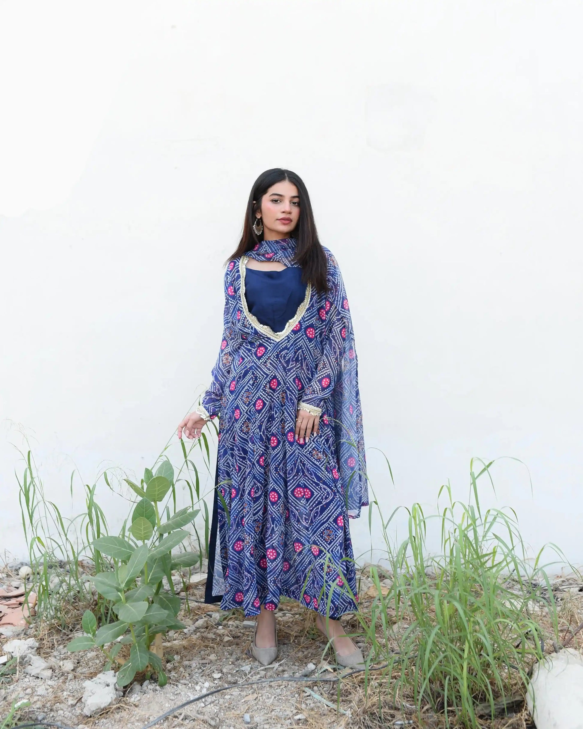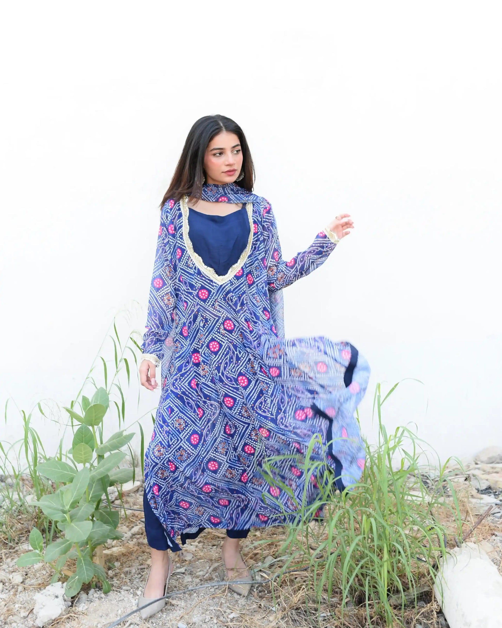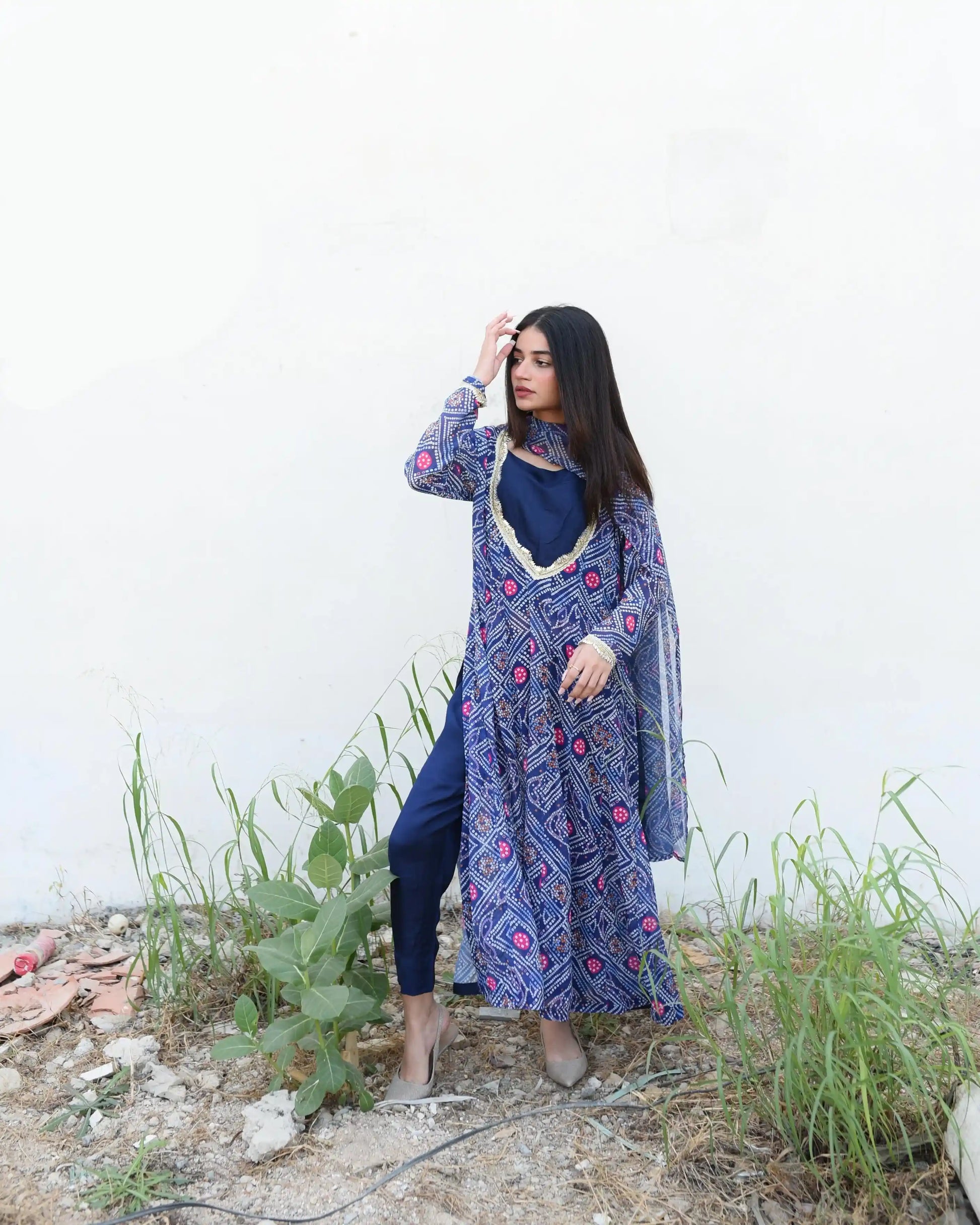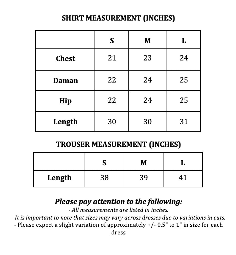This three-piece set features a stunning chiffon shirt with a chak open kalidaar frock cut. The neckline and sleeves are beautifully embellished with intricate mirror work, adding a touch of sparkle. Paired with a matching cotton silk bottom and inner.