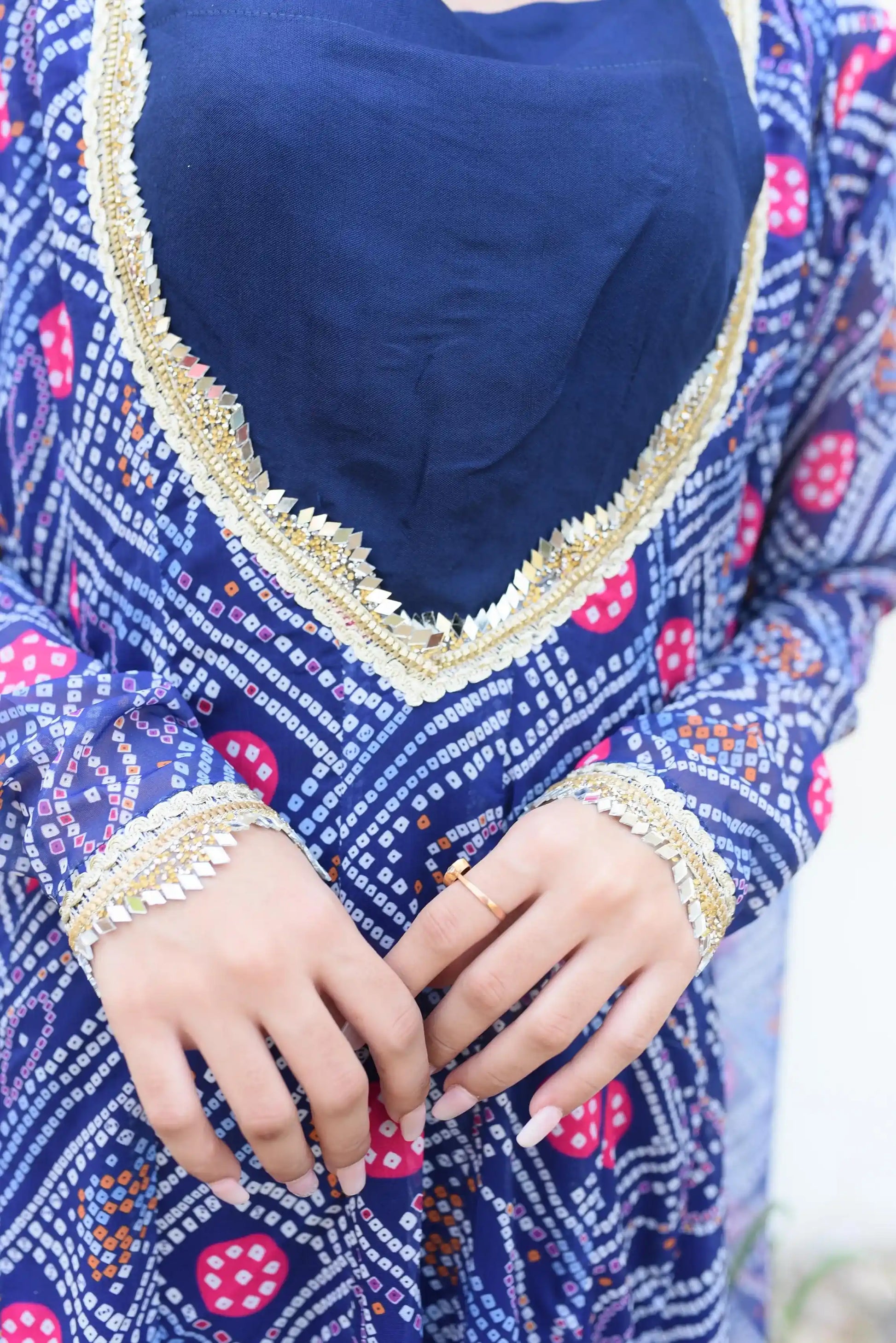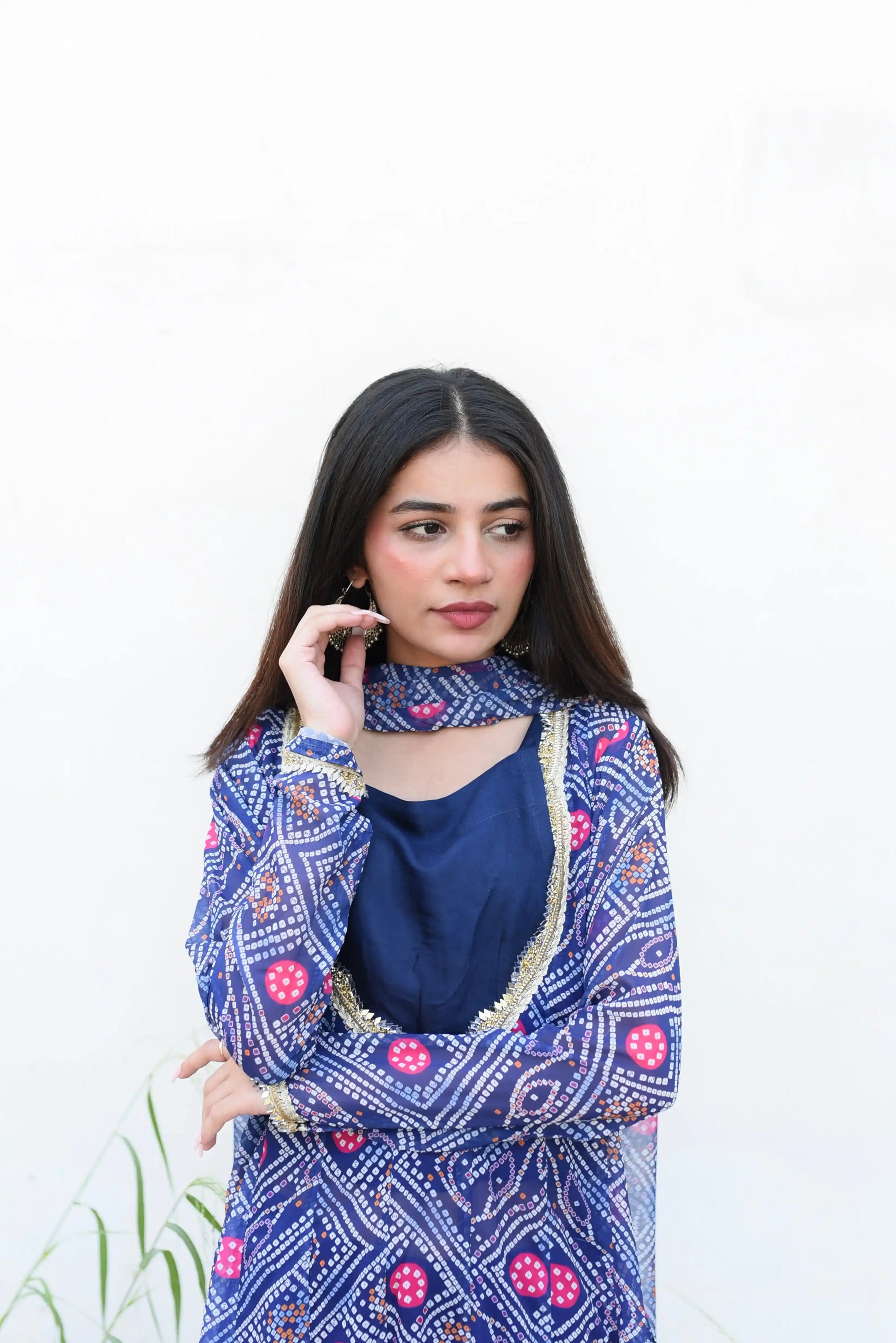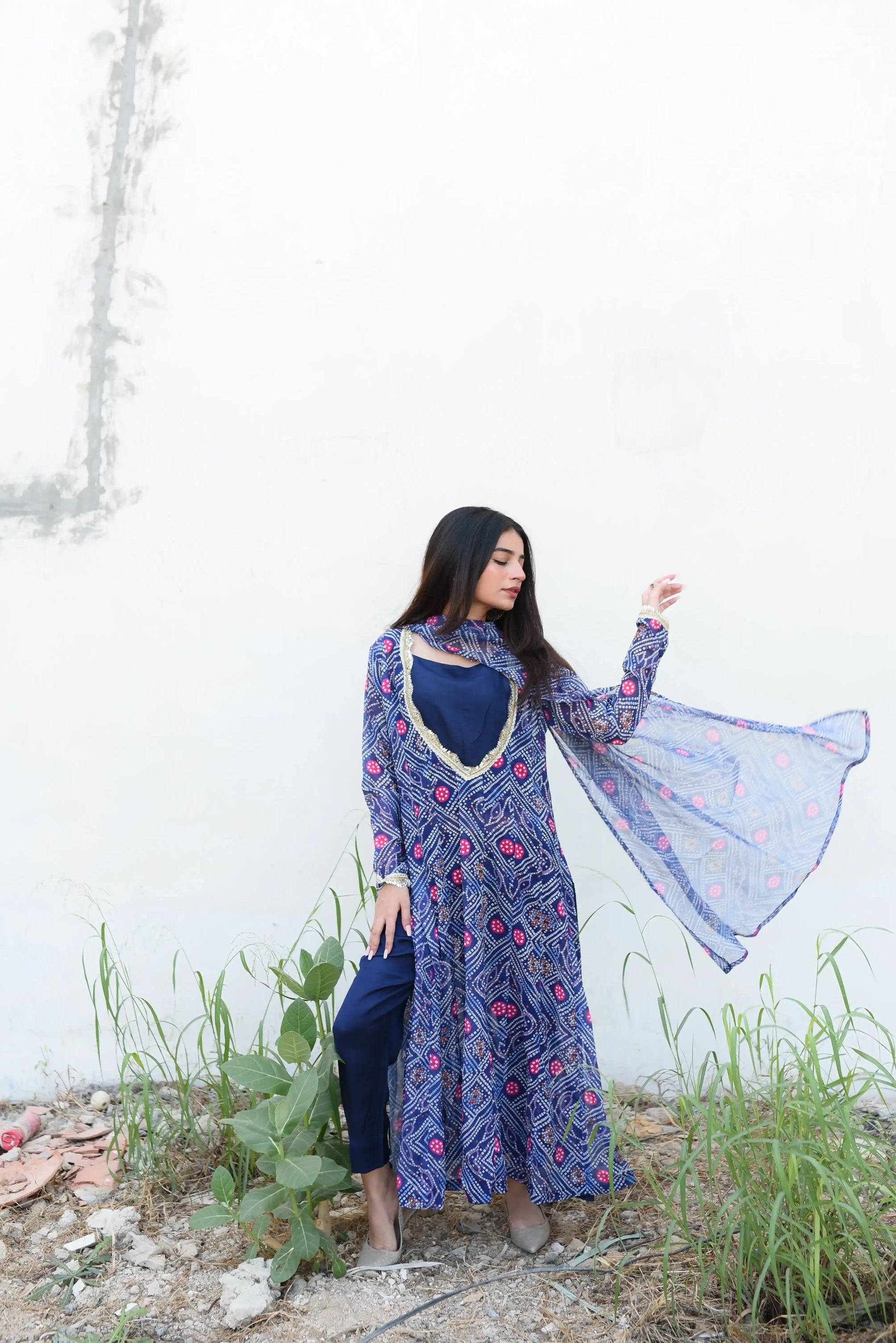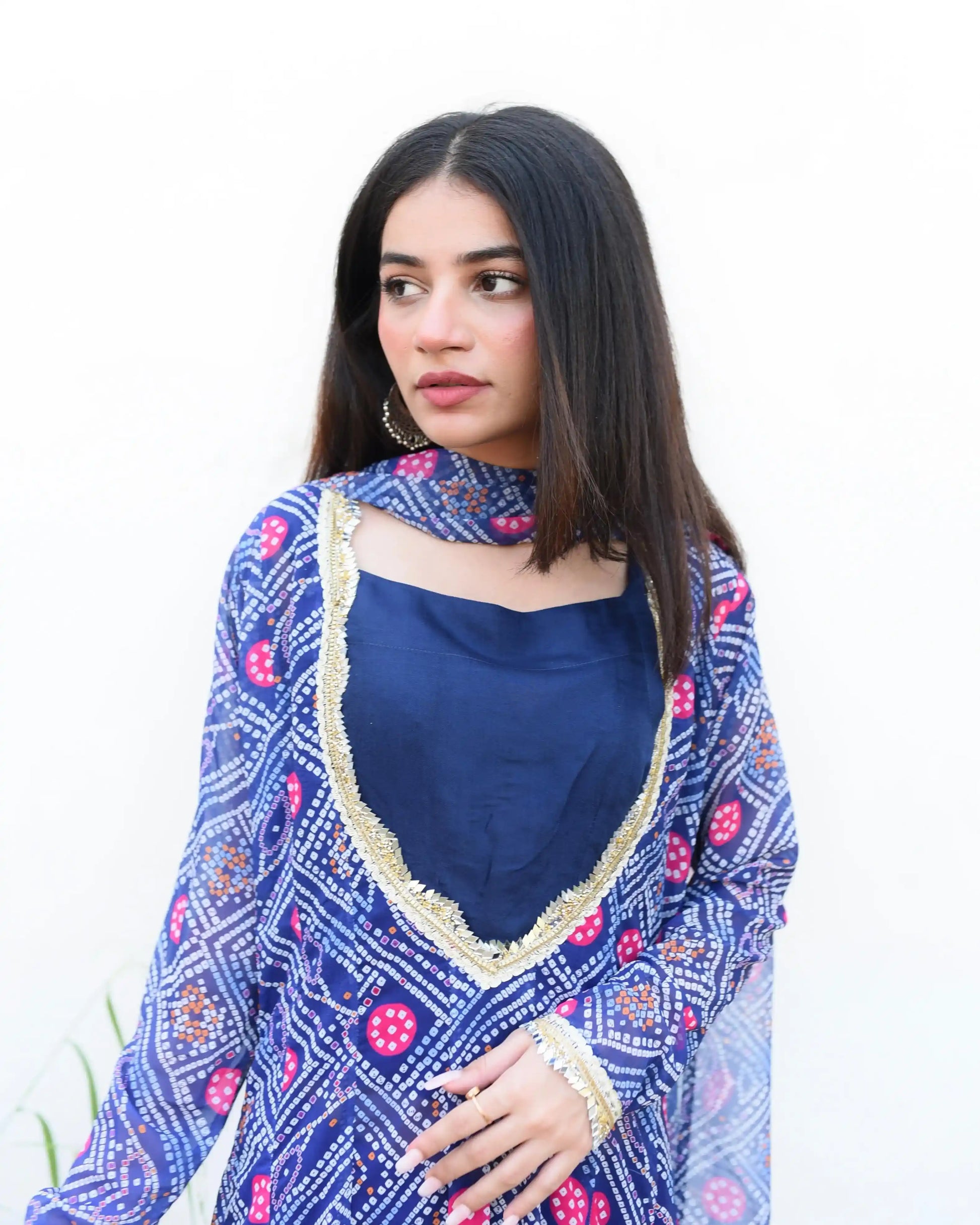 This three-piece set features a stunning chiffon shirt with a chak open kalidaar frock cut. The neckline and sleeves are beautifully embellished with intricate mirror work, adding a touch of sparkle. Paired with a matching cotton silk bottom and inner.