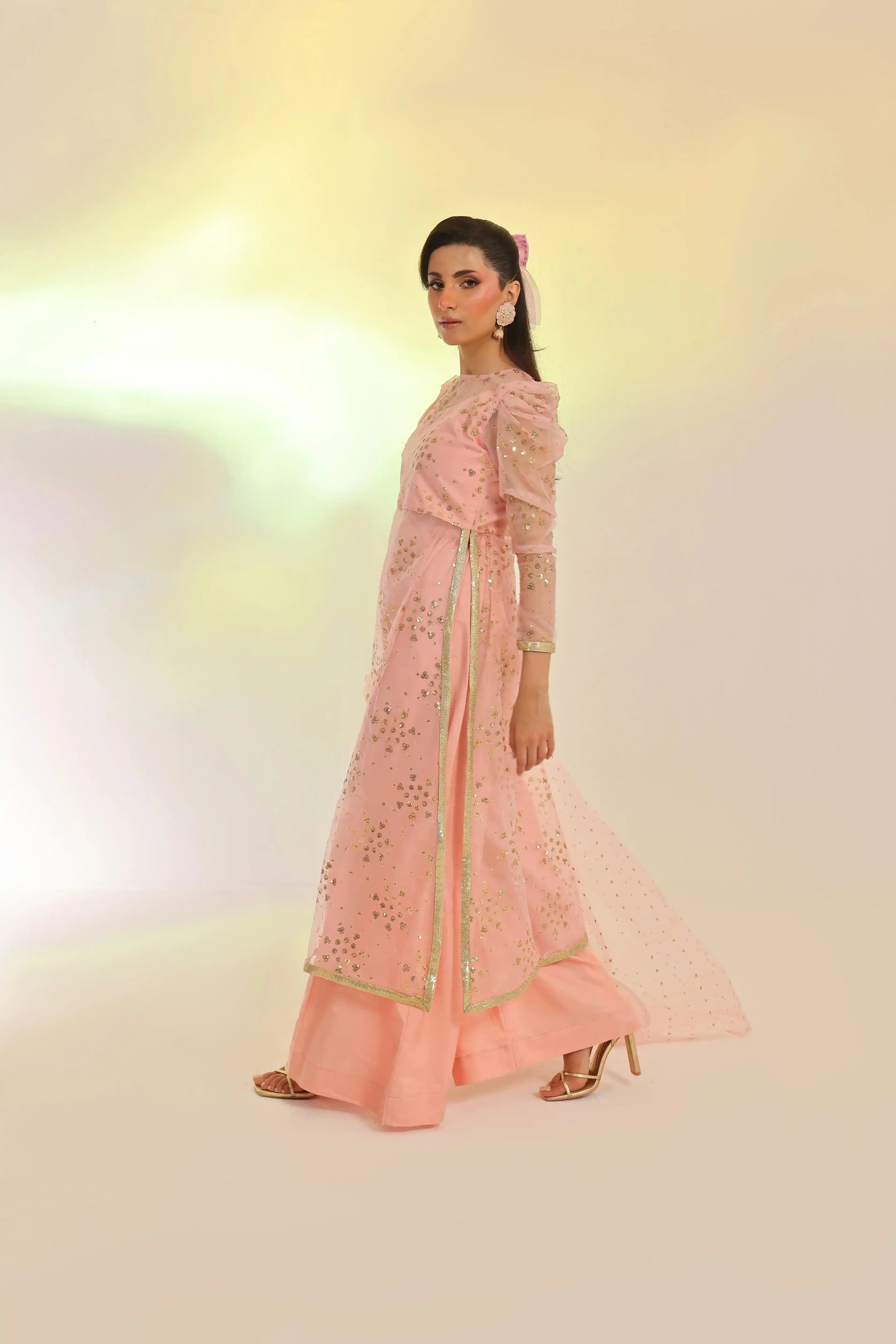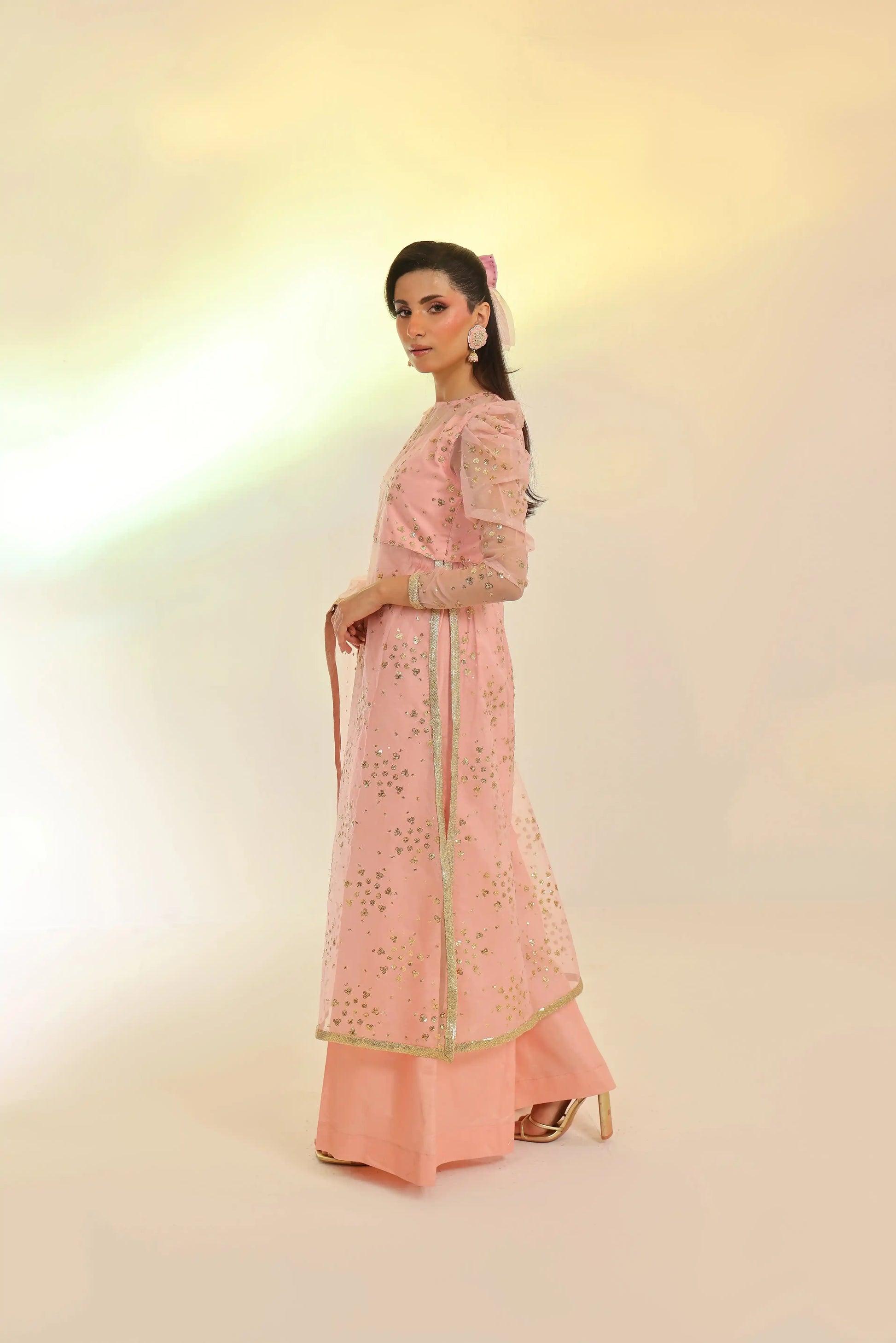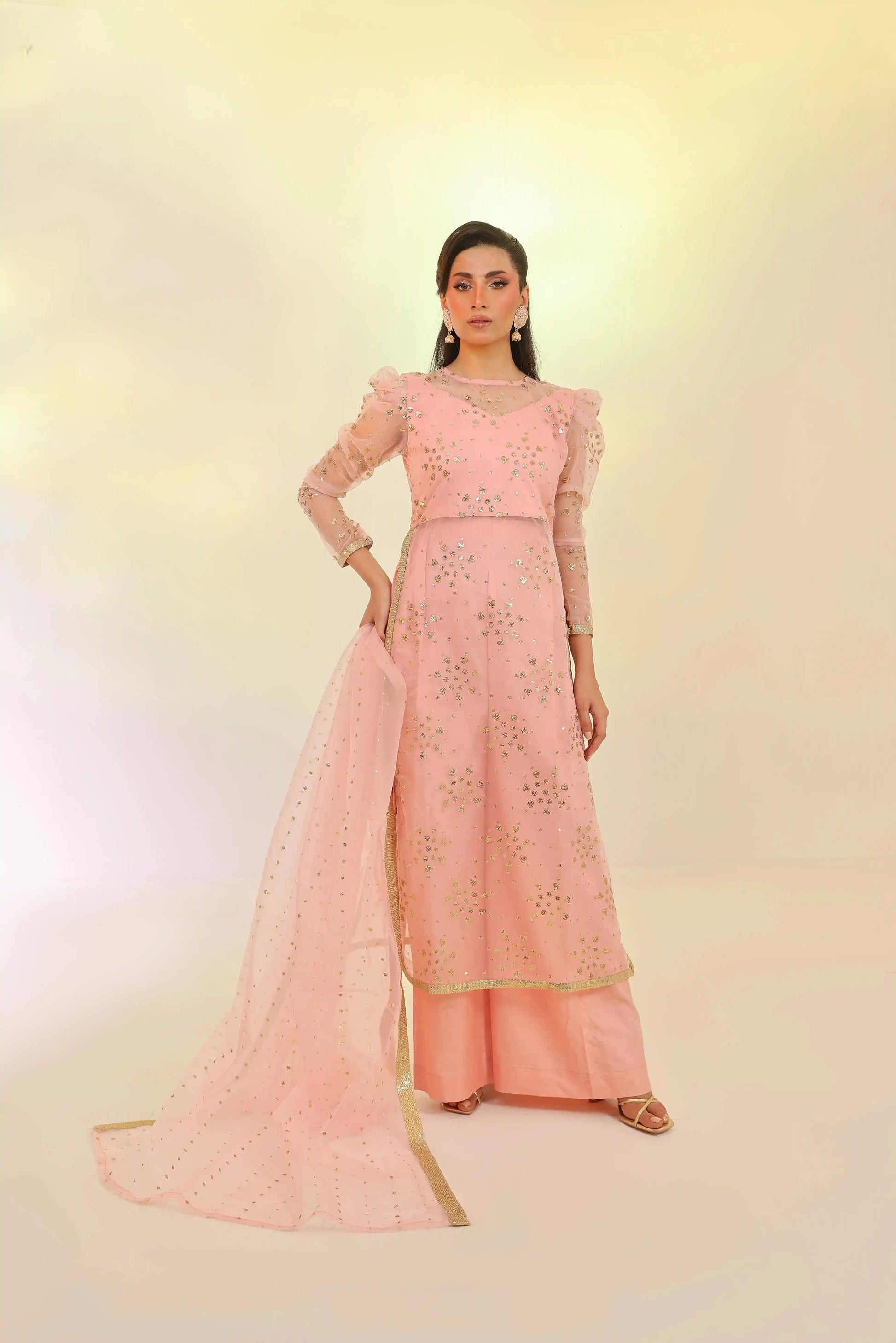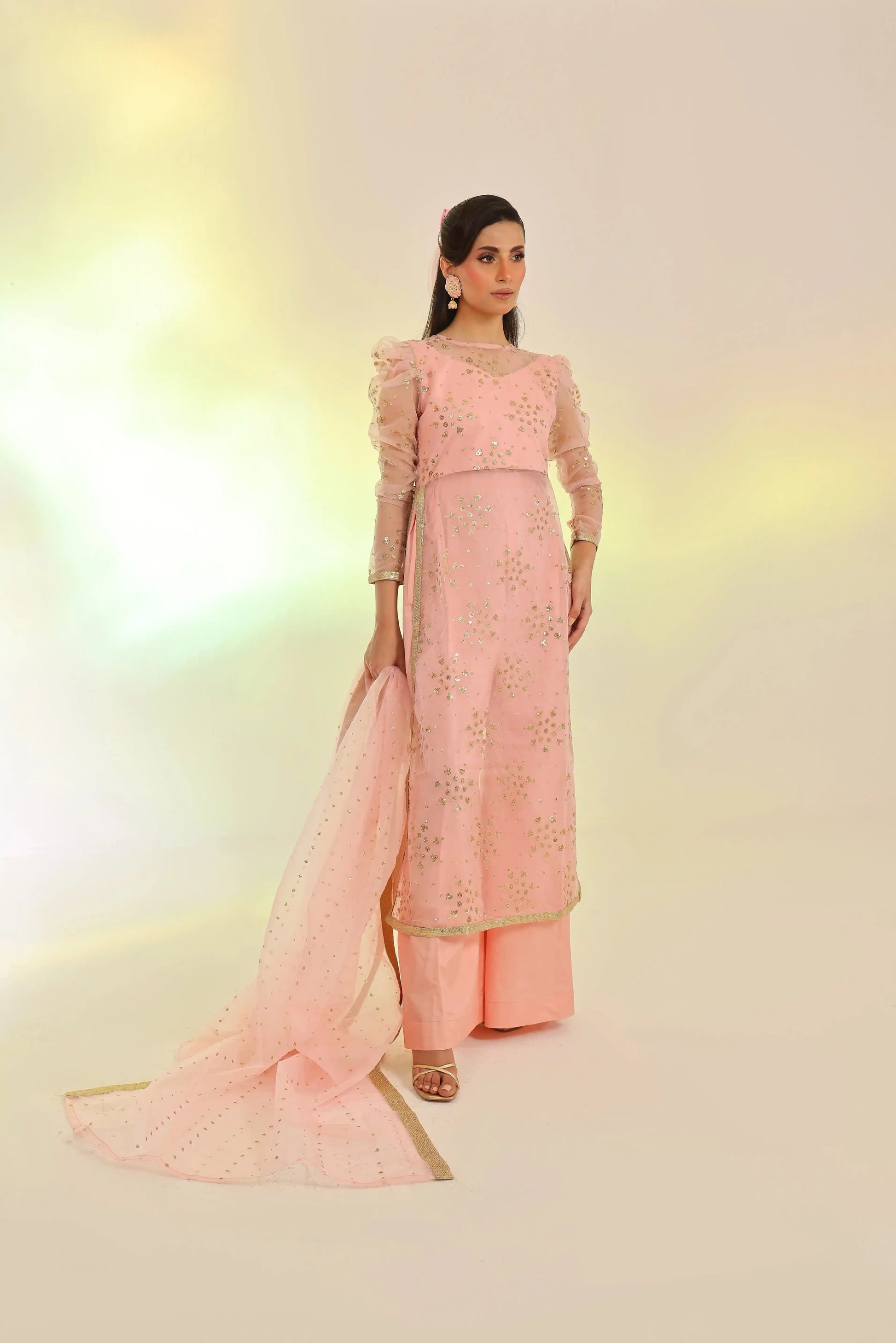 This elegant 3-piece set features a pink organza shirt with sequin embroidery, paired with flared Russian silk culottes. The shirt is designed with a halter neckline and puffy sleeves. The luxurious organza dupatta is embroidered with gold sequins, adding a sophisticated finishing touch.
