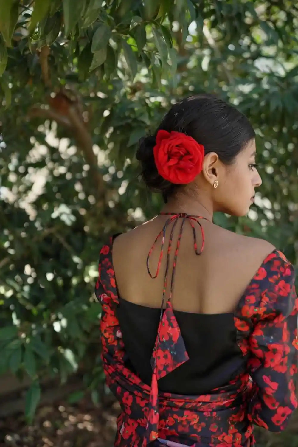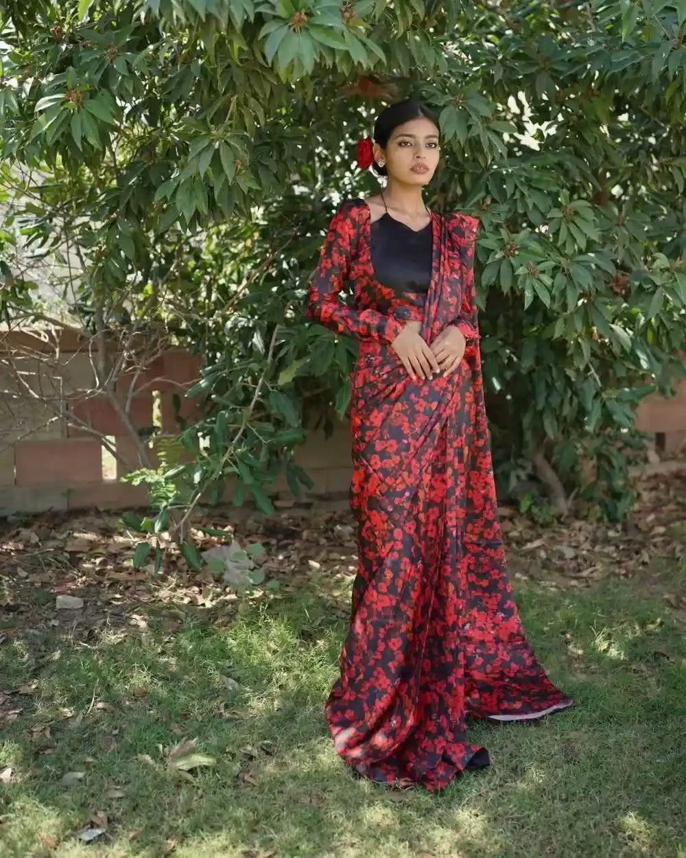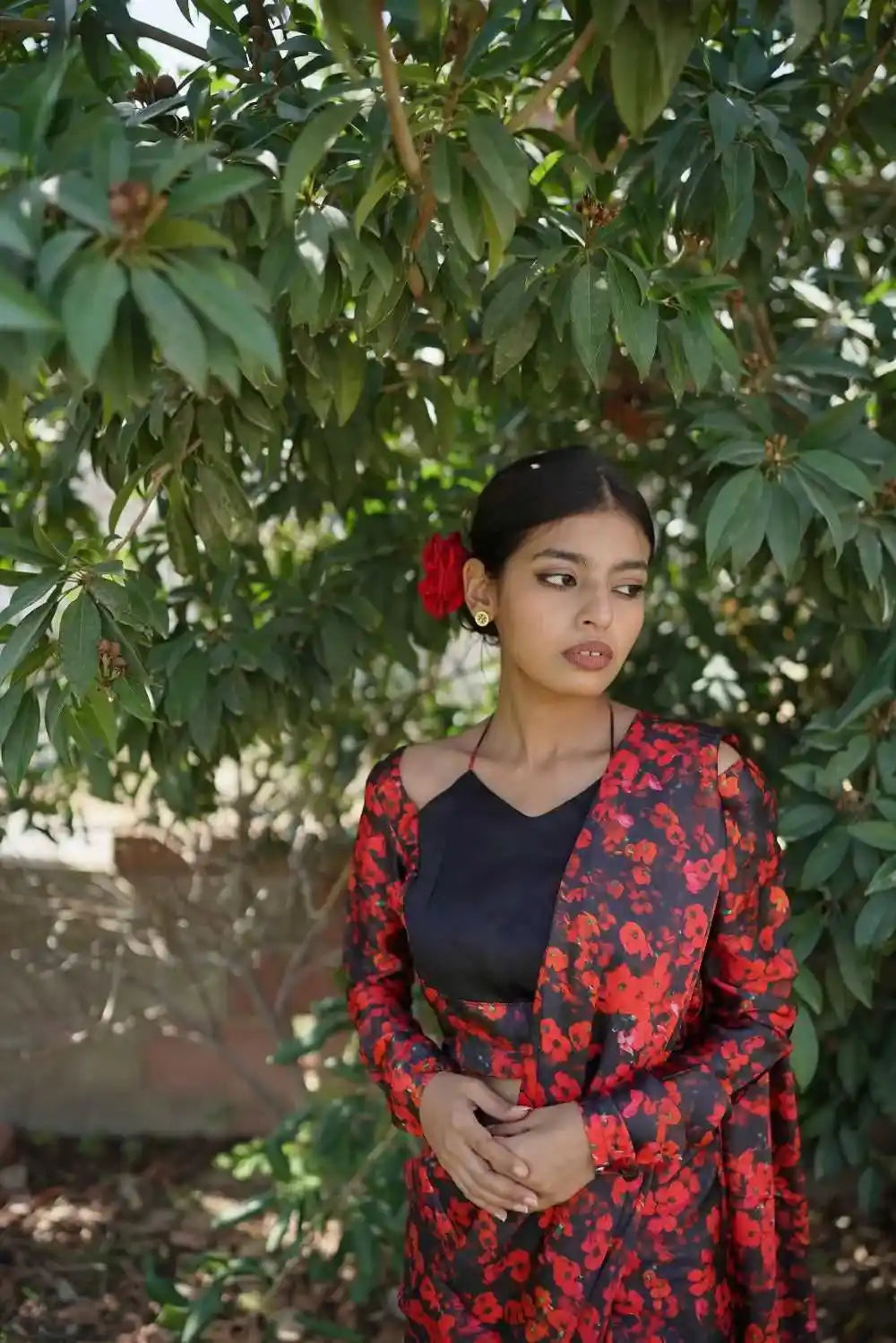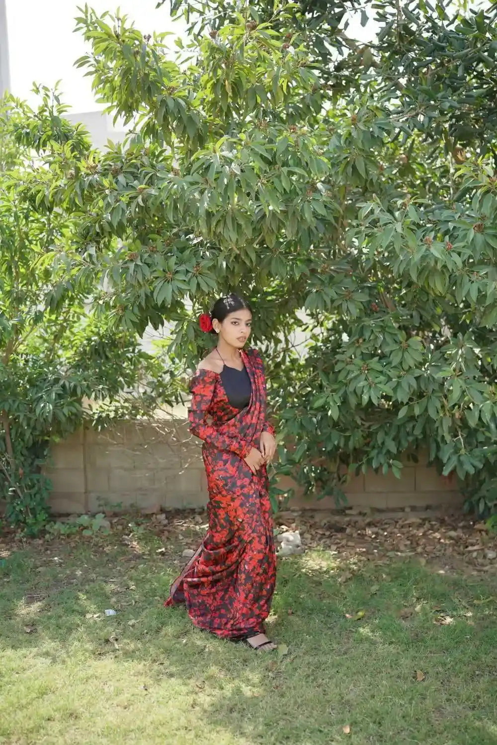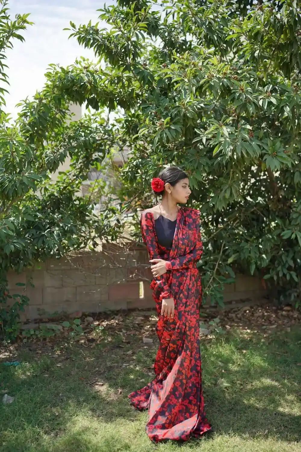 The saree showcases a vibrant red color embellished with delicate floral patterns. The soft, flowing fabric drapes gracefully, accentuating your curves and creating a mesmerizing silhouette. Complementing the saree is a double neck blouse with a unique design featuring two necklines, adding an extra touch of elegance to the ensemble.