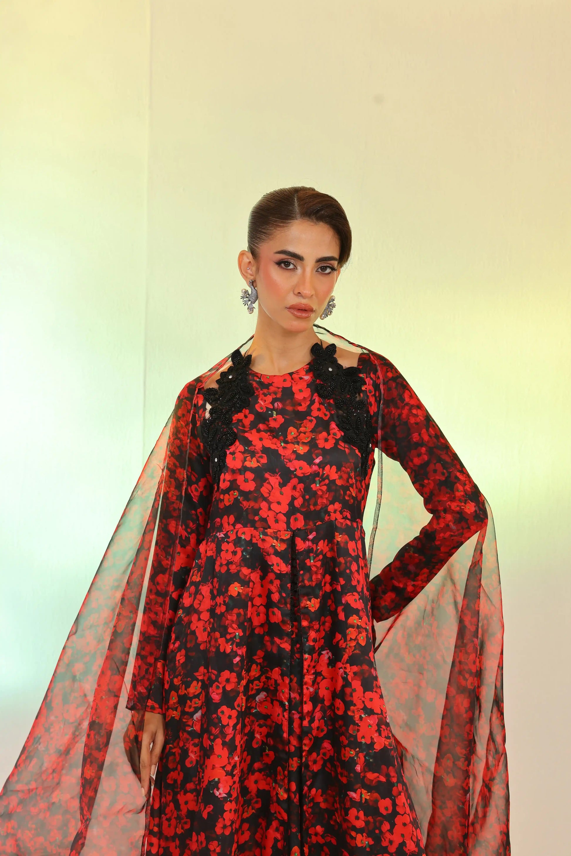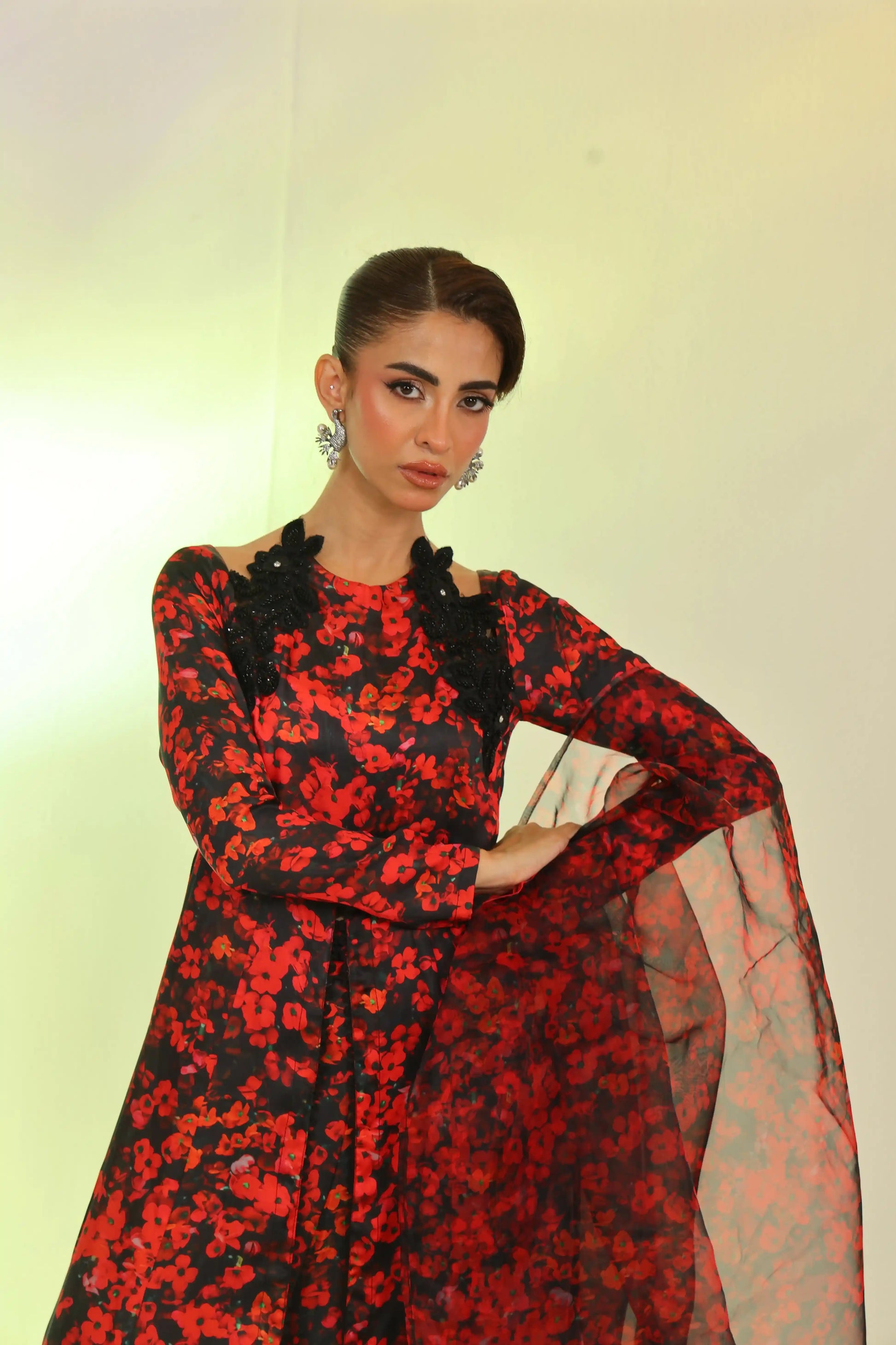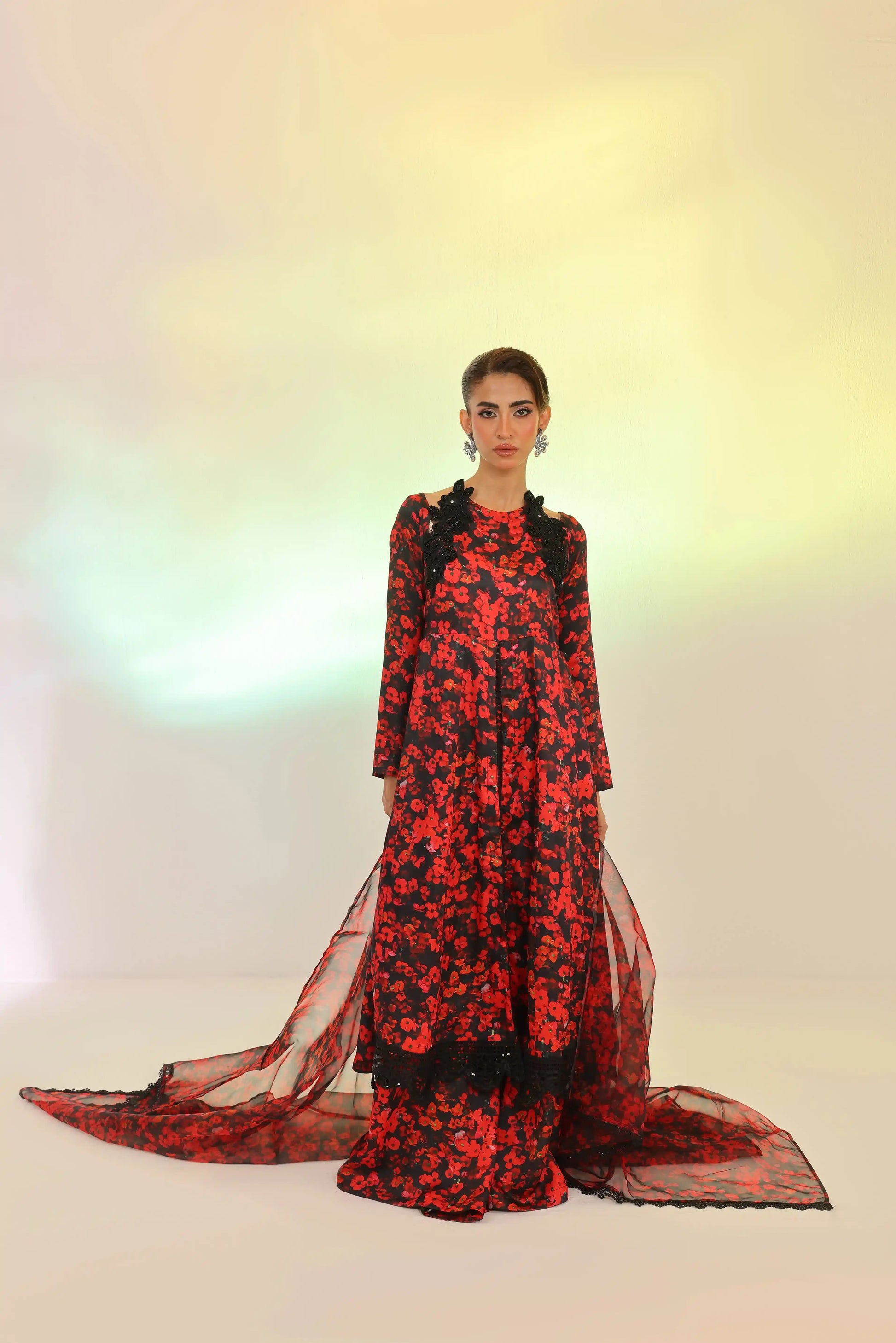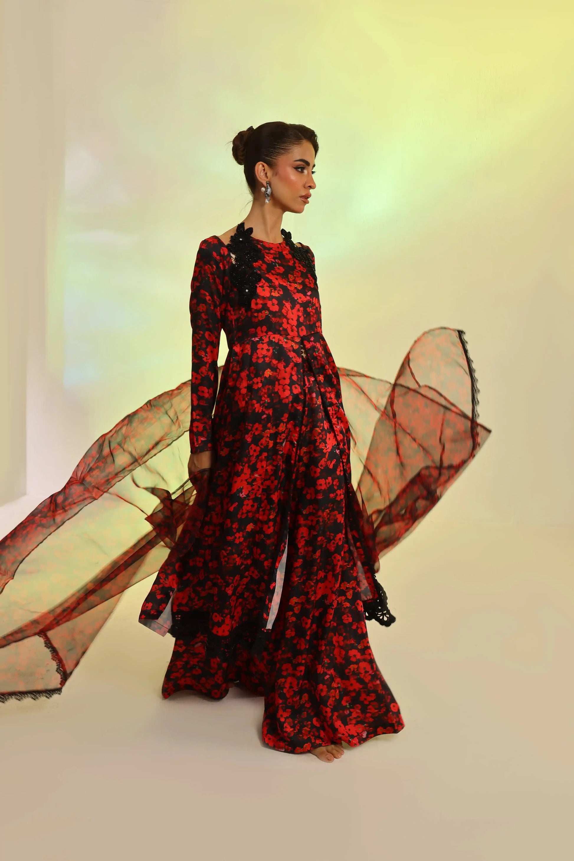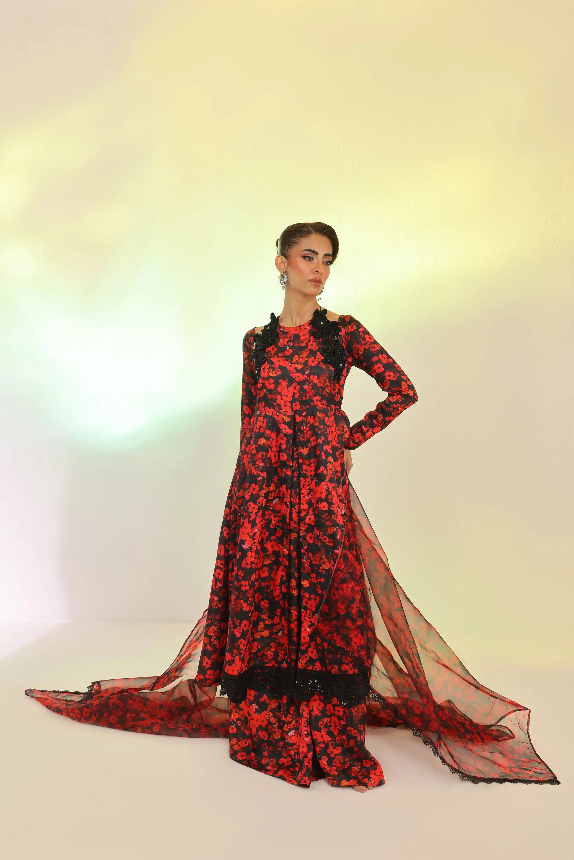 Make a bold statement this Eid with this red and black printed silk 3-piece set. The embroidered silk shirt with cutdana detailing and sequin lace on the daman, paired with flared dhaka pants and an organza dupatta with lace borders, exudes refined elegance.