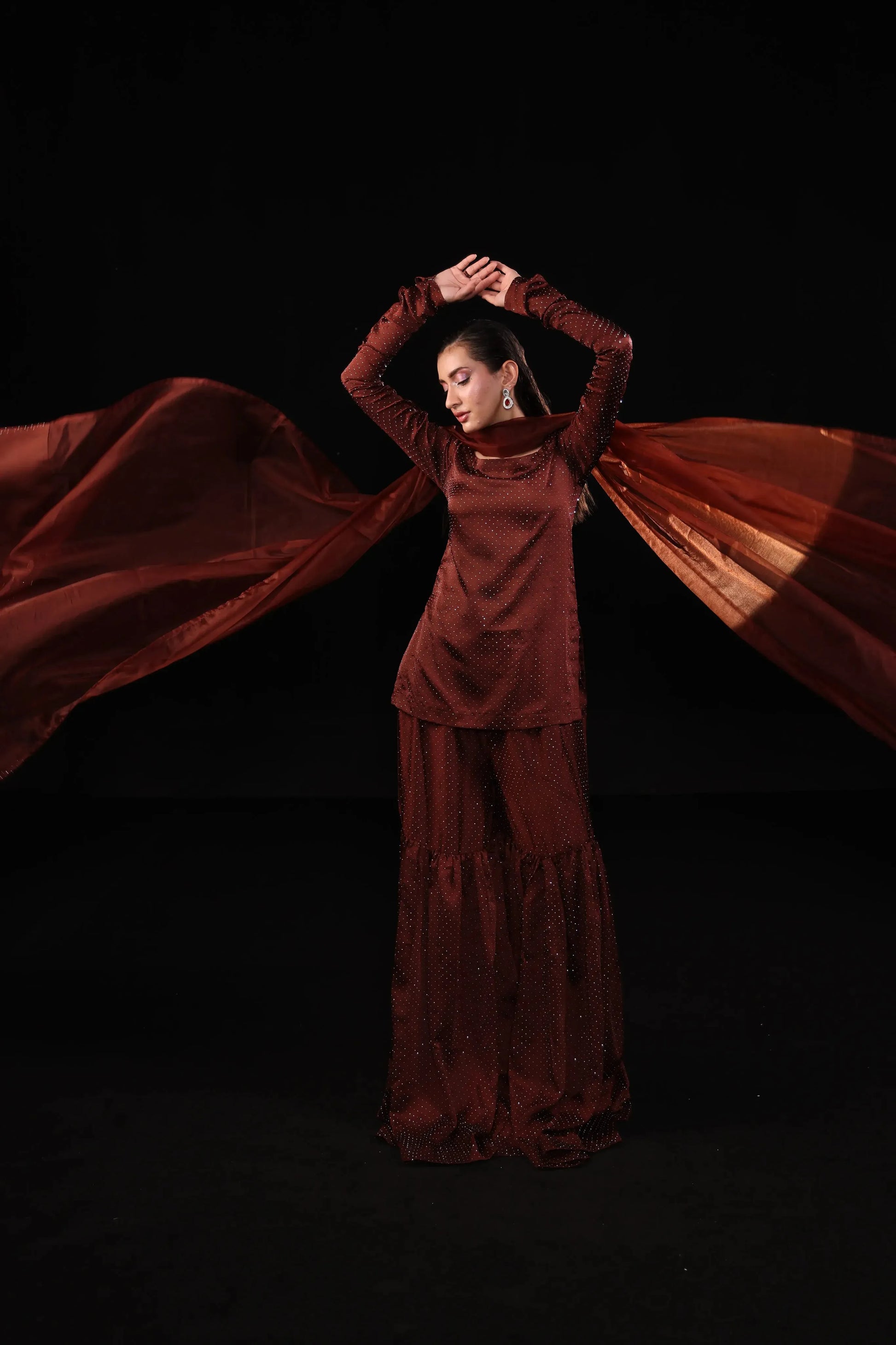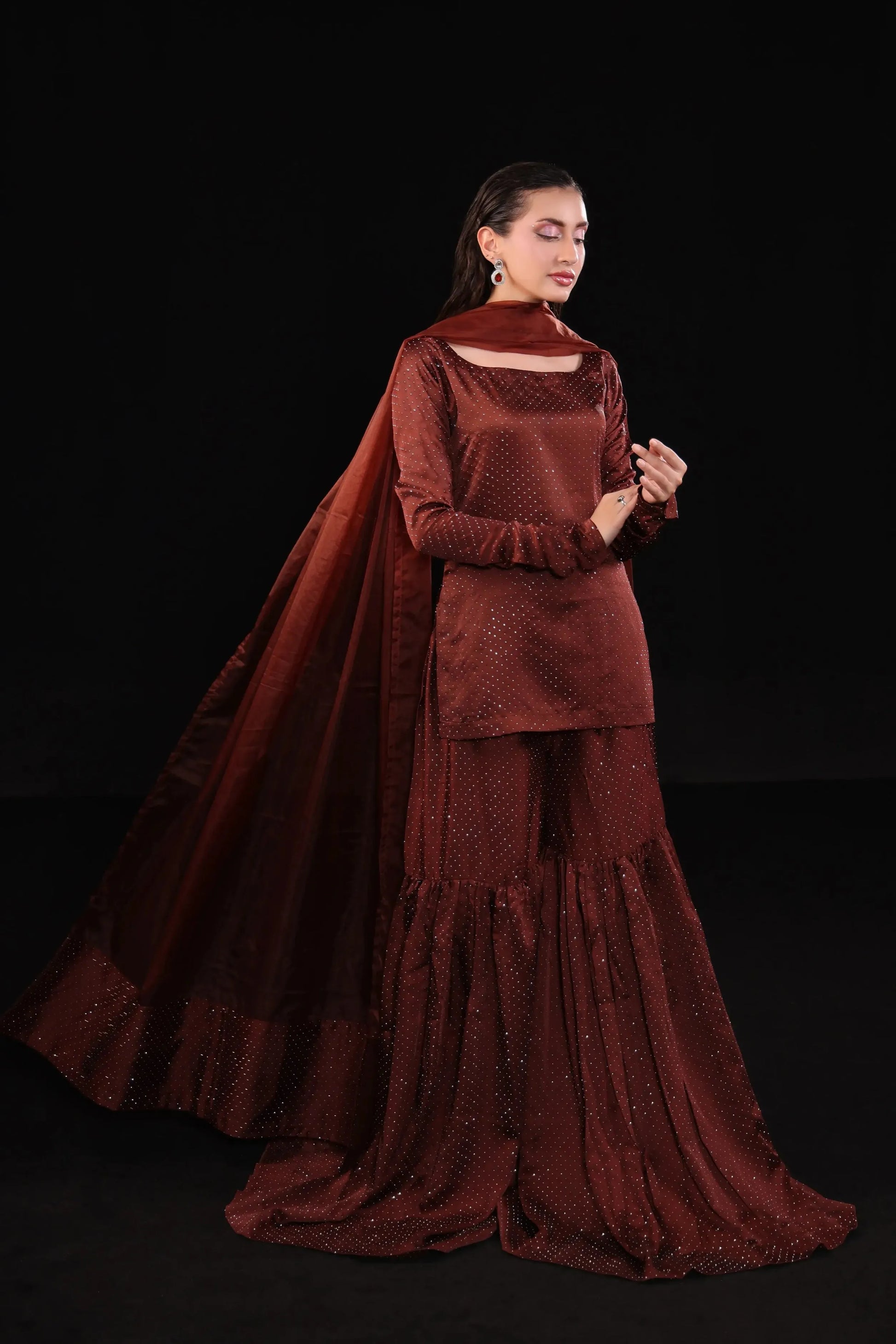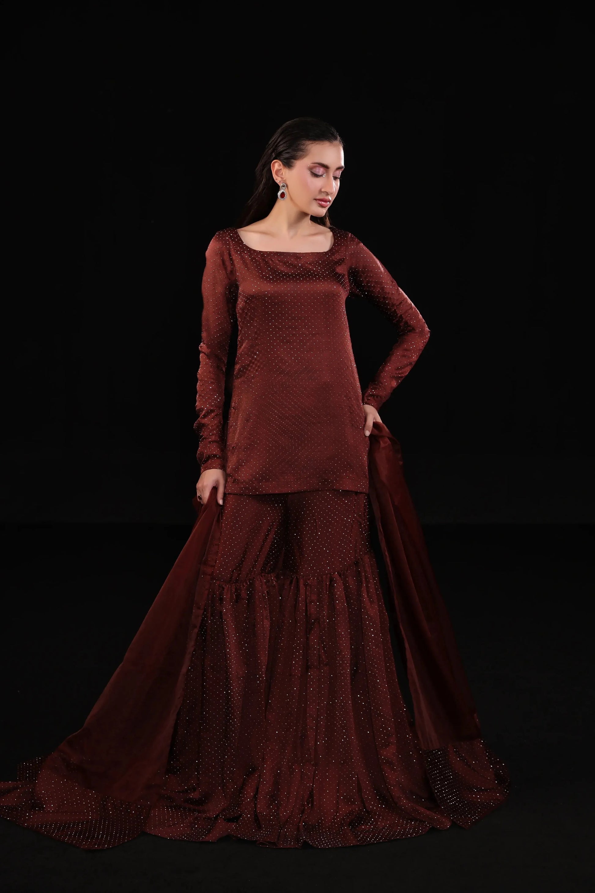 The Heiress is a tribute to timeless grandeur with a touch of modern finesse. Crafted in a rich brown hue, this flared gharara boasts traditional stitching that echoes heritage charm. The short length shirt with fitted sleeves flatters the silhouette, while rhinestone studded embellishment & organza dupatta adds a graceful shimmer to every movement. It’s nostalgic yet unmistakably luxe.