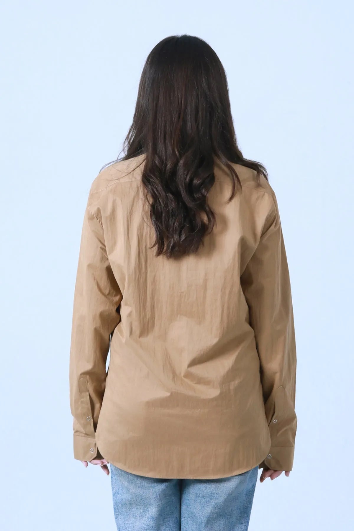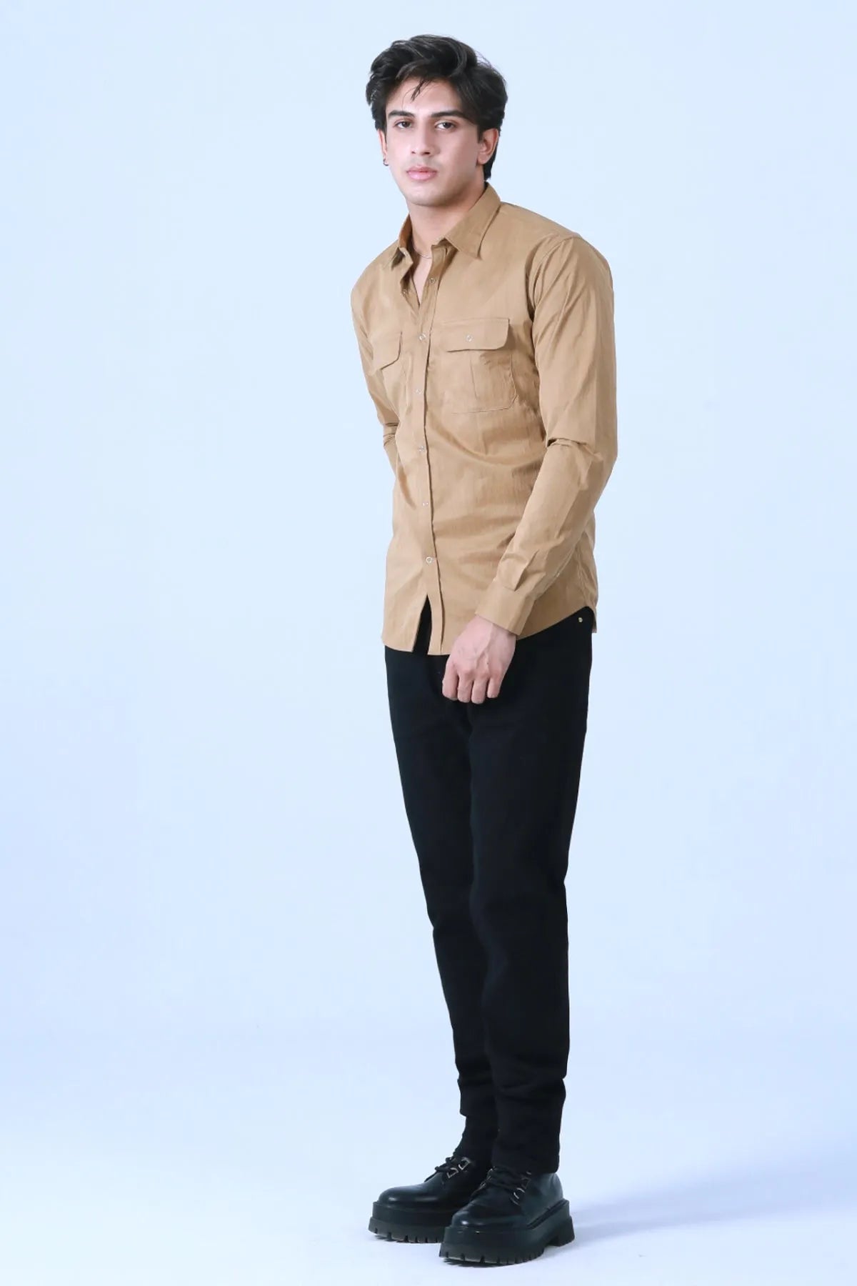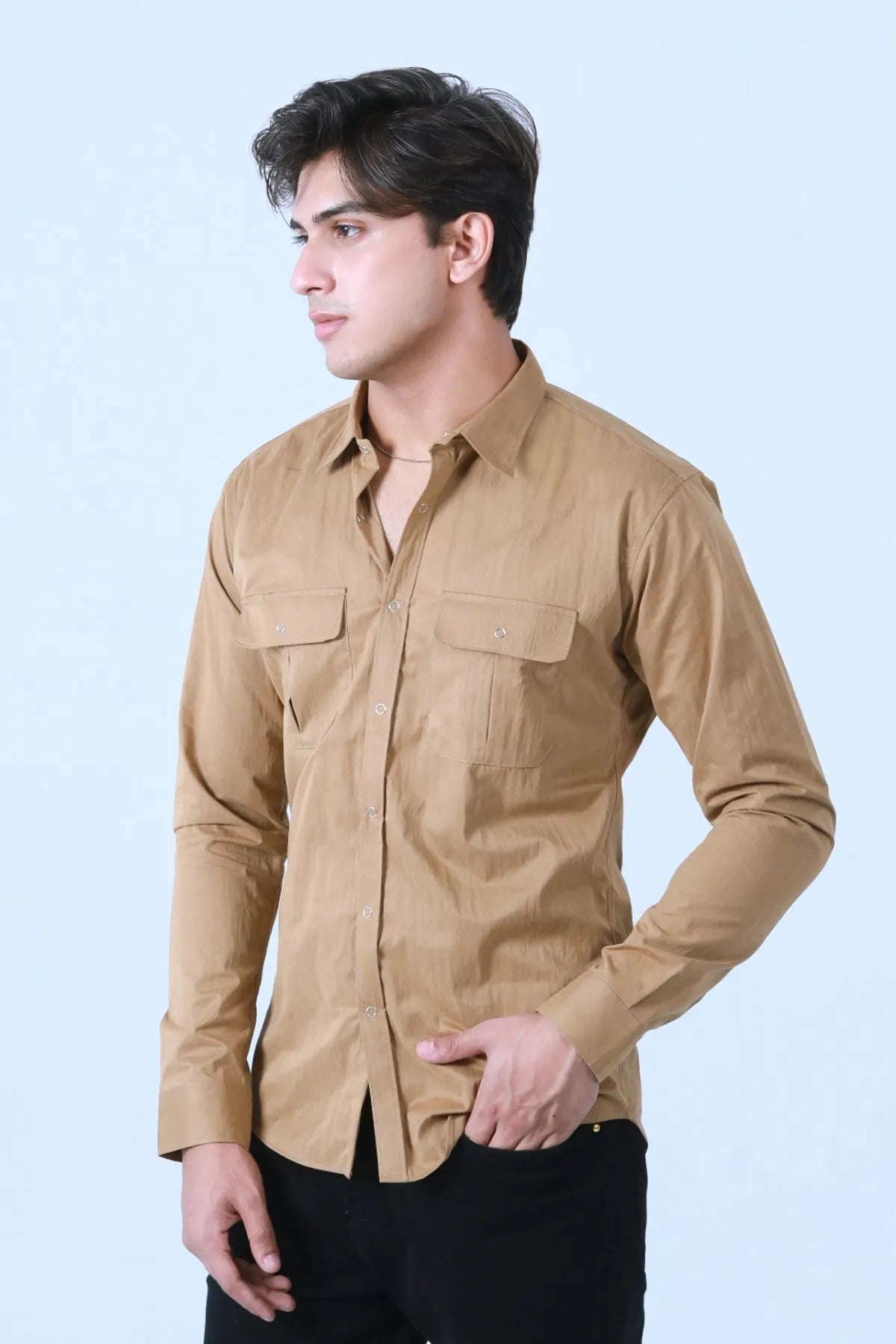 "Reinvent your wardrobe with our Crinkle Satin Full Sleeve Shirt, meticulously designed to combine elegance and practicality. Crafted from crinkle satin, this shirt offers a silky feel and a touch of luxury. The versatile khaki color adds a timeless charm to your ensemble.