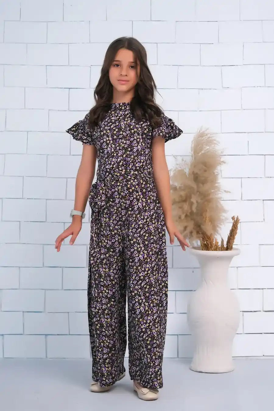 Black Allover Lavender Floral Print Butterfly Sleeve Shirred Jumpsuit