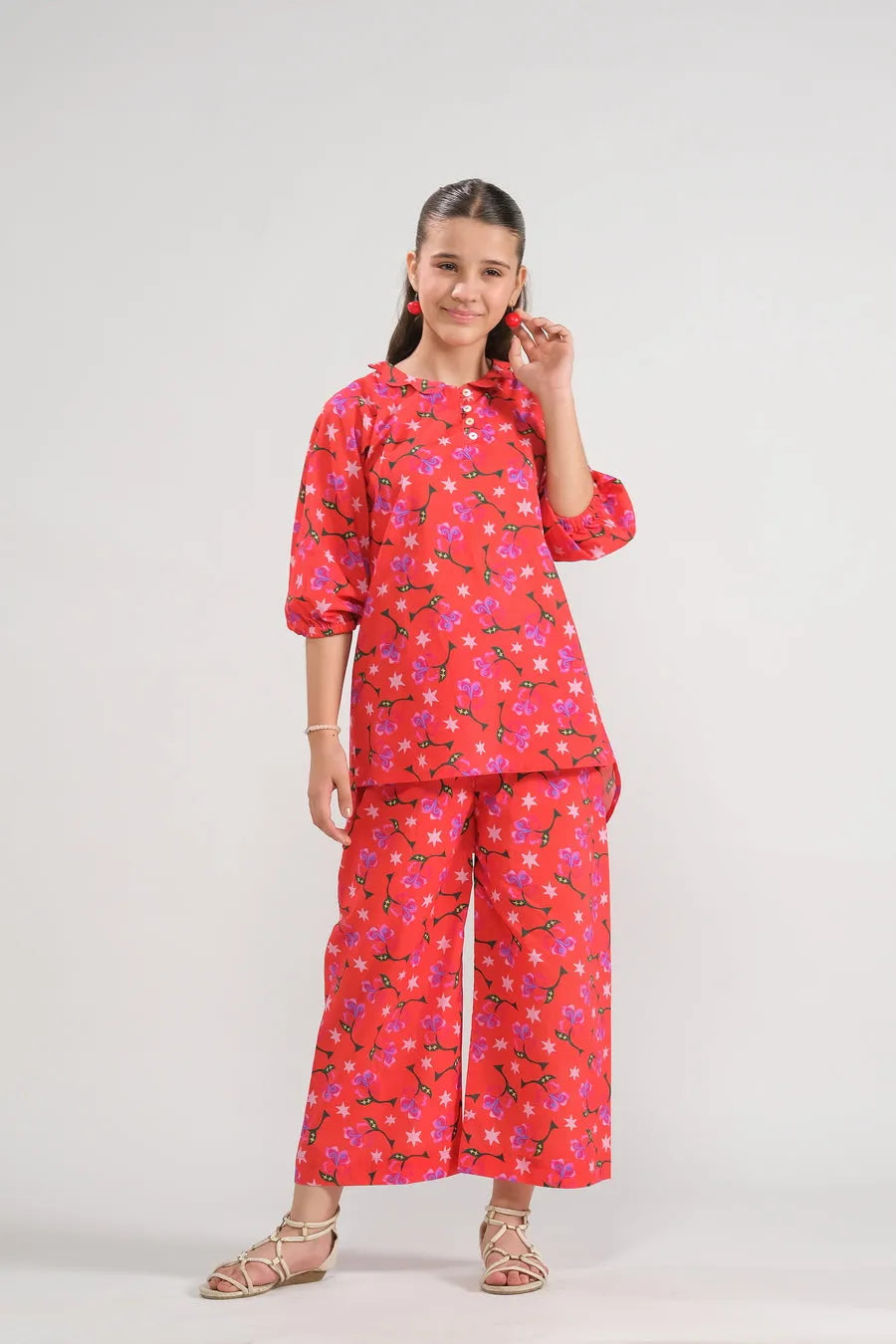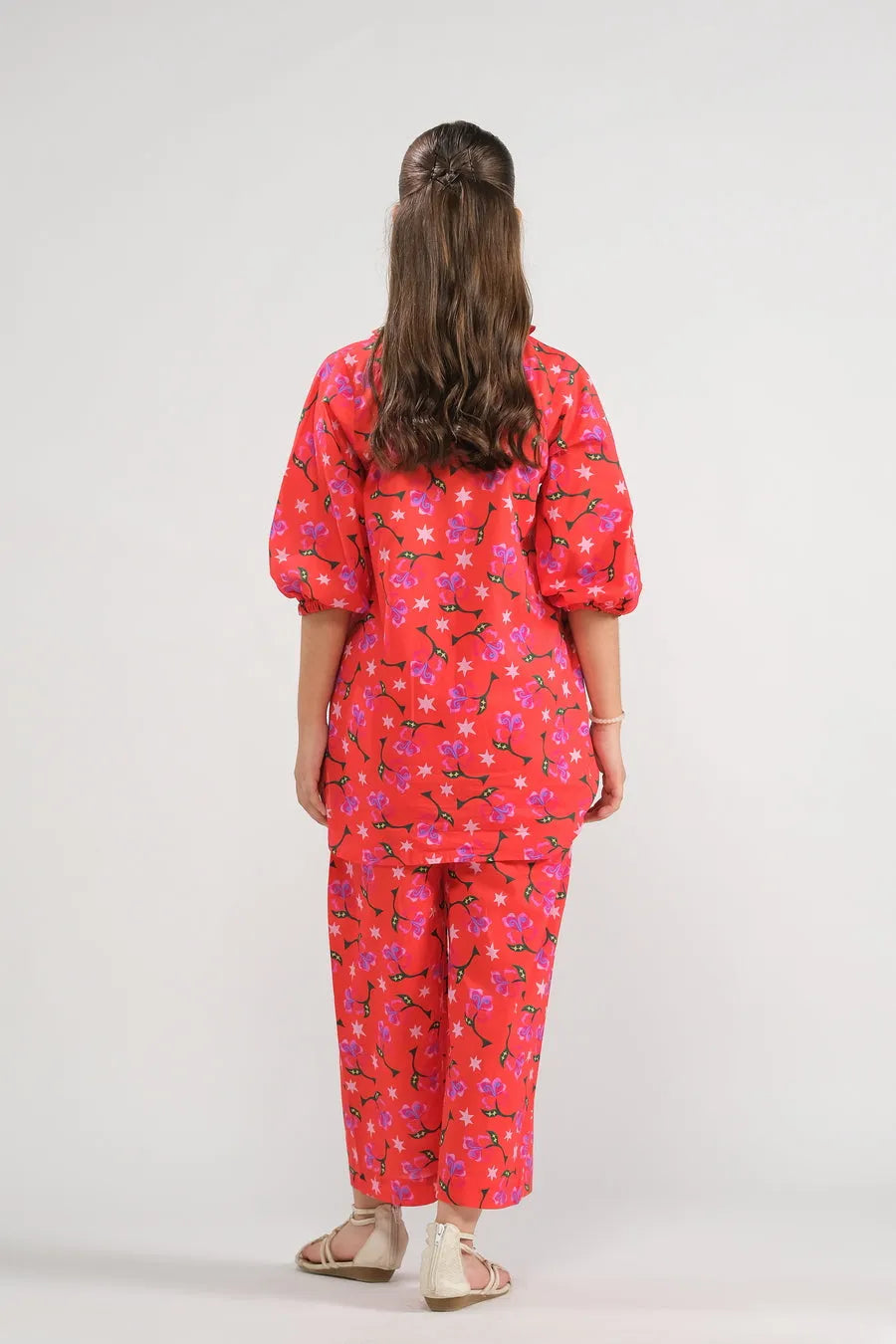 Embrace playful charm with this vibrant red two-piece set, featuring delicate floral patterns and relaxed fit. Puffed sleeves add a touch of whimsy, making this outfit perfect for bright spring days and casual outings with friends.