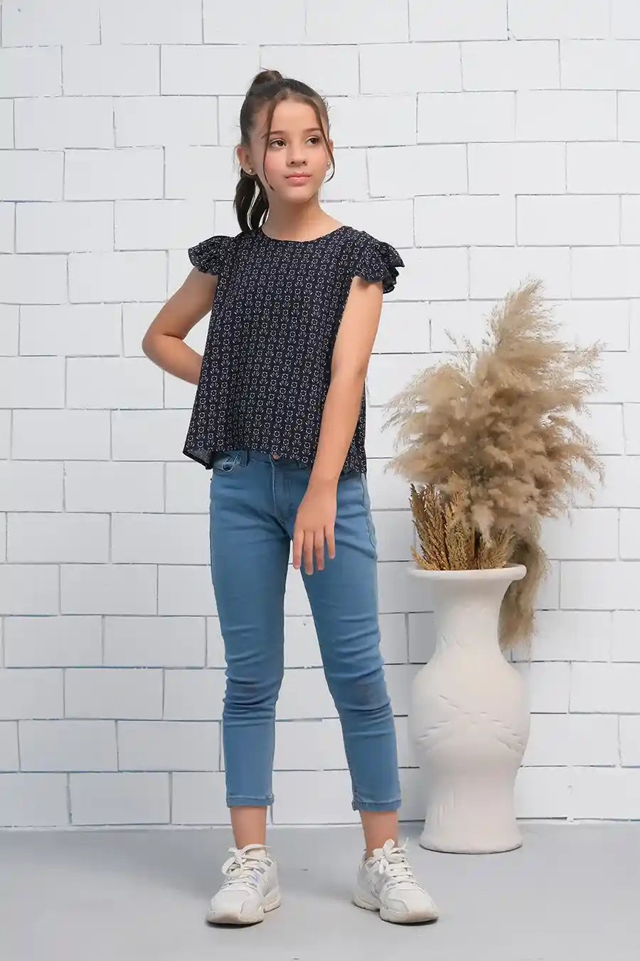 Girls Black Ruffle Armhole Floral Pattern Print Top