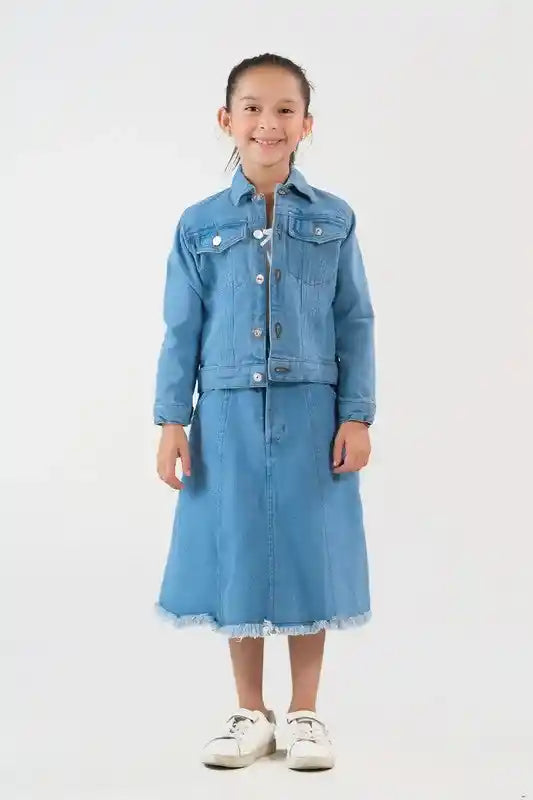 This light wash denim jacket is perfect for girls looking for a stylish and versatile addition to their wardrobe. Made with durable denim material, this jacket will keep you warm and add a touch of edge to any outfit. The timeless design and comfortable fit make it a must-have for any fashion-forward girl.