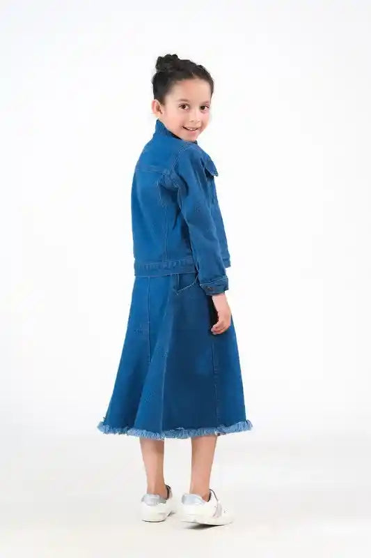 This medium wash denim jacket is perfect for girls looking for a stylish and versatile addition to their wardrobe. Made with durable denim material, this jacket will keep you warm and add a touch of edge to any outfit. The timeless design and comfortable fit make it a must-have for any fashion-forward girl.