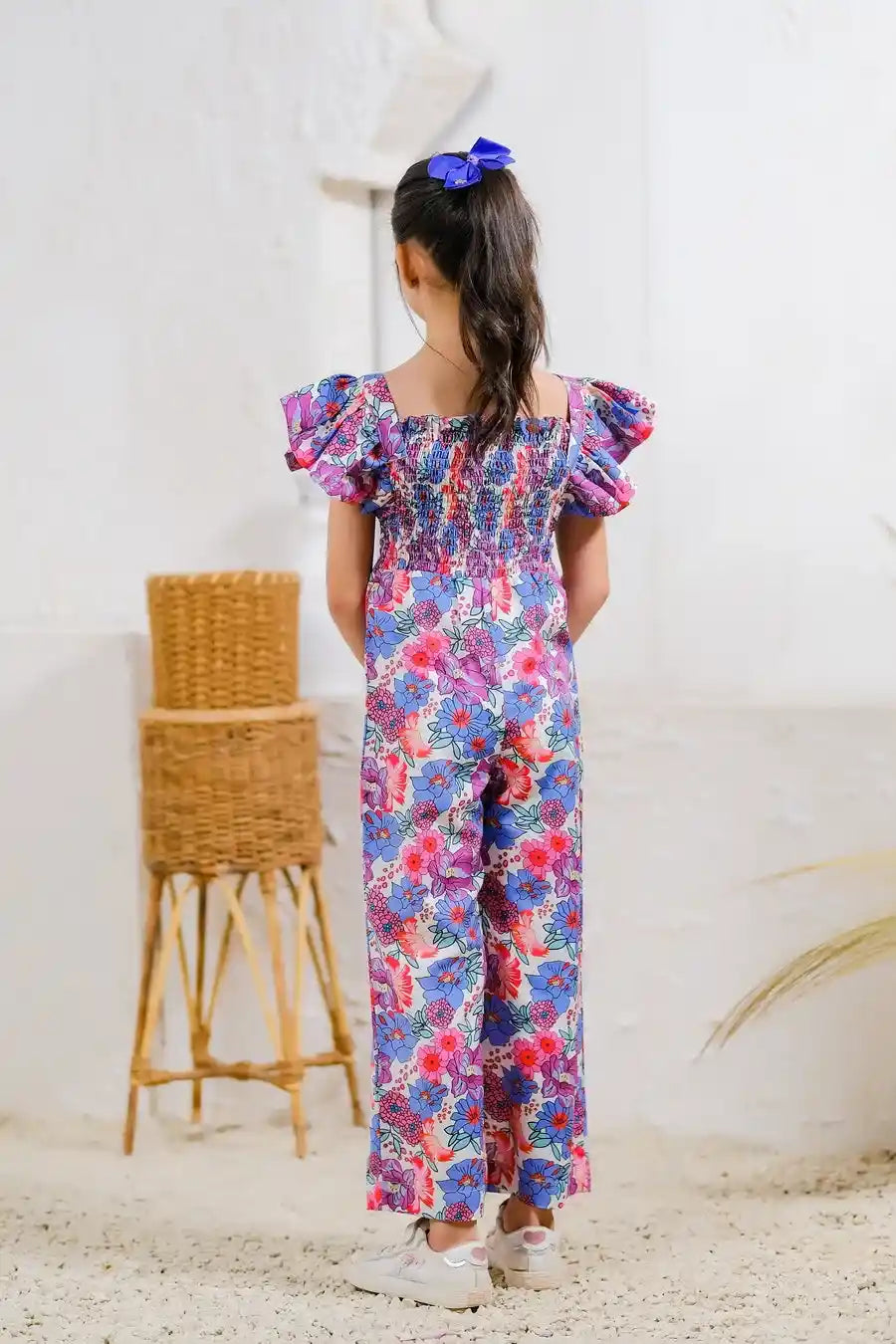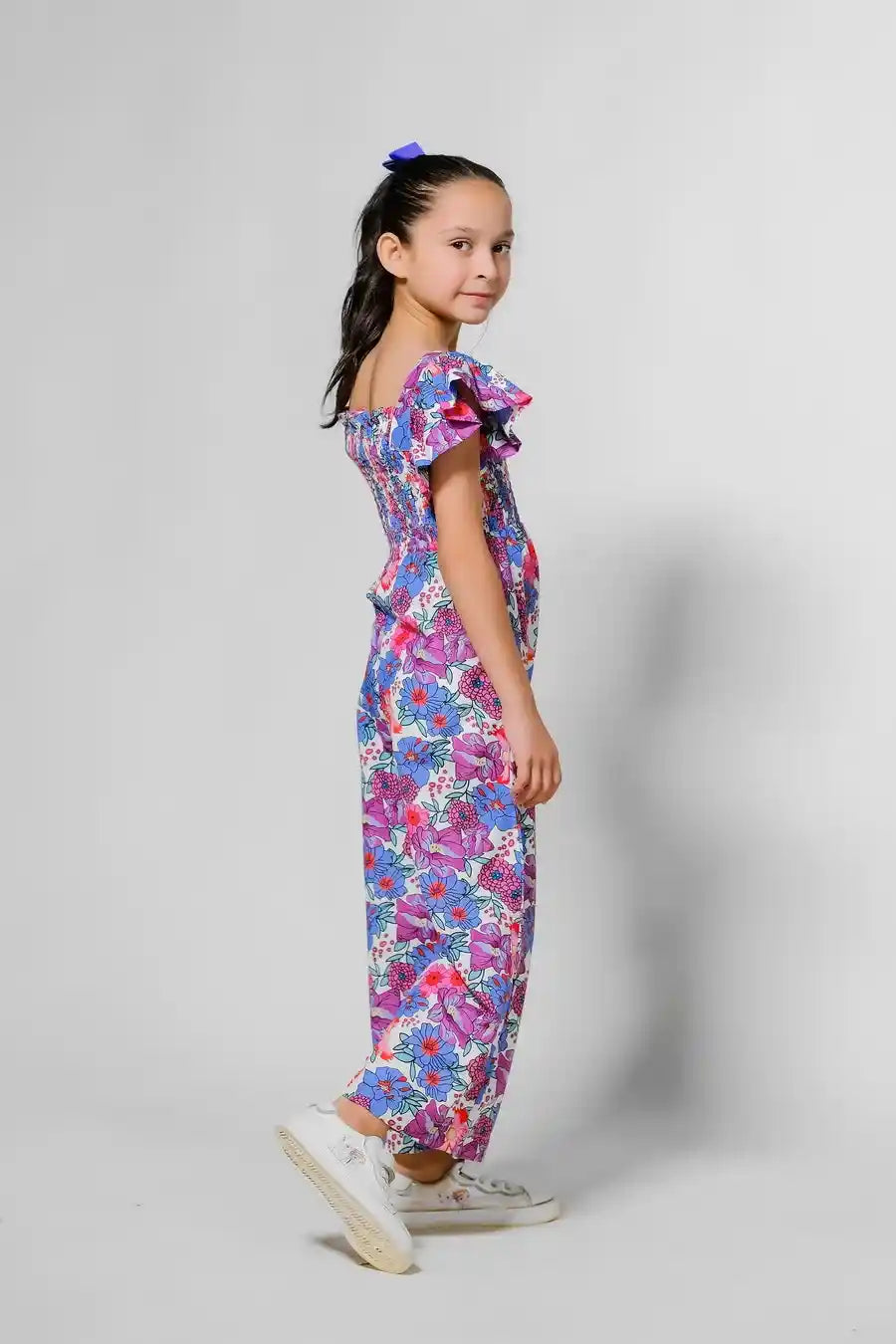 Step into a world of vibrant colors with the Floral Fantasy Jumpsuit. This playful outfit features a lively floral pattern in shades of purple, pink, and blue. The stretchy smocked bodice and wide-leg pants provide both comfort and style for endless twirls and fun.
