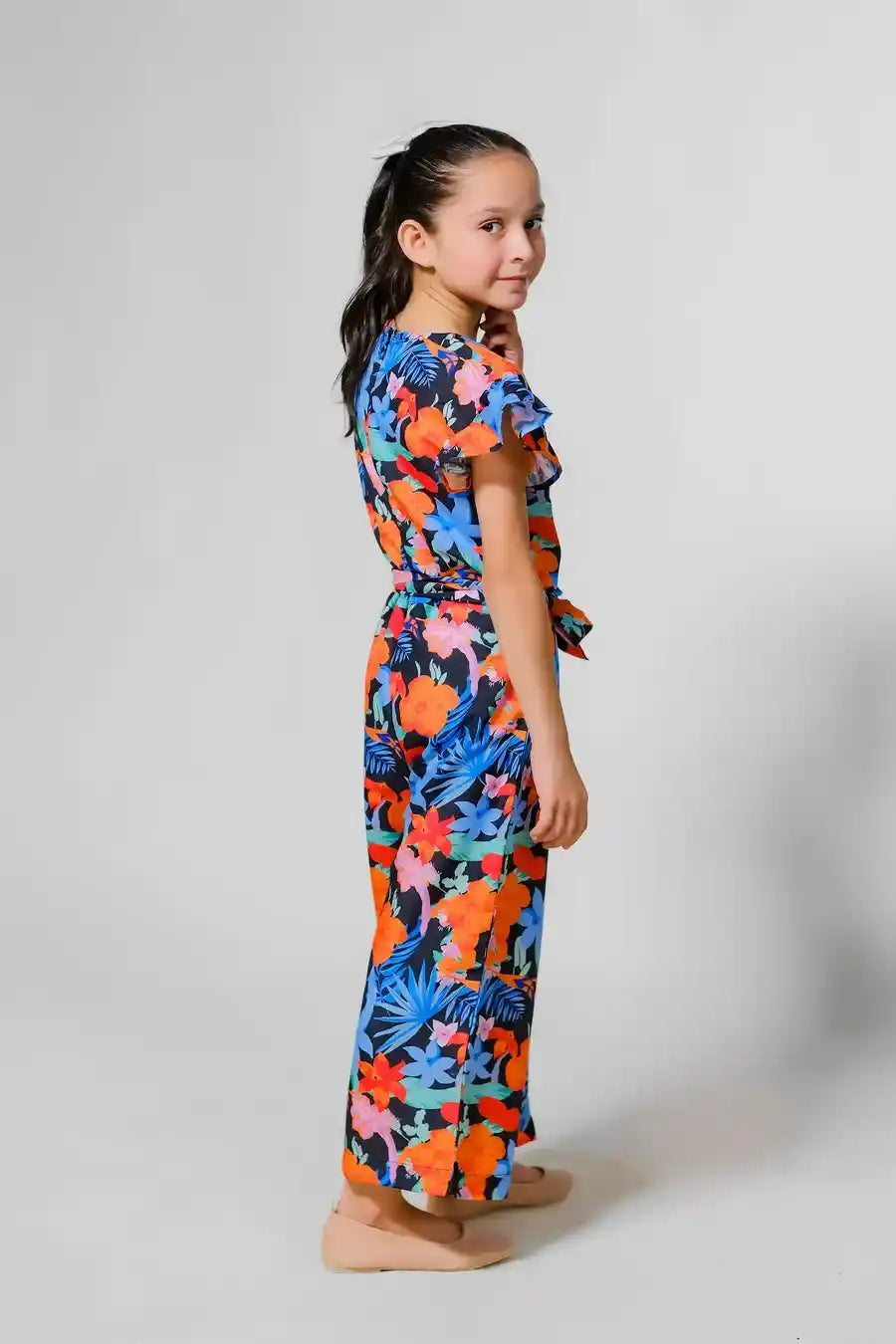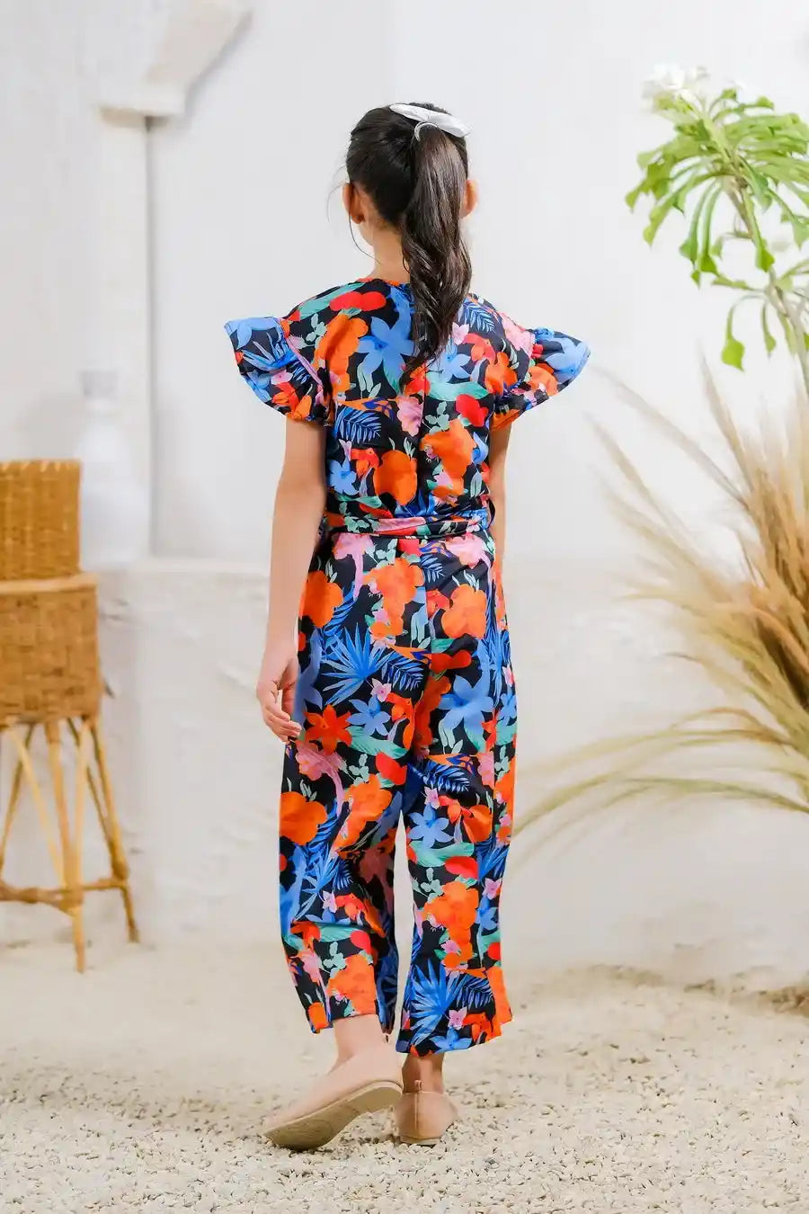 Capture the essence of a tropical night with the Midnight Tropics Jumpsuit. The deep, dark background is accentuated with vivid orange and blue floral patterns, making it an eye-catching choice for any occasion. The comfortable fabric and stylish design will keep your little one feeling both fashionable and free.