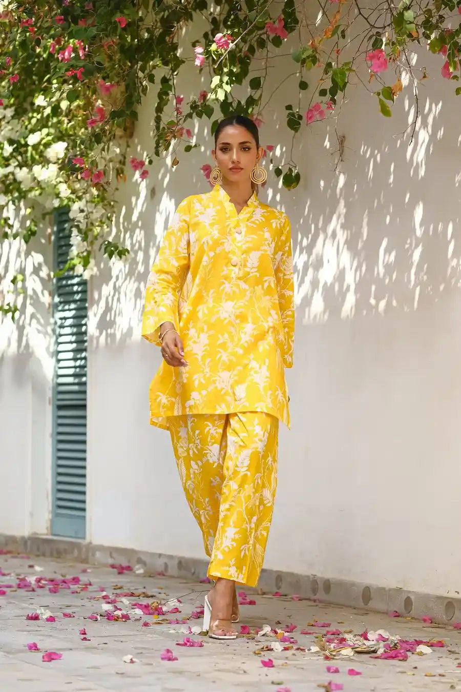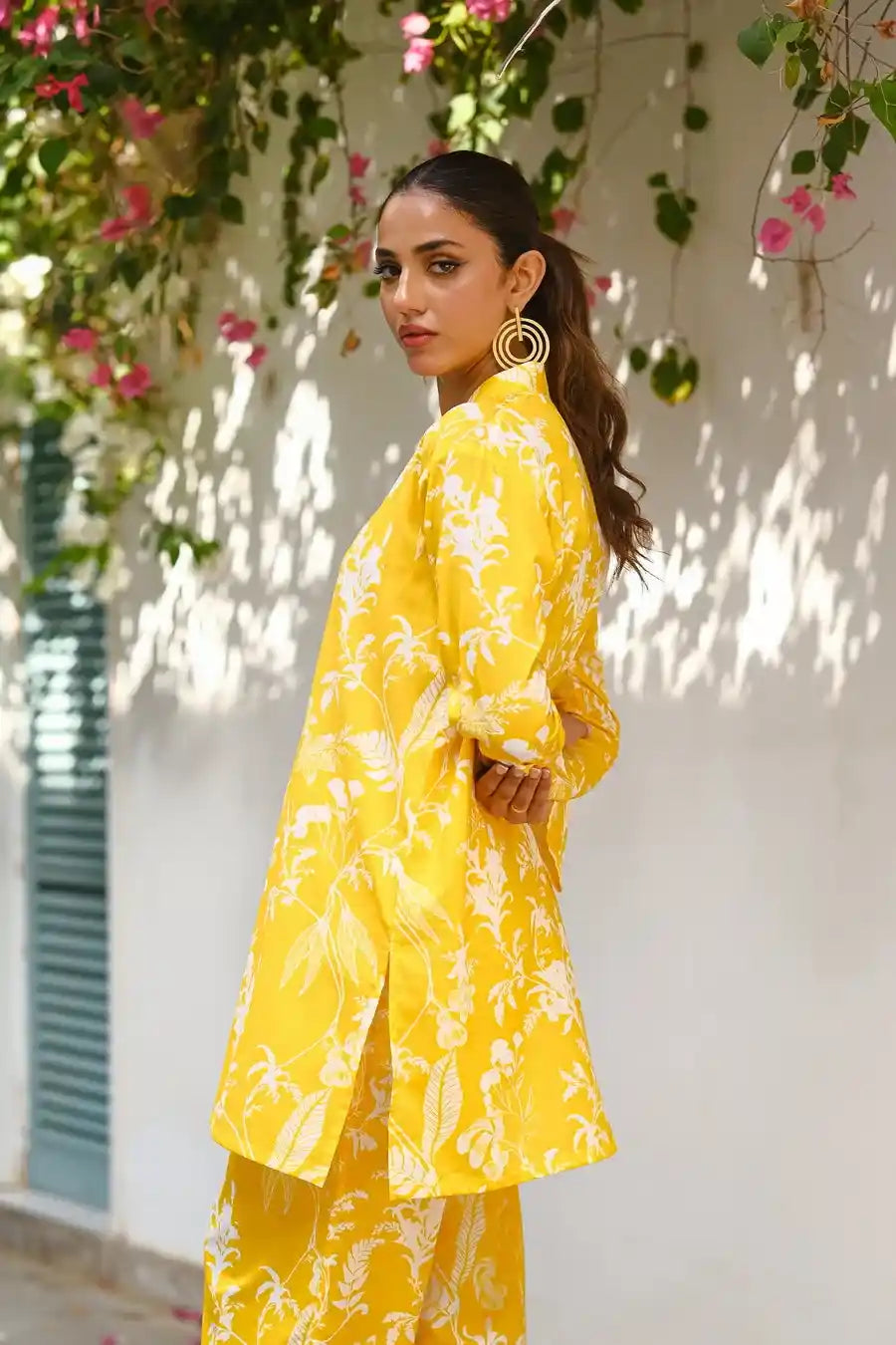 This mellow yellow cotton lawn outfit with a white overall print offers a relaxed and effortless summer style. The soft fabric and comfortable fit make it perfect for everyday wear.