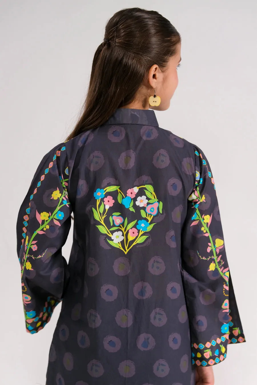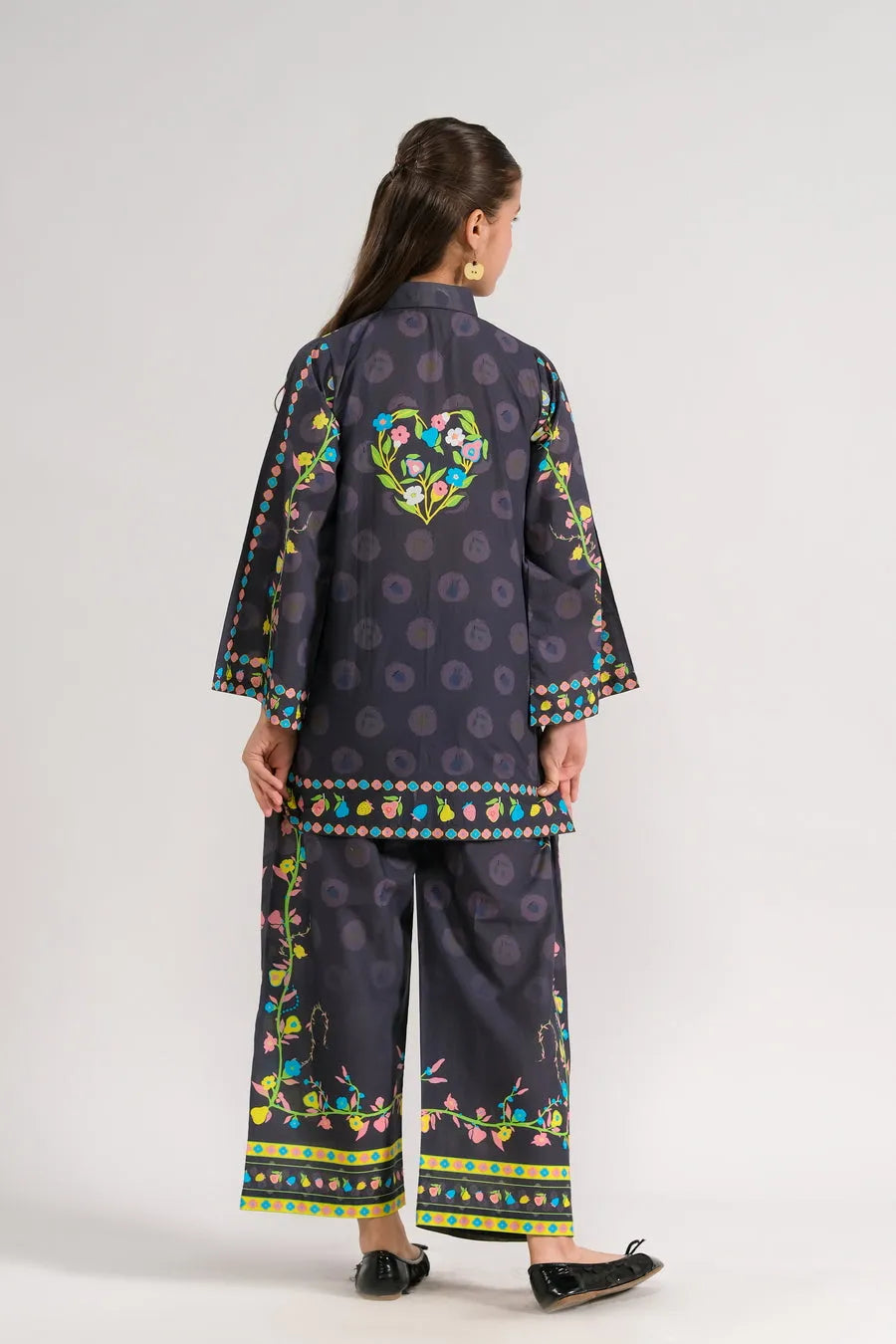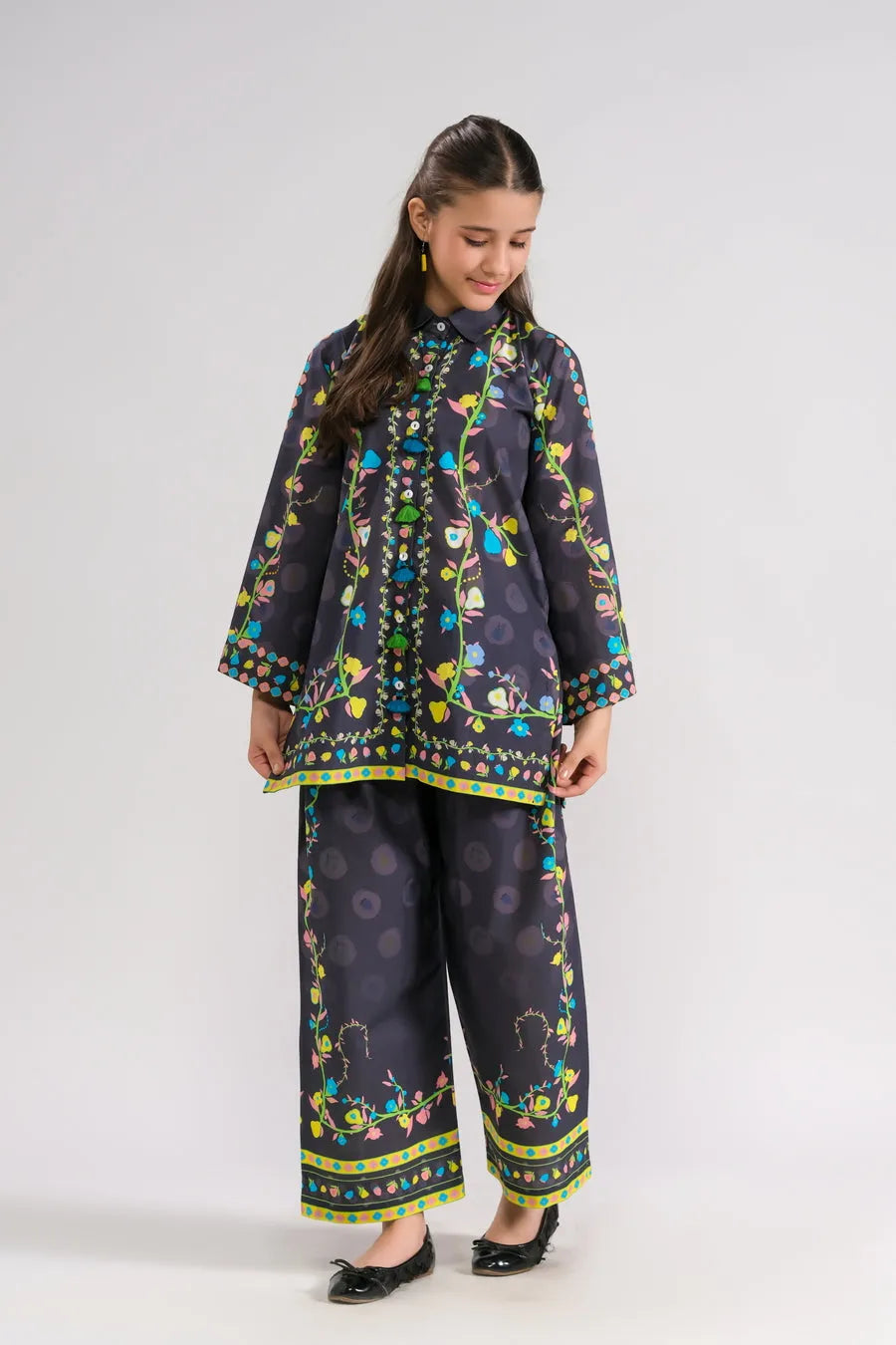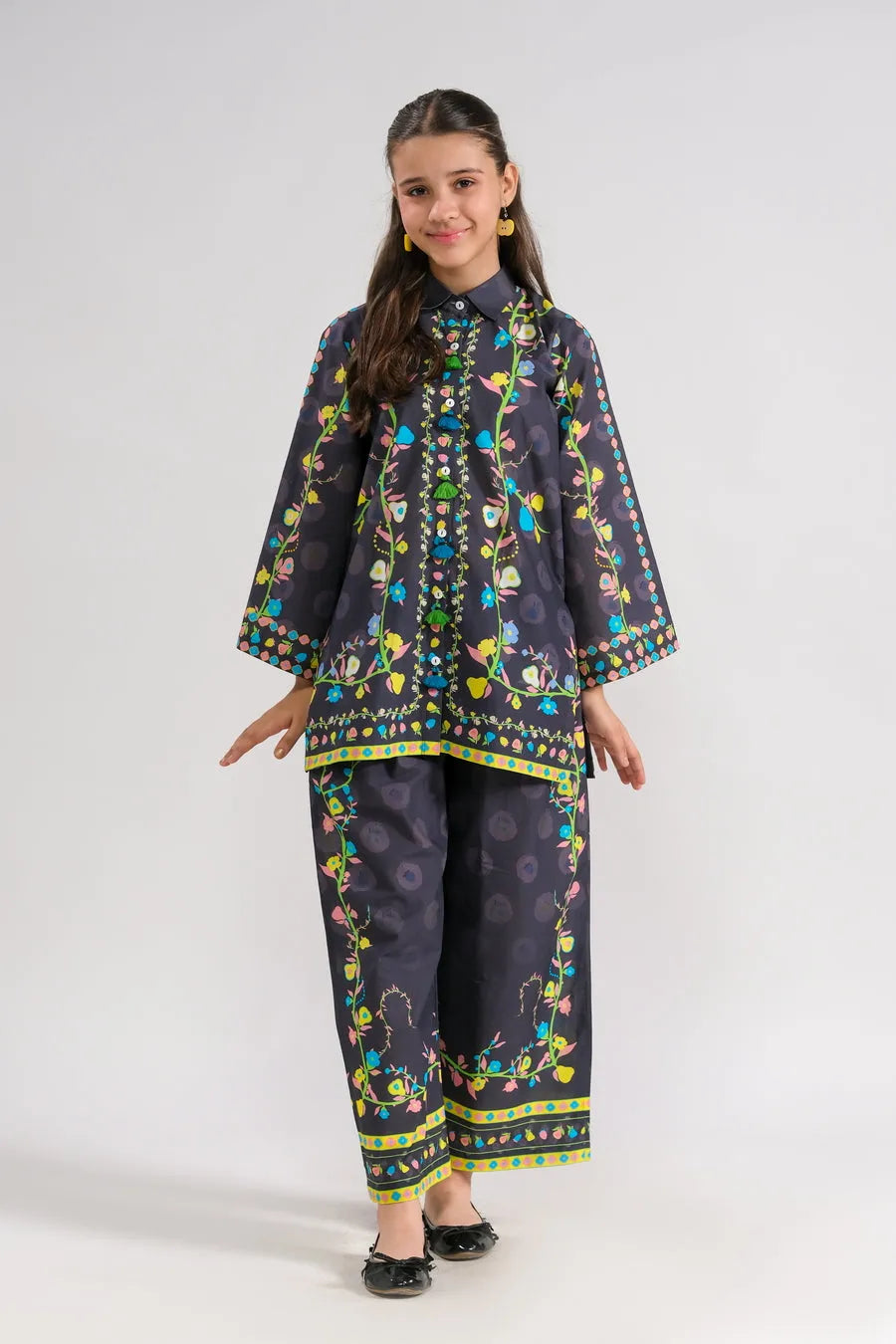 This stylish two-piece set features a vibrant floral print top in dark hues, embellished with colorful details and buttons. Paired with matching pants, it creates a chic and fun outfit that’s perfect for celebrations, making sure your little one looks fabulous!
