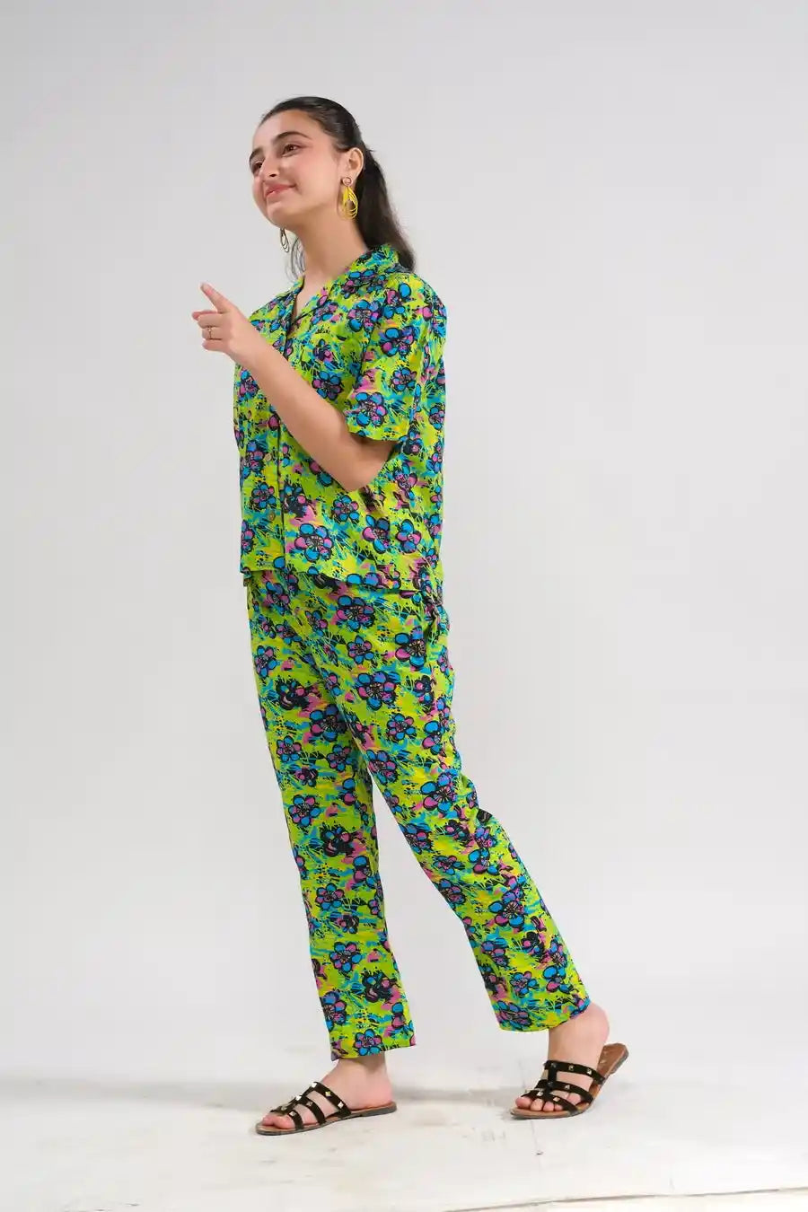 Stand out in this striking neon green co-ord set featuring abstract floral prints. Designed for energetic kids with a love for bold fashion, it ensures they make a lively statement during playdates, parties, or any fun summer adventure.