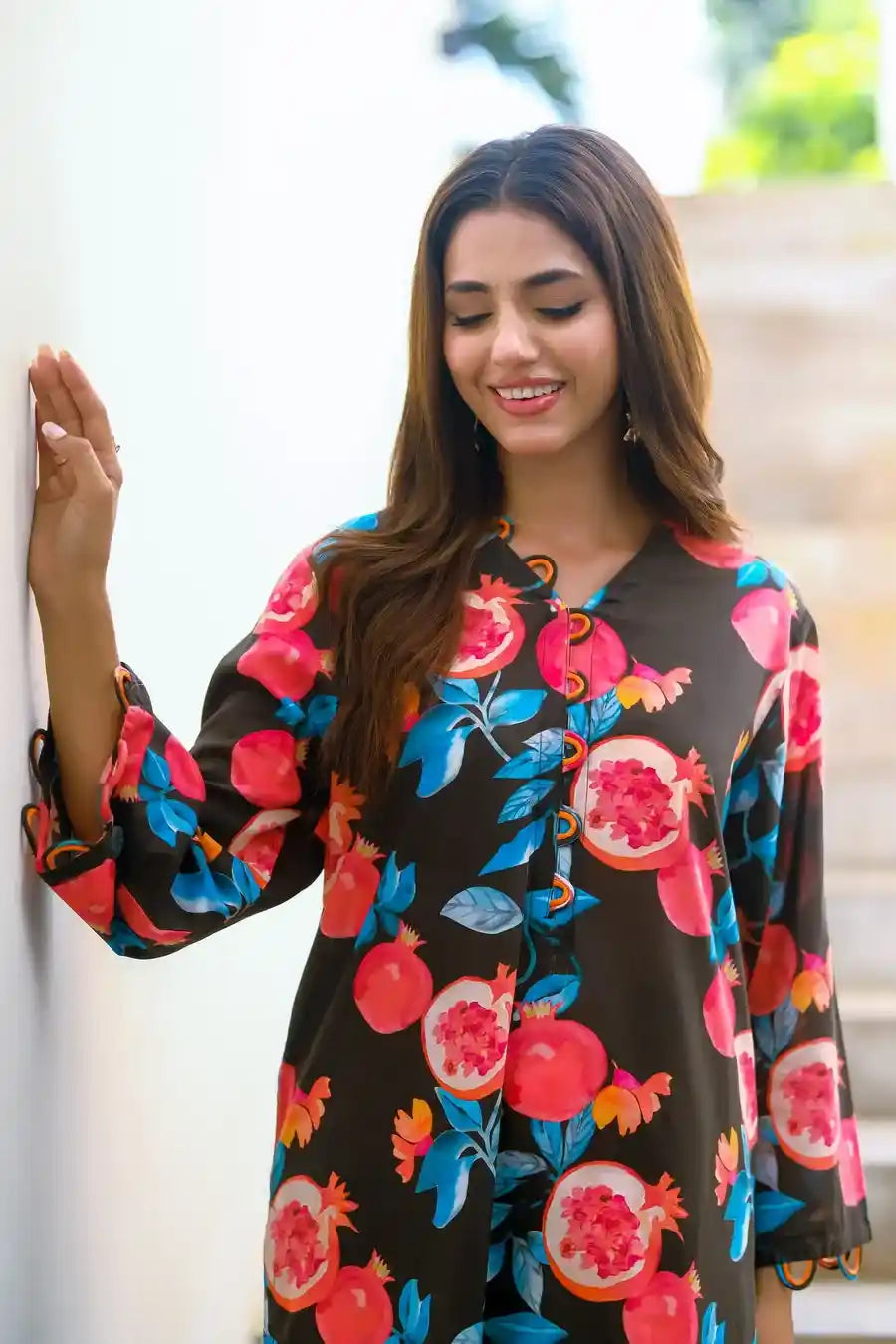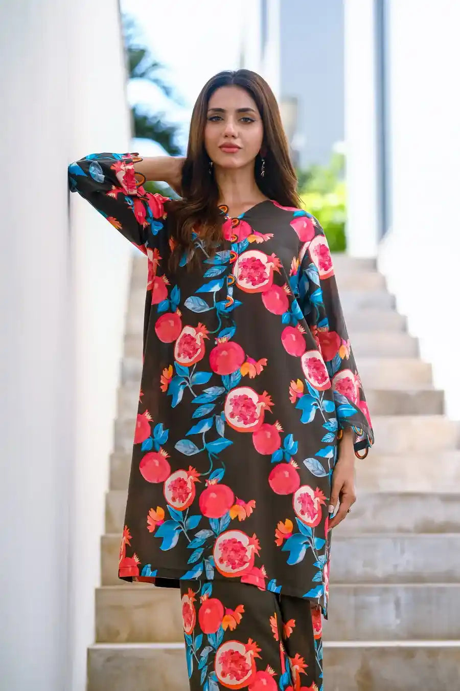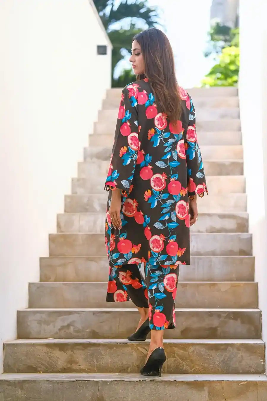 This chic black two-piece cotton lawn outfit features vibrant pink pomegranate prints. Perfect for summer, it combines style and comfort with a relaxed-fit top and matching bottoms. Ideal for casual outings or lounging, this playful yet elegant set adds a unique touch to your seasonal wardrobe.