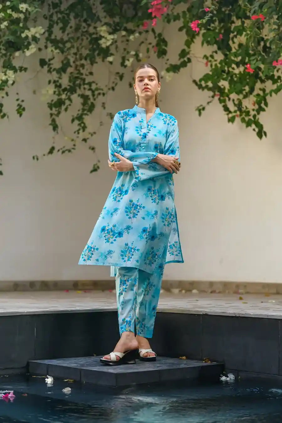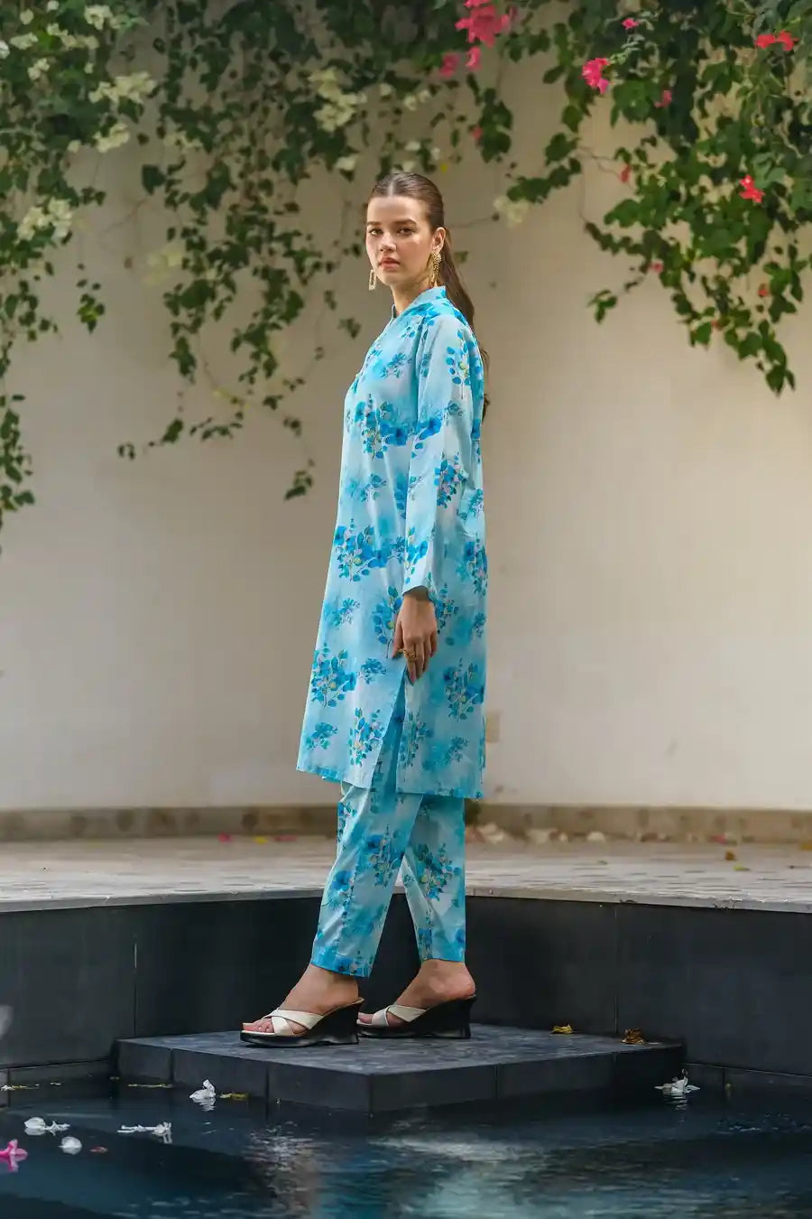 Evoking the tranquility of a summer seaside escape, this blue cotton lawn outfit features a calming print of blue floral bunches. The cool blue tones and comfortable fabric make it perfect for a refreshing summer look.