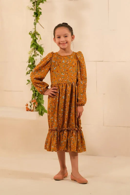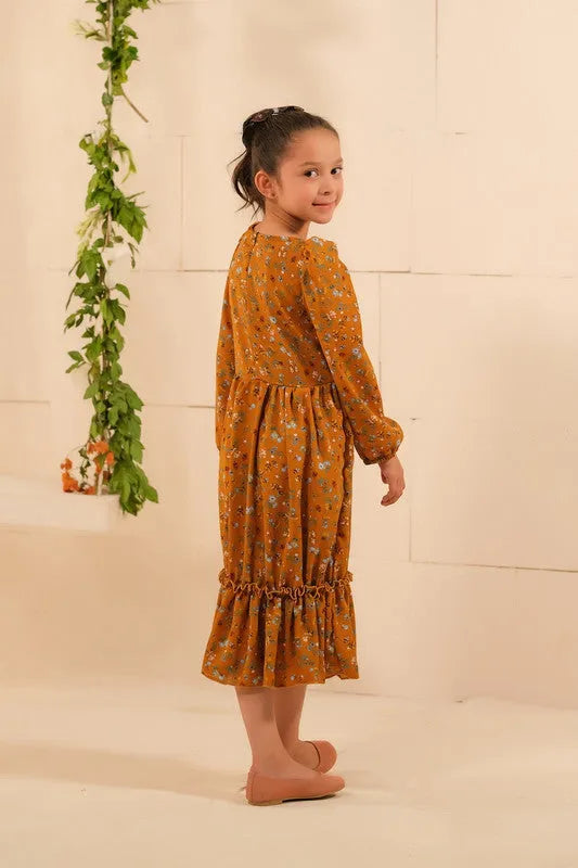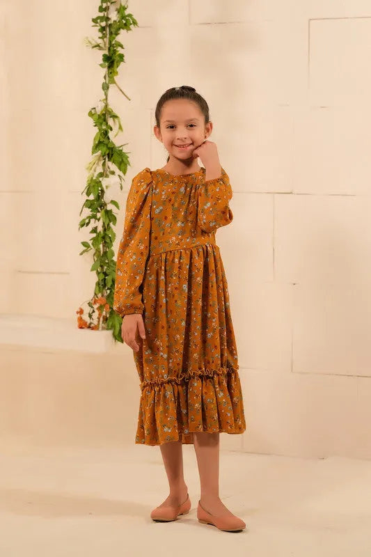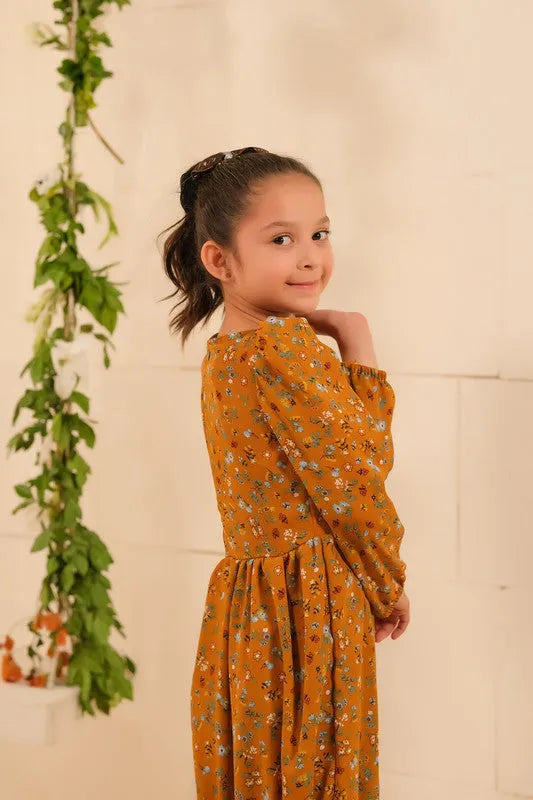 Mustard Blooms: Embrace the warm hues of nature with Mustard Blooms. This enchanting long dress, made from soft summer crepe, features a stunning floral design that effortlessly blends elegance and vibrancy. Get ready to bloom with style! Material: Soft Summer Crepe