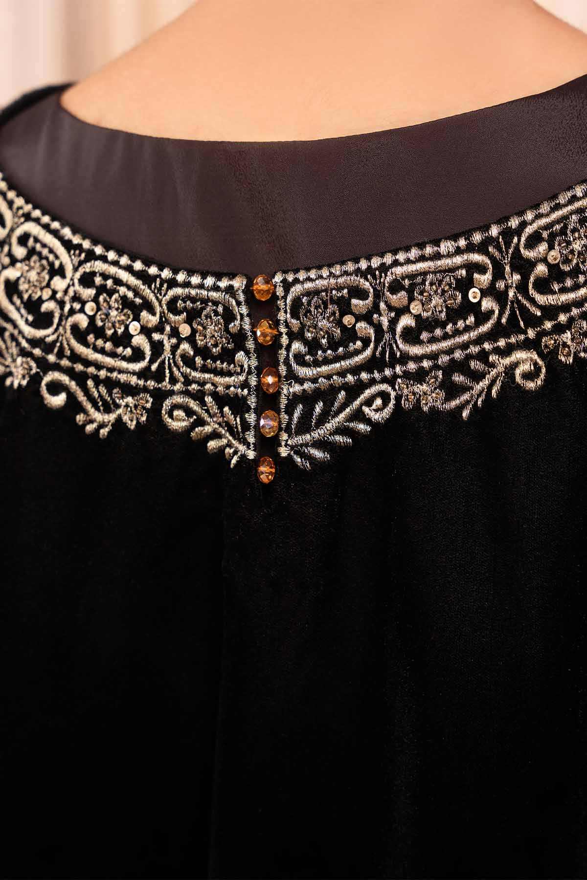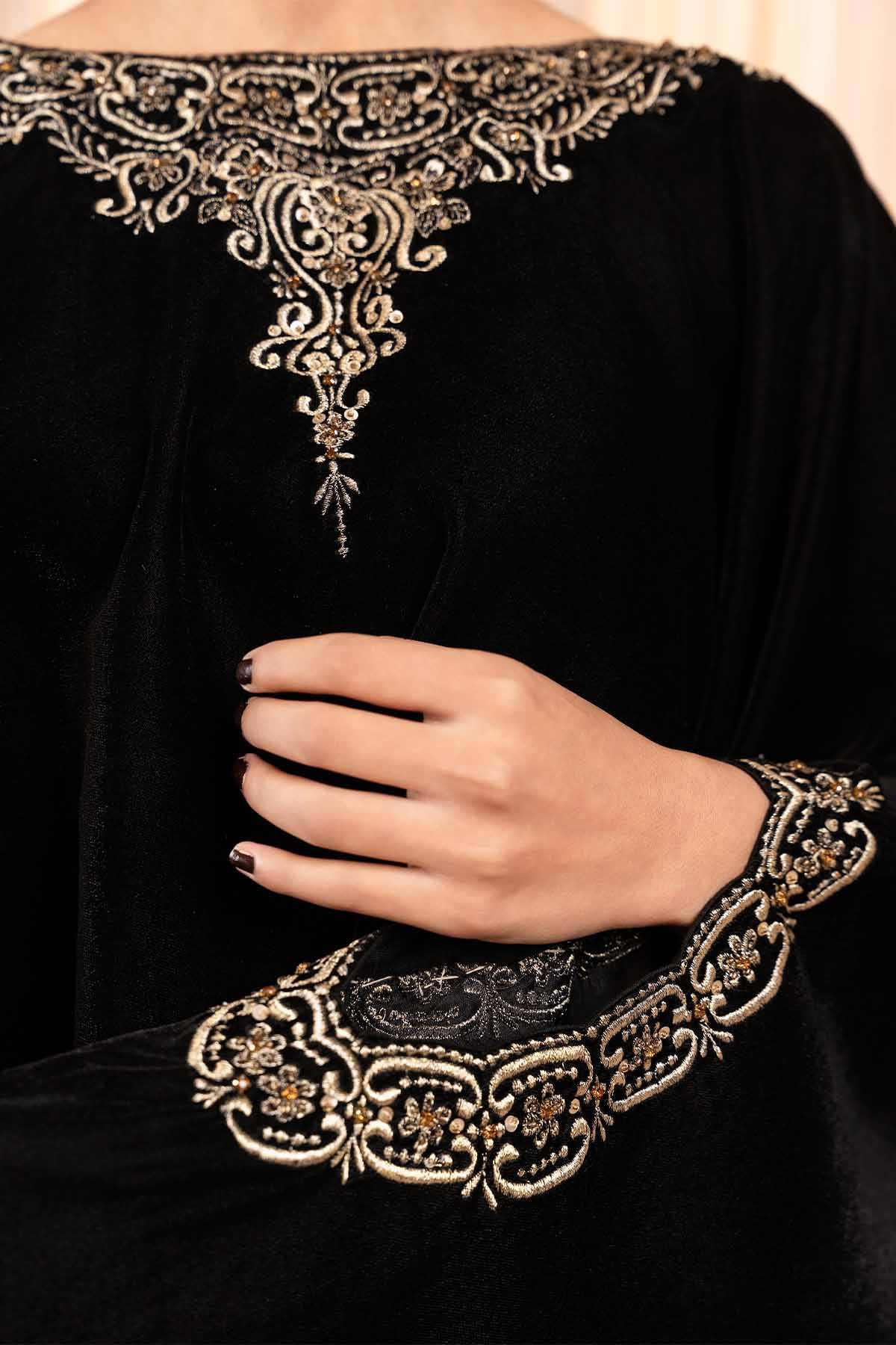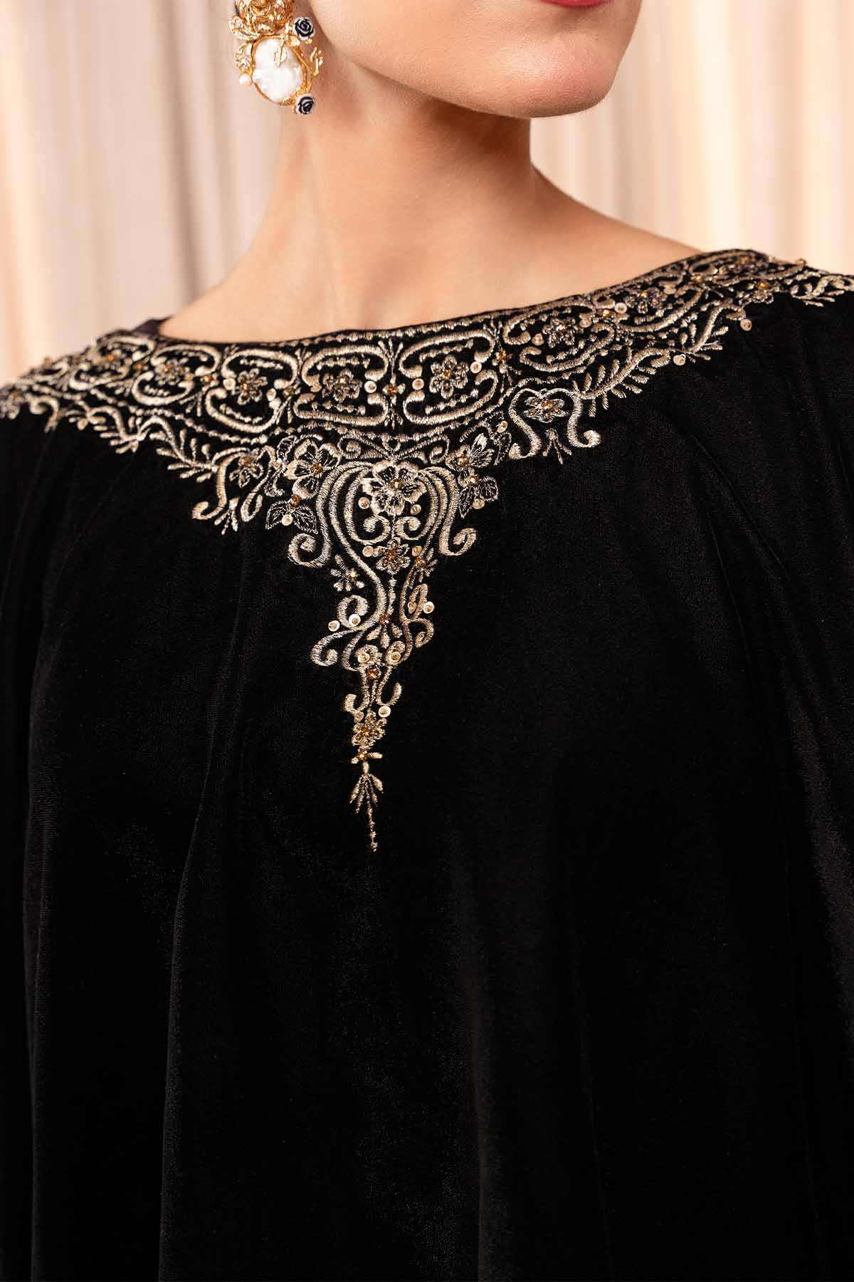 The shirt features a shawl like silhouette,made from luxurious micro 9000 velvet,a soft and plush fabric known for its smooth texture and subtle sheen.The floral embroidery at the neck & armhole is a mix of vibrant colors,with flowers delicately embroidered in a pattern that frames the face.This placement of embroidery gives the shirt a cohesive,thoughtful design while enhancing the neck & armholes with a soft,detailed touch.