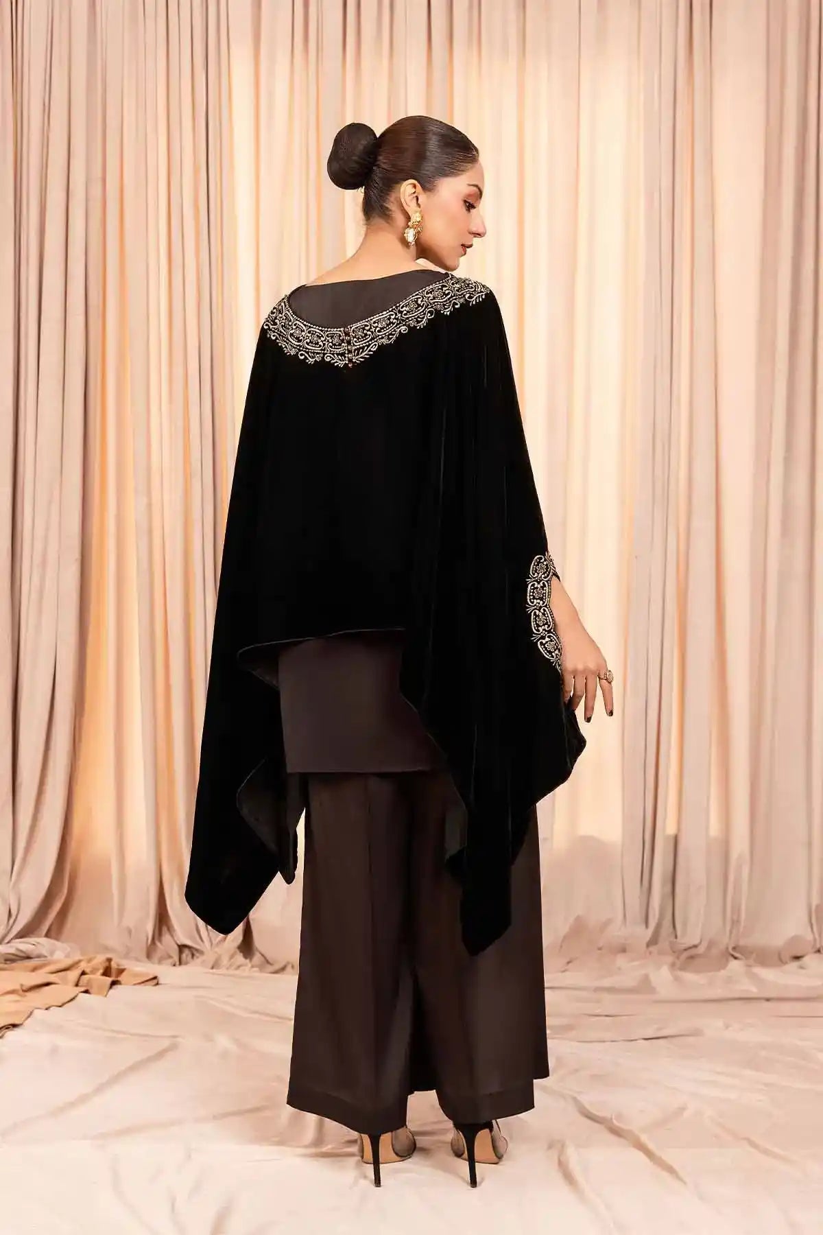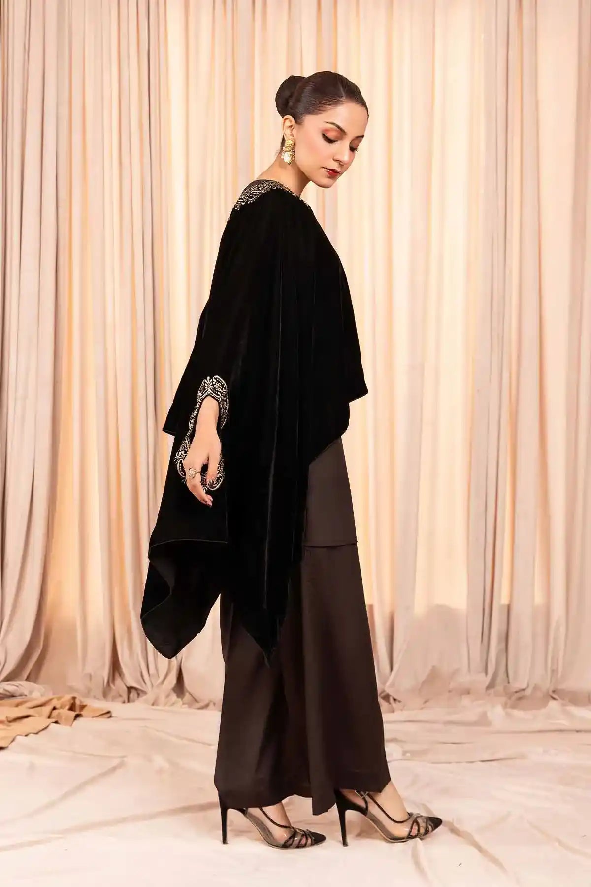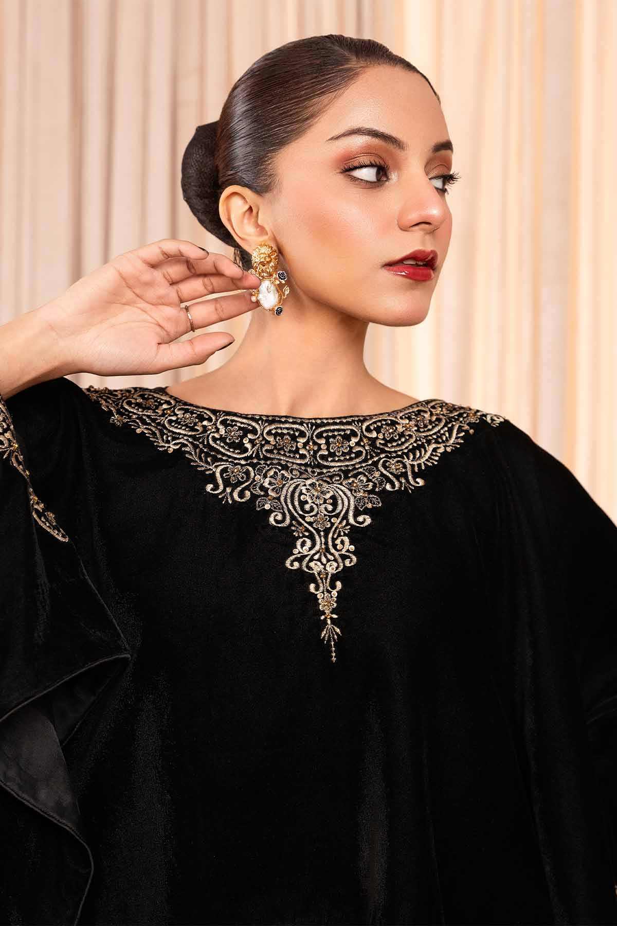 The shirt features a shawl like silhouette,made from luxurious micro 9000 velvet,a soft and plush fabric known for its smooth texture and subtle sheen.The floral embroidery at the neck & armhole is a mix of vibrant colors,with flowers delicately embroidered in a pattern that frames the face.This placement of embroidery gives the shirt a cohesive,thoughtful design while enhancing the neck & armholes with a soft,detailed touch.
